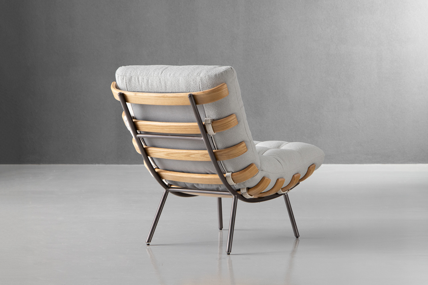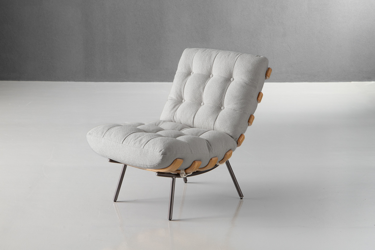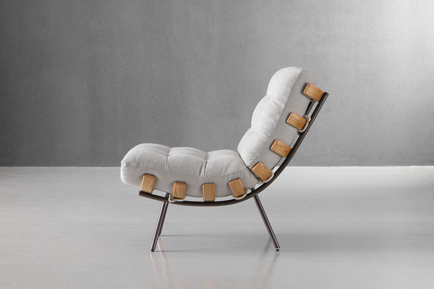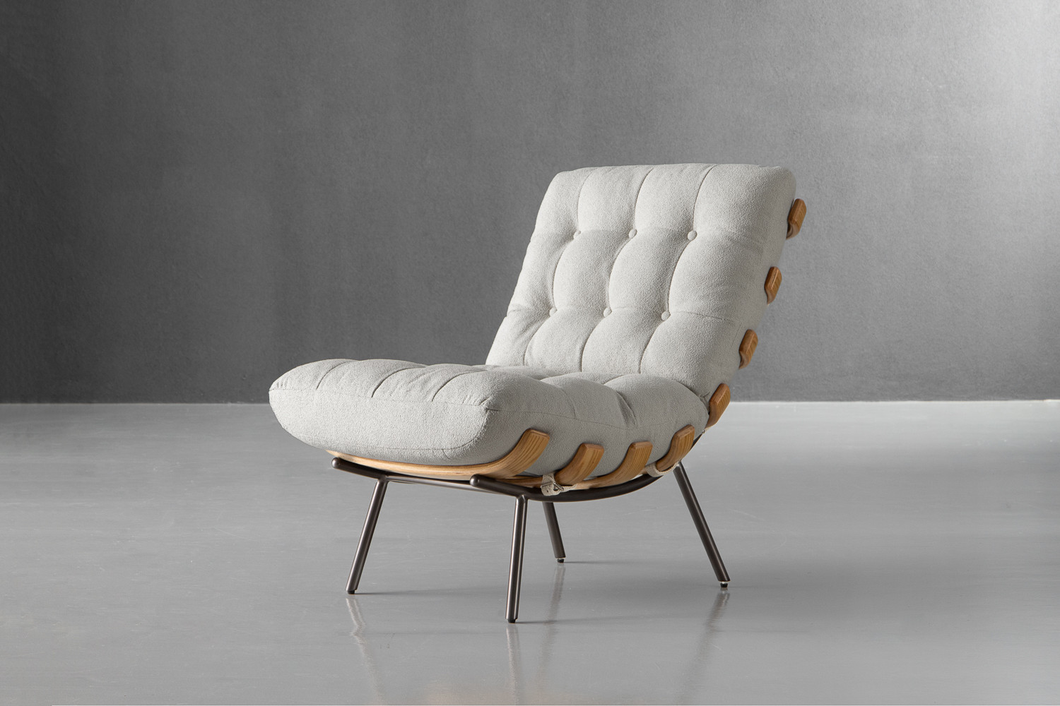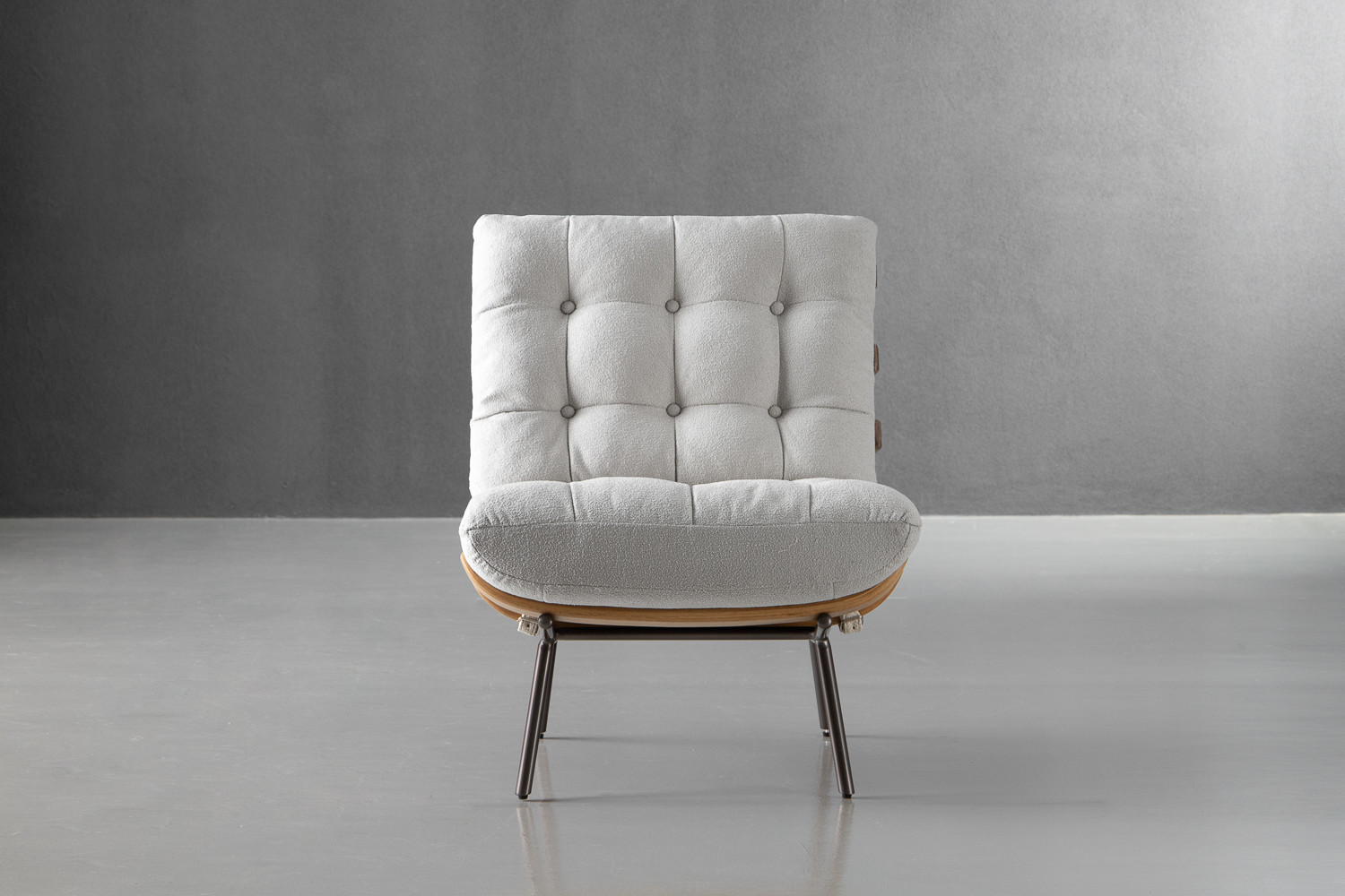 The Fidel Chair brings the perfect fusion of mid-century elegance and modern craftsmanship to your living room. This iconic chair features polyester fabric cushions with biscuit tufted detailing, creating a luxurious and comfortable seating experience. Supported by solid mild steel legs and enhanced by oak wood veneers, the Fidel Chair boasts a timeless silhouette that serves as a statement piece in any space. With bent wood-ripped frame details and buckling strap fixings, this chair combines stylish design with functional beauty, making it a standout addition to contemporary and classic interiors alike.