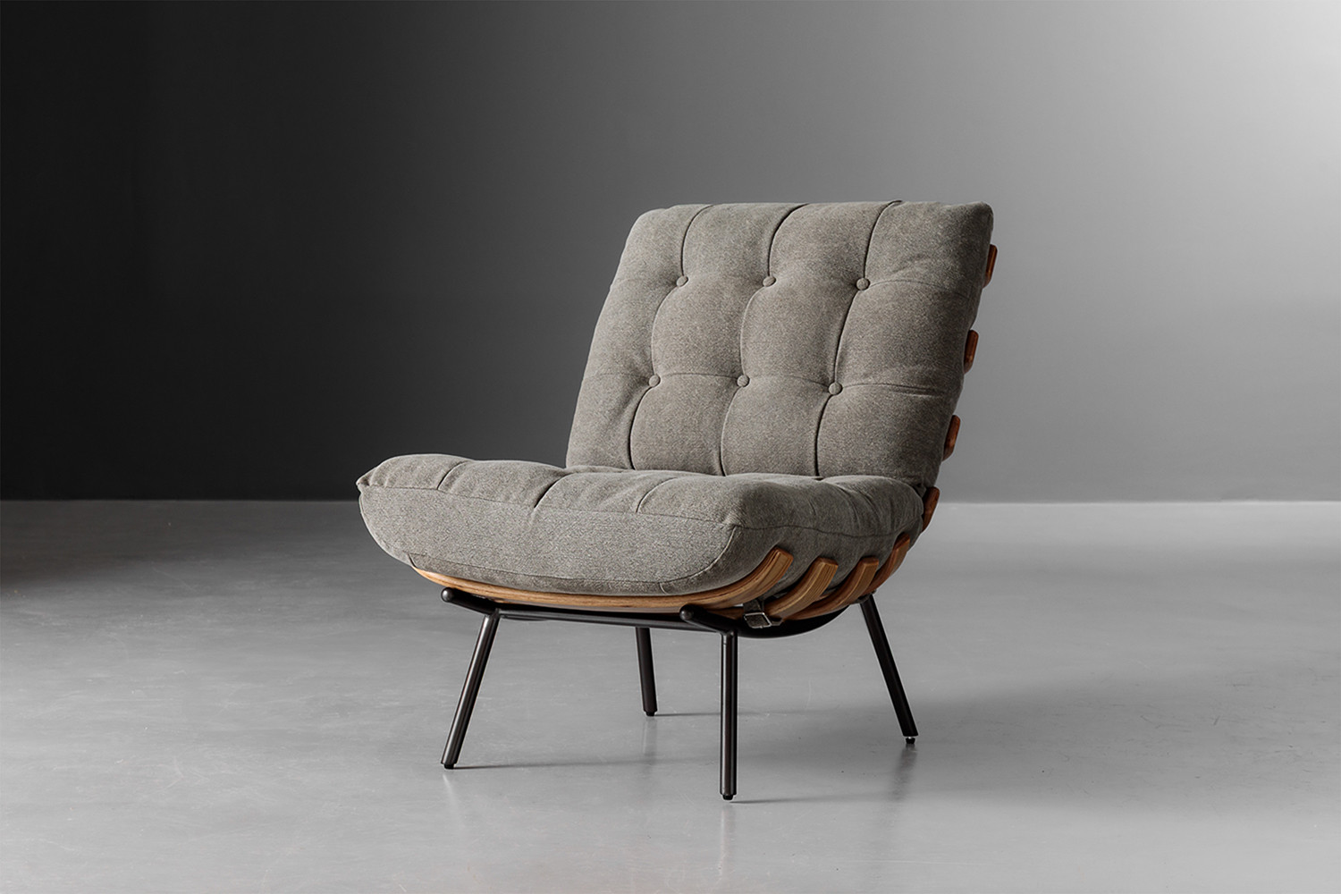 The Fidel Chair brings the perfect fusion of mid-century elegance and modern craftsmanship to your living room. This iconic chair features polyester fabric cushions with biscuit tufted detailing, creating a luxurious and comfortable seating experience. Supported by solid mild steel legs and enhanced by oak wood veneers, the Fidel Chair boasts a timeless silhouette that serves as a statement piece in any space. With bent wood-ripped frame details and buckling strap fixings, this chair combines stylish design with functional beauty, making it a standout addition to contemporary and classic interiors alike.