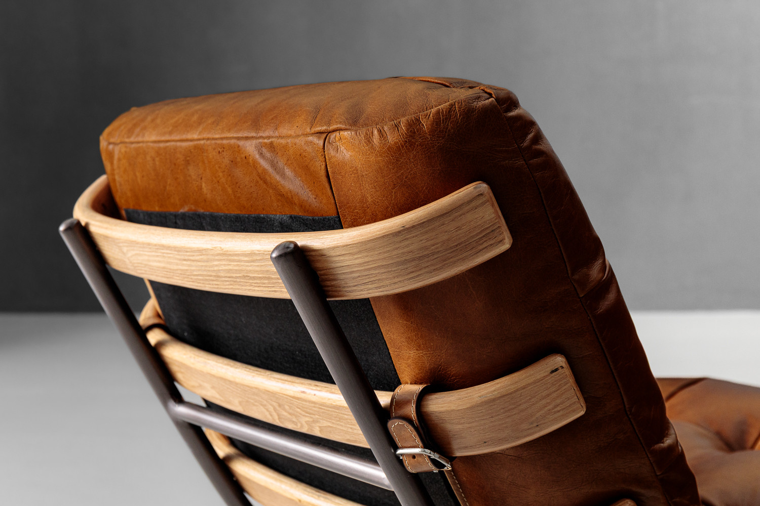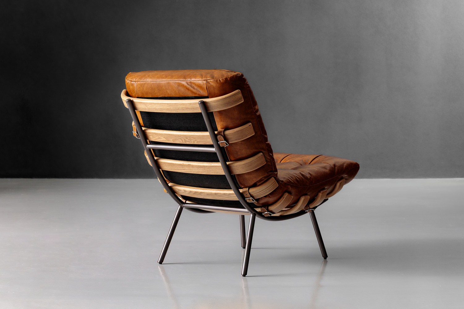 The Fidel Chair brings the perfect fusion of mid-century elegance and modern craftsmanship to your living room. This iconic chair features rich full grain leather cushions with biscuit tufted detailing, creating a luxurious and comfortable seating experience. Supported by solid mild steel legs and enhanced by oak wood veneers, the Fidel Chair boasts a timeless silhouette that serves as a statement piece in any space. With bent wood-ripped frame details and buckling strap fixings, this chair combines stylish design with functional beauty, making it a standout addition to contemporary and classic interiors alike.