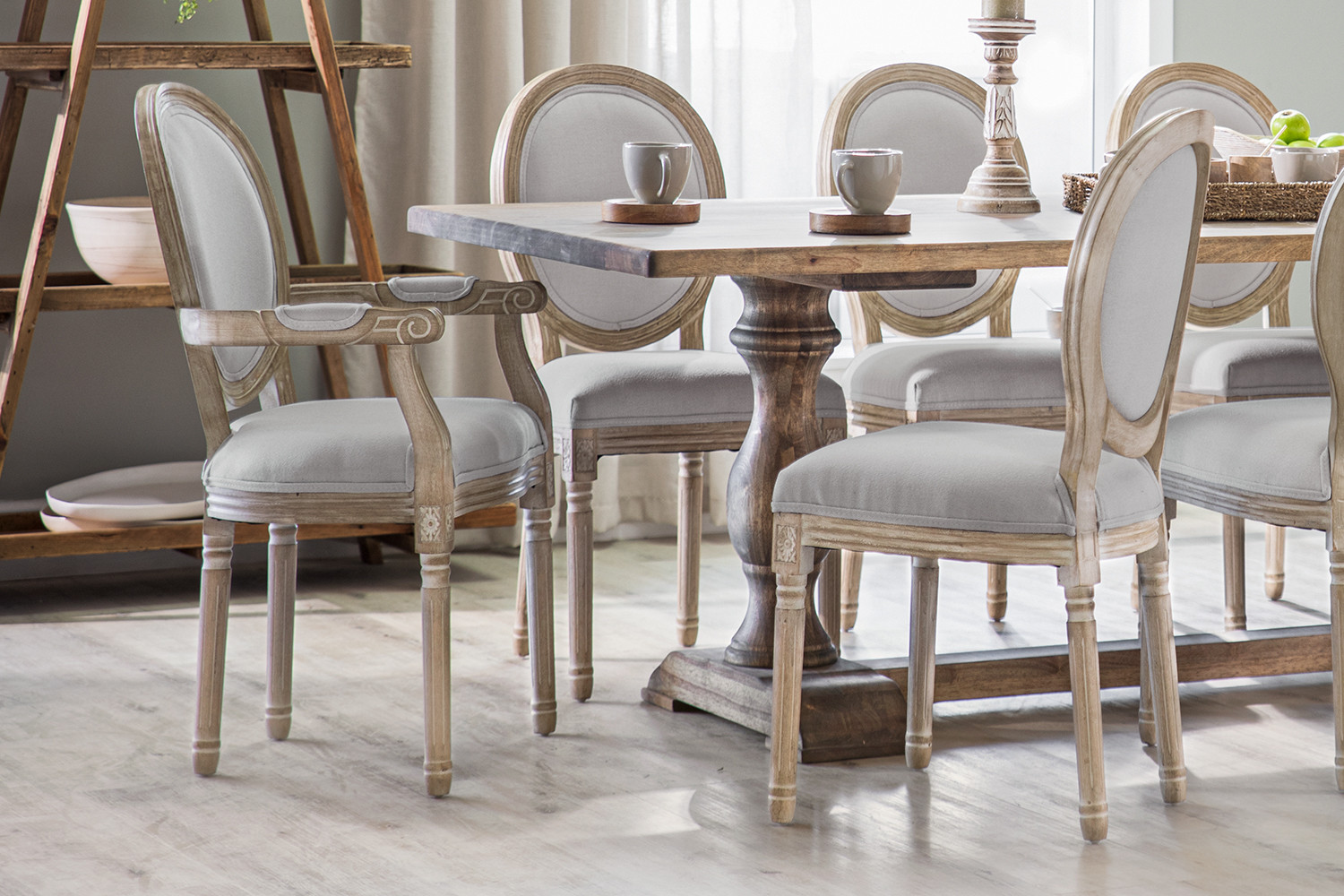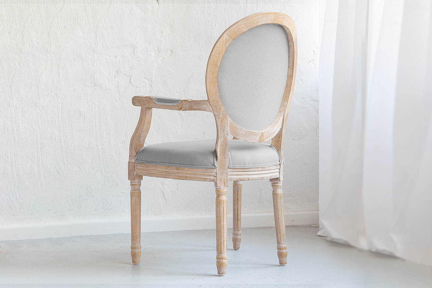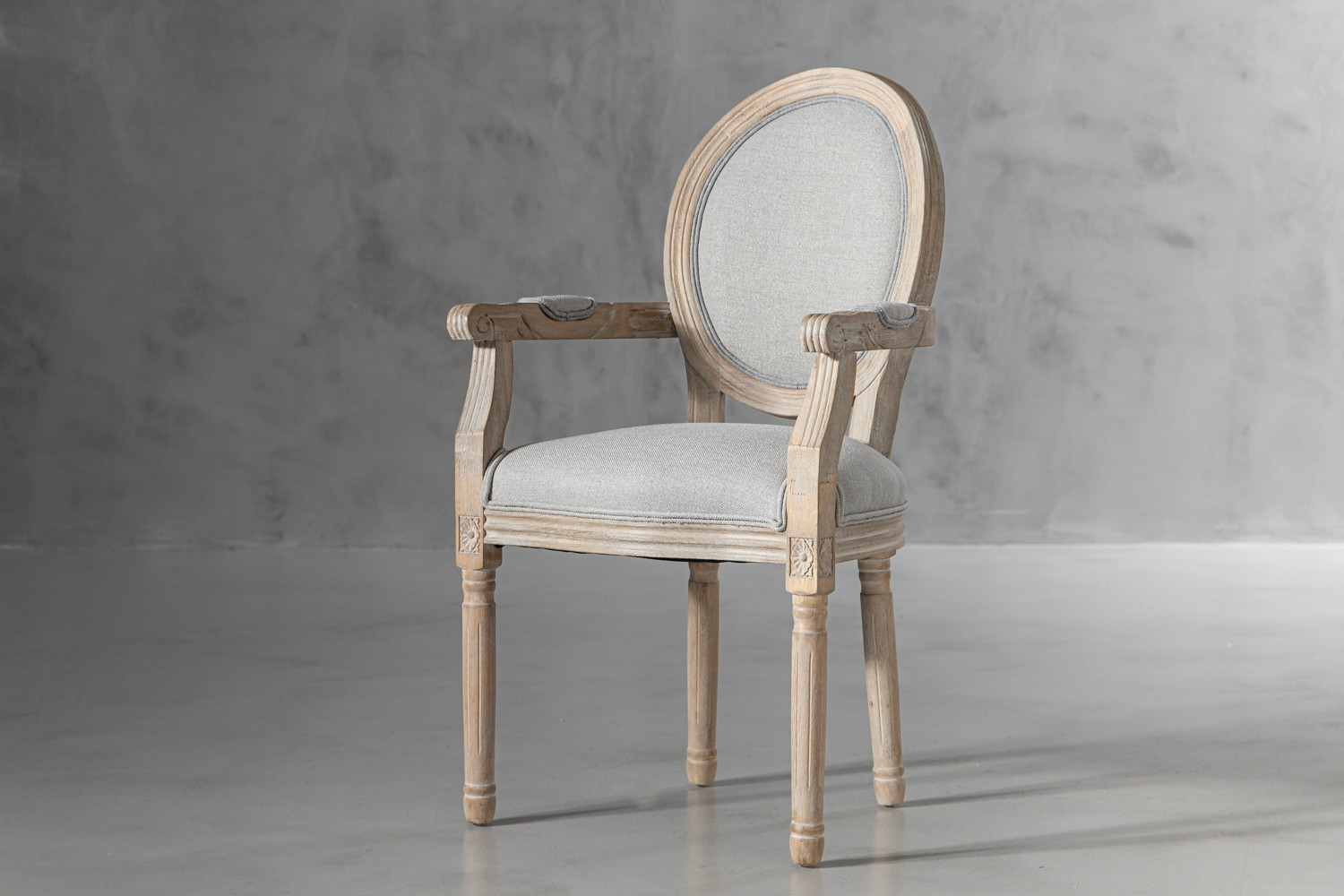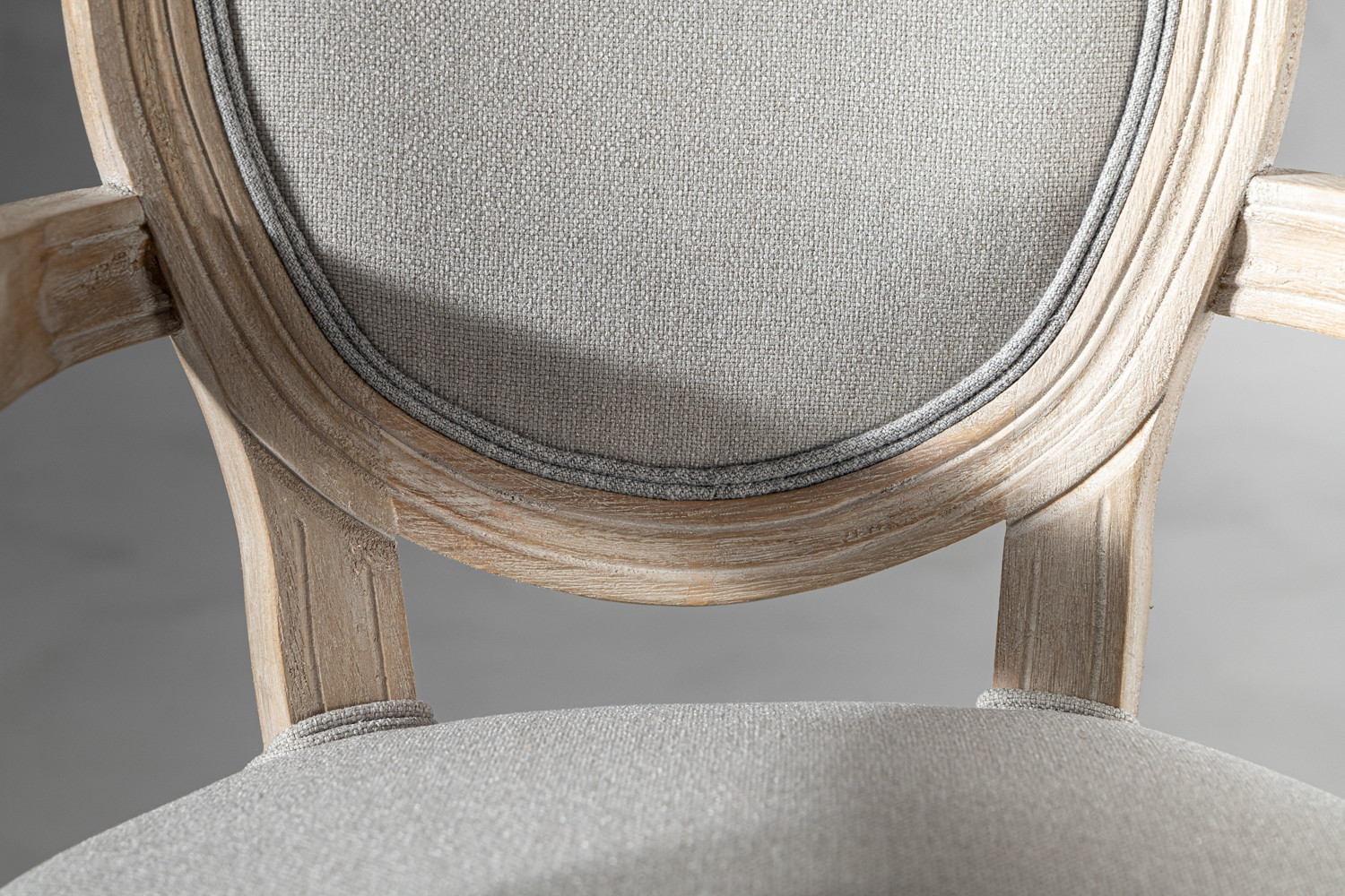 The classic French country style Olivia Dining Chair with Armrests is the epitome of calm, old-world elegance. Featuring a solid wood frame with carving detail and a brushed and lime-washed finish, distinctive medallion back, and padded fabric upholstery, this charming piece combines style, quality, and craftsmanship. Ideal both as a comfortable dining chair and an elegant occasional chair.