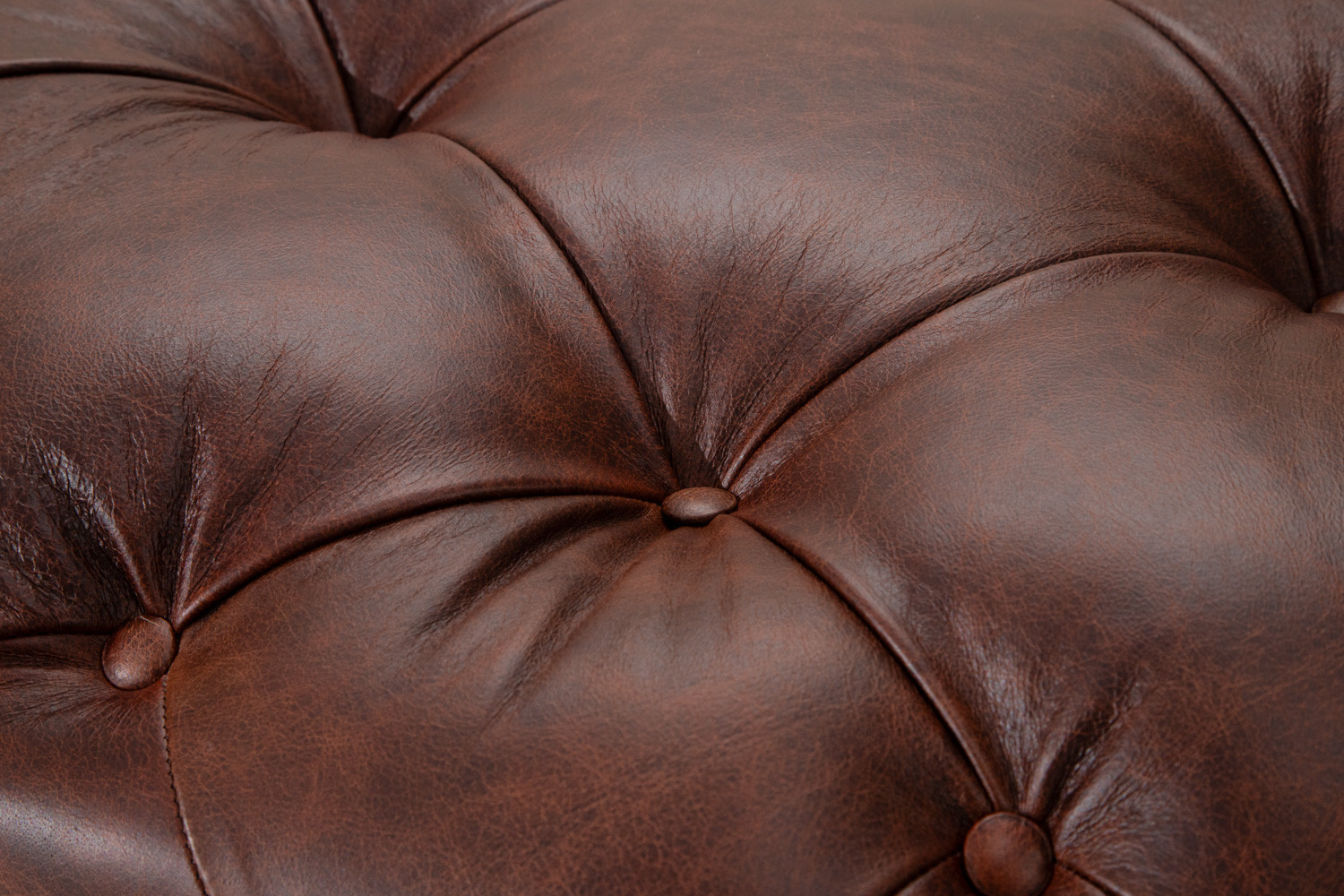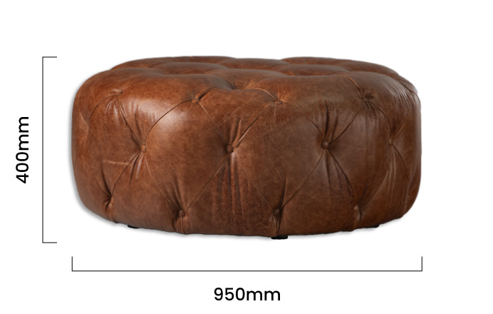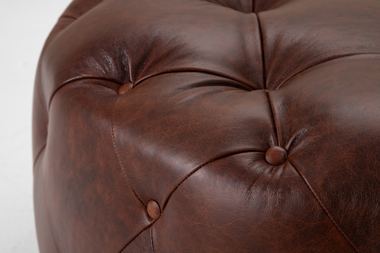 The Amara Round Leather Ottoman presents distinctive deep buttoned detailing, creating a welcoming presence in any living room. It’s firm, sumptuous, and carefully crafted with premium top grain leather.