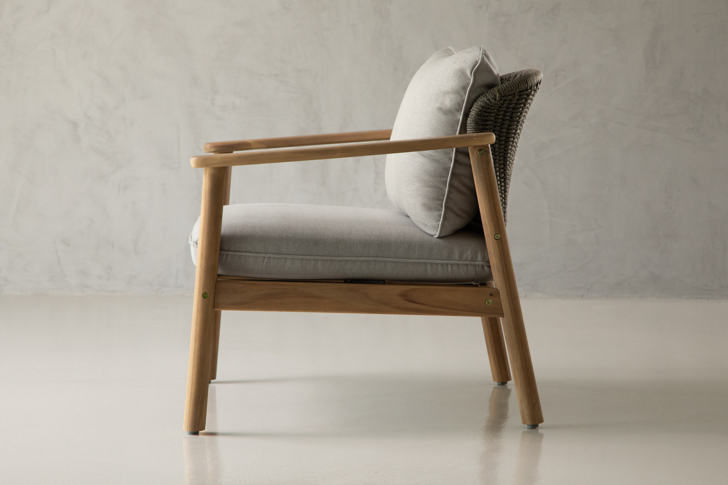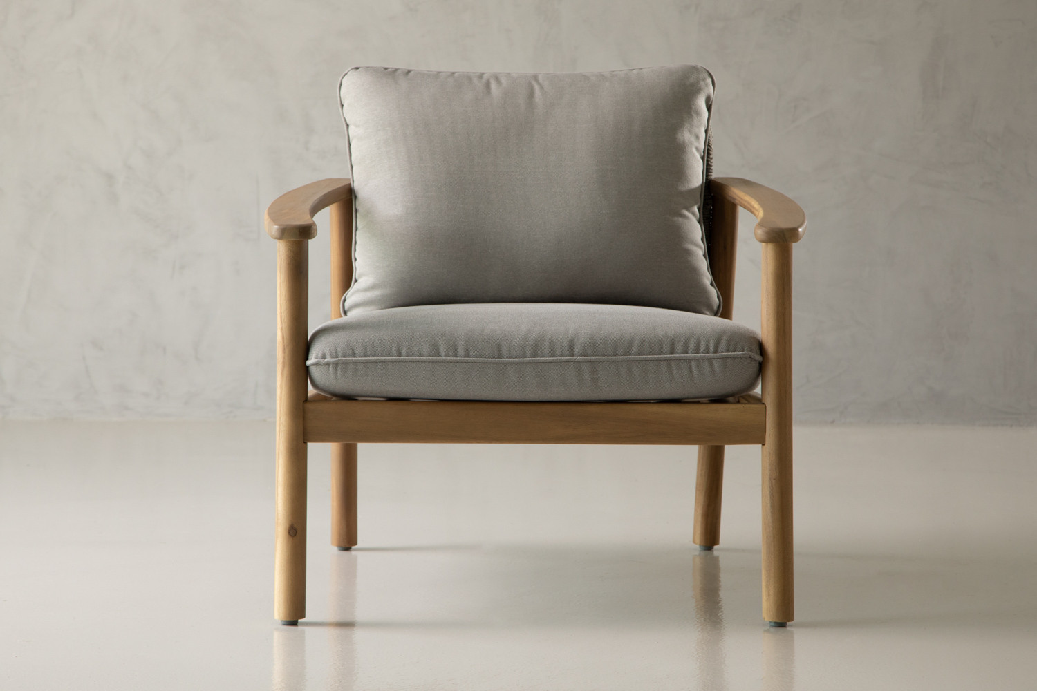 Sleek yet relaxed, the Mayfair Patio Armchair pairs gently rounded armrests with a beautifully balanced frame. The greywash finish lightens the acacia wood’s character, creating a modern, sun-soaked look that works in harmony with stone, linens, and greenery.