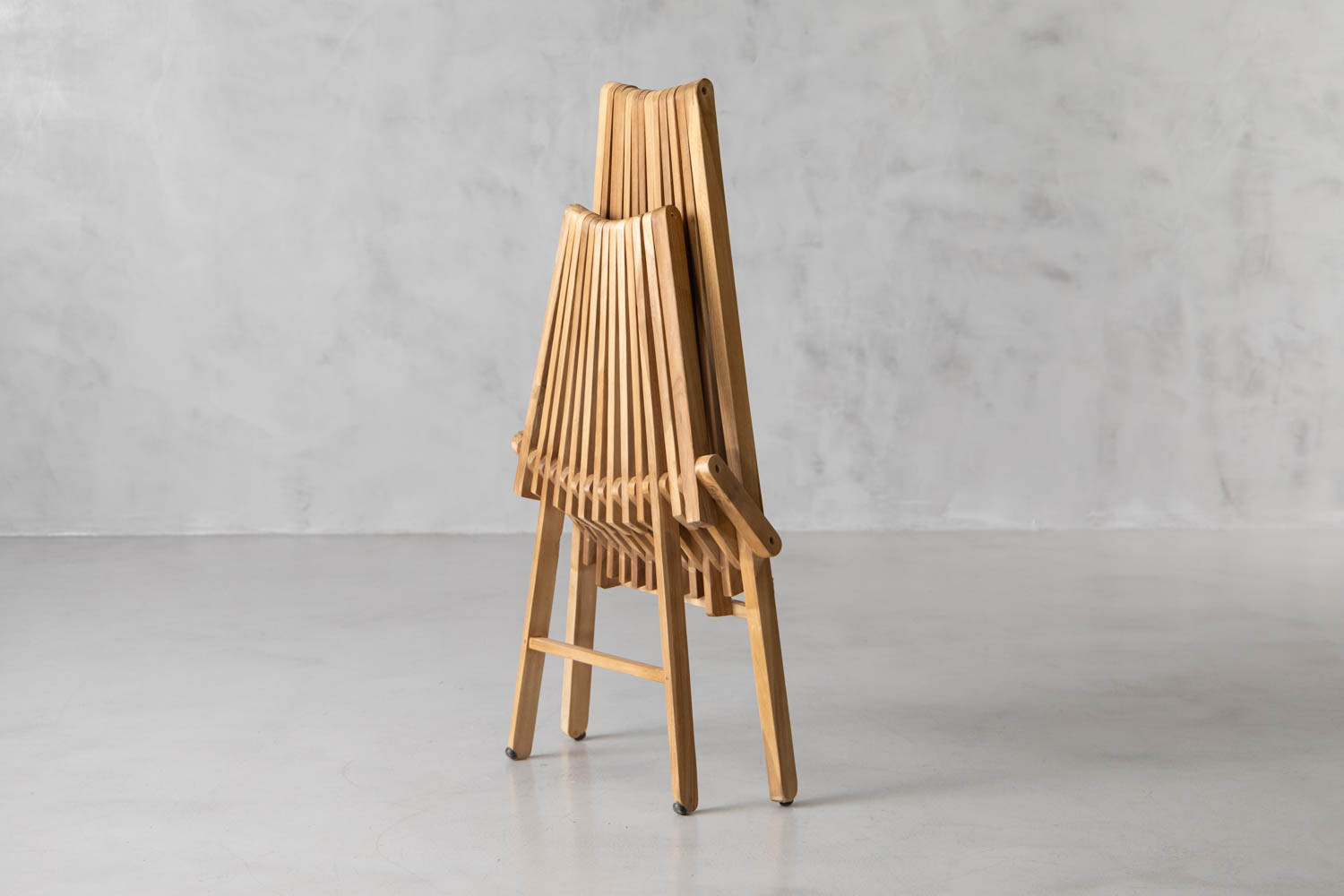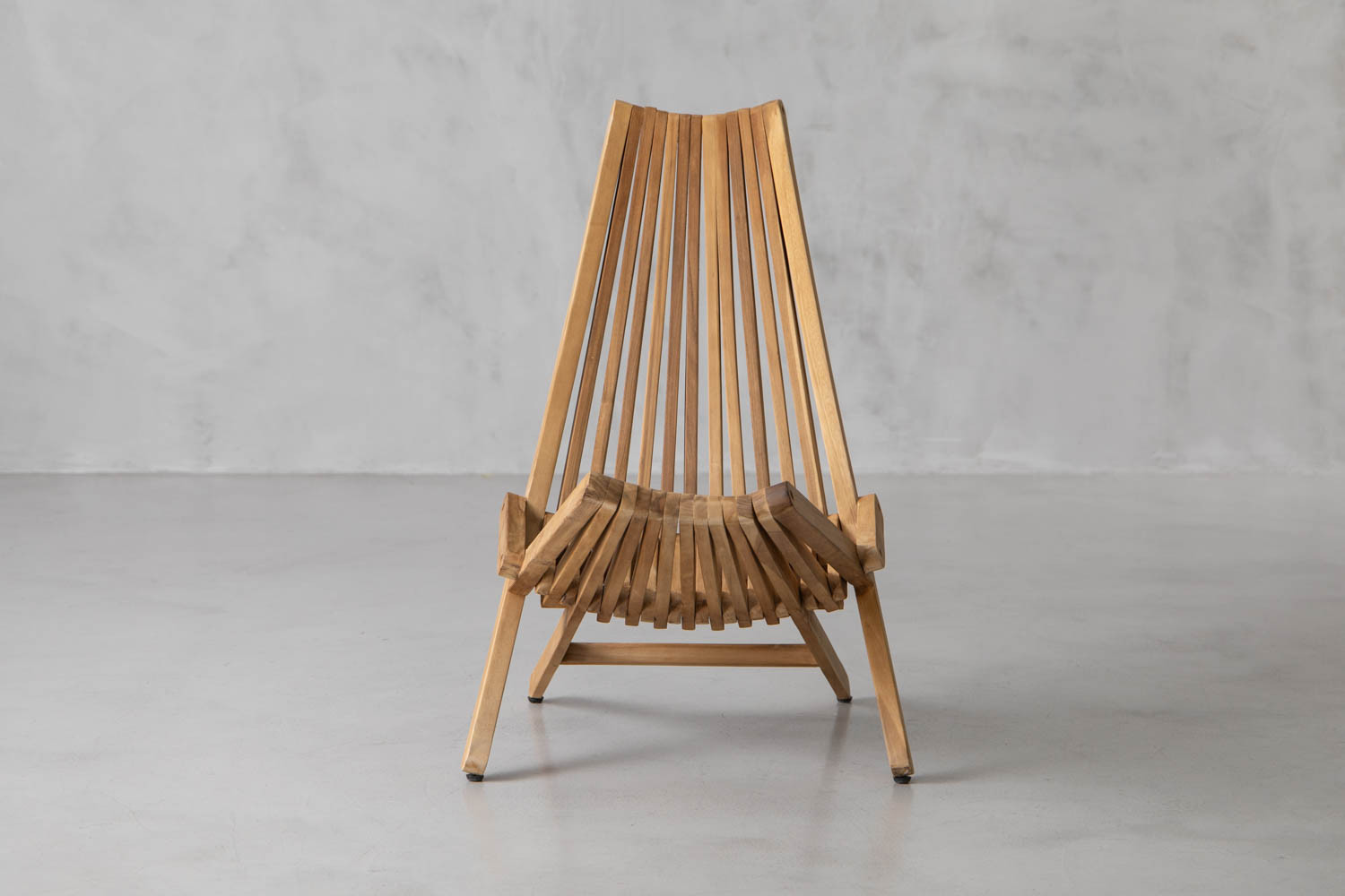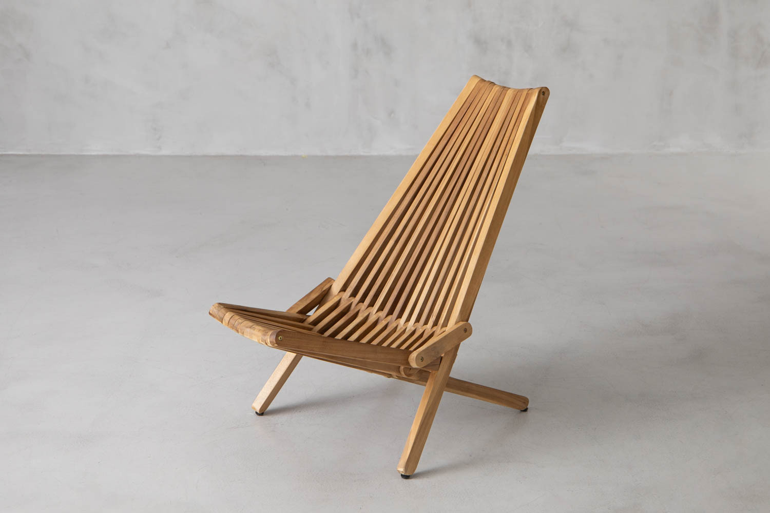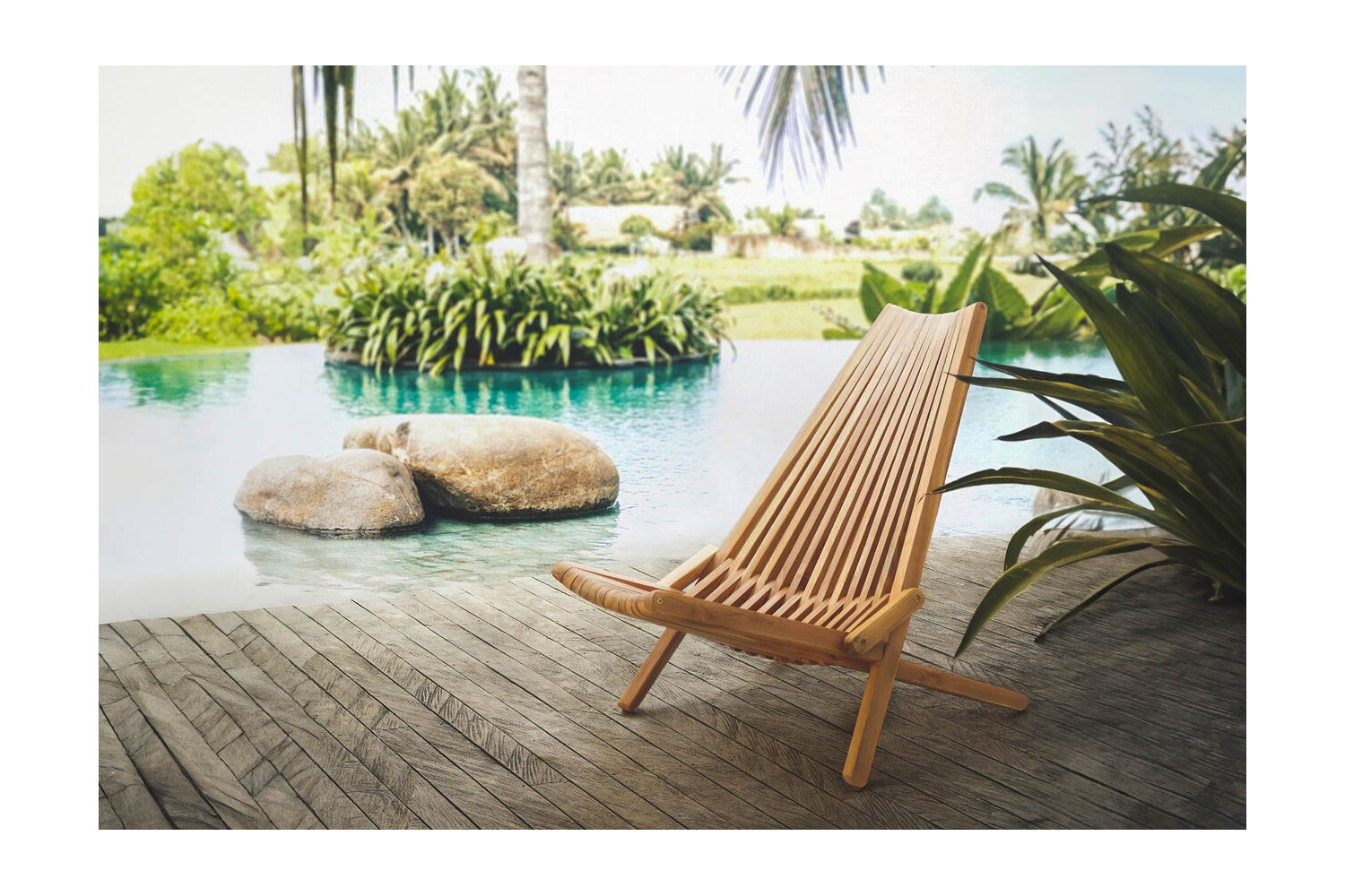 The Waikiki Lounge Chair welcomes a distinctive design and a beautifully crafted patio-style lounge chair. This foldable Teak wood lounge chair boasts a sleek, ergonomic design ideal for patio lounging. Vertical slats form its curved backrest and seat, providing comfortable support. Its warm wood finish complements outdoor spaces, and the chair's ability to fold up makes for easy storage and versitility for on-the-go relaxation.