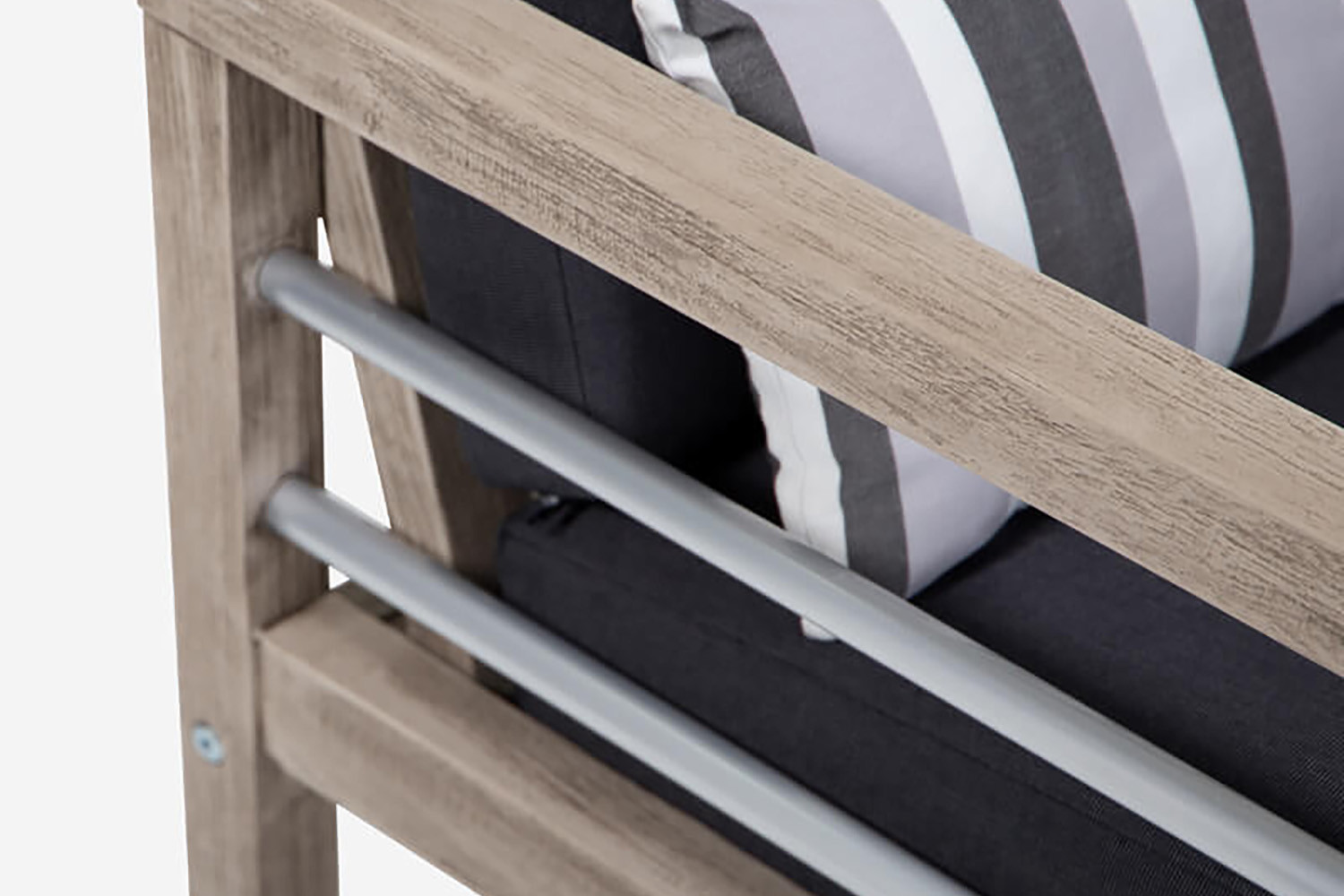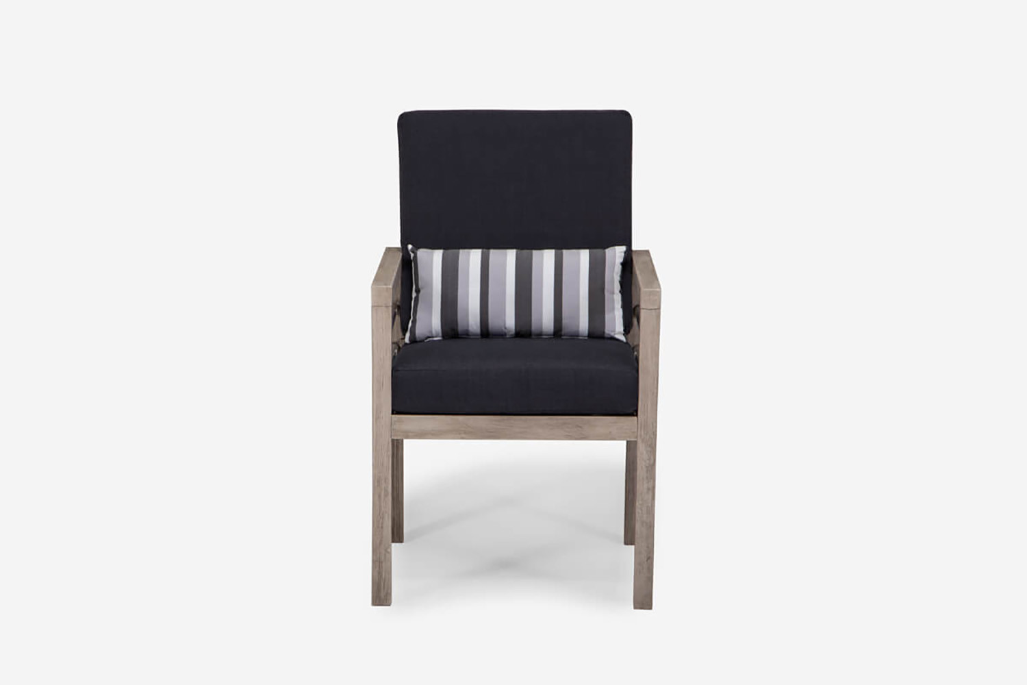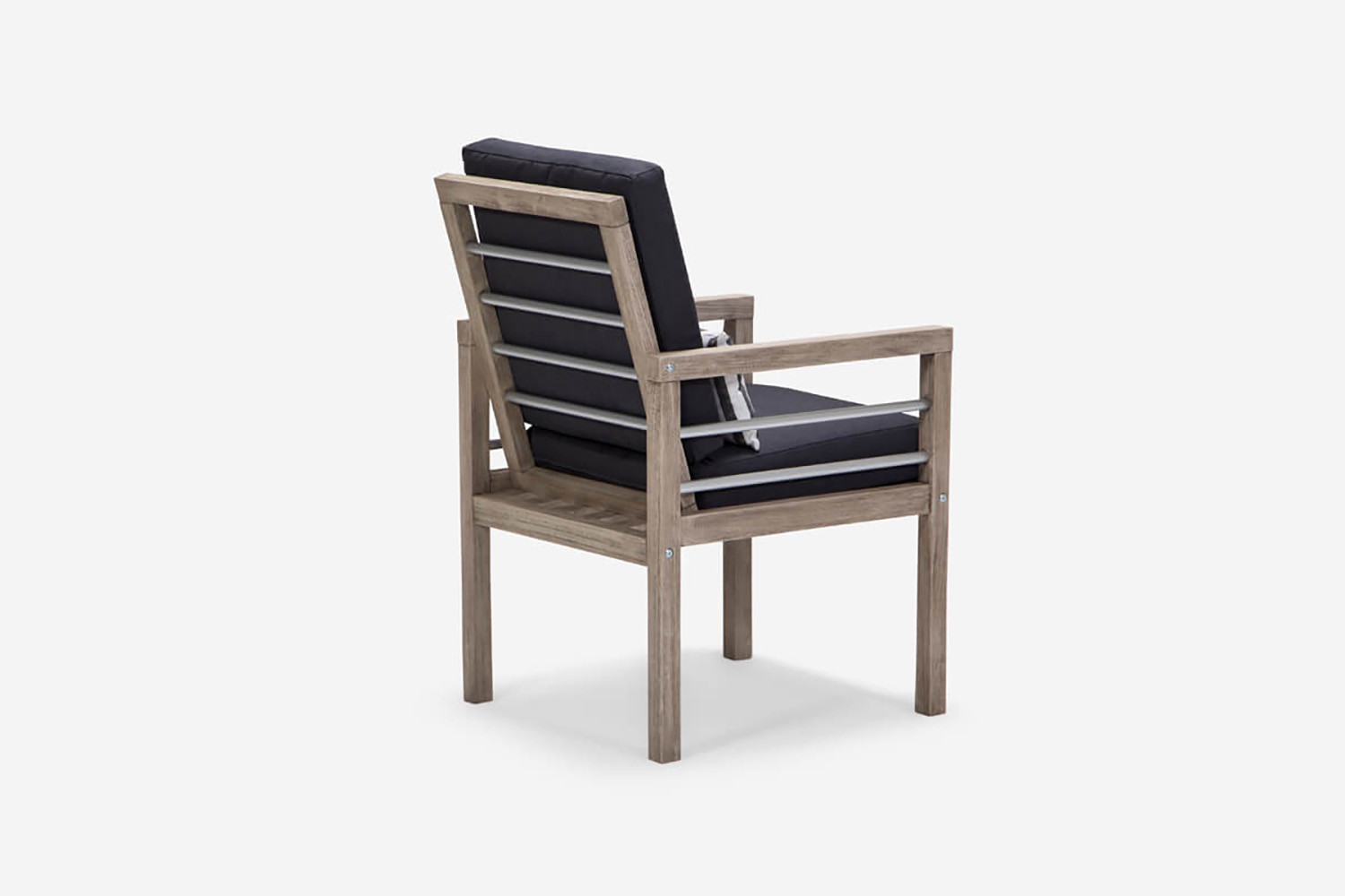 The contemporary silhouette of the Capri dining chair features clean lines and emphasizes comfortable dining. With upholstery in high-quality polyester fabric accented with solid eucalyptus wood and aluminium, this chair makes a unique addition to your patio.