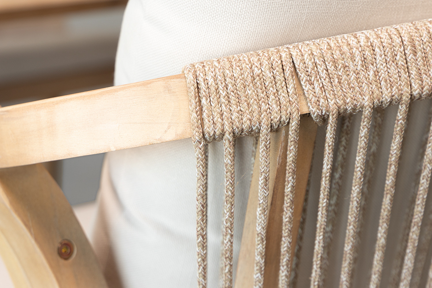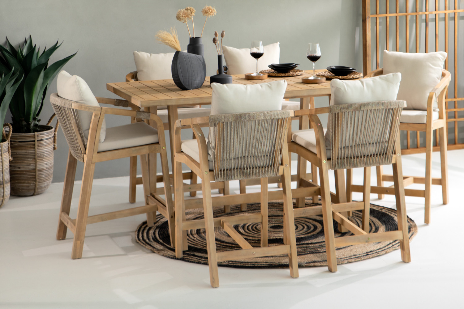 Table & Chair: Acacia Wood | Chair: Weaving: Nylon Rope | Chair Cushion: Polyester