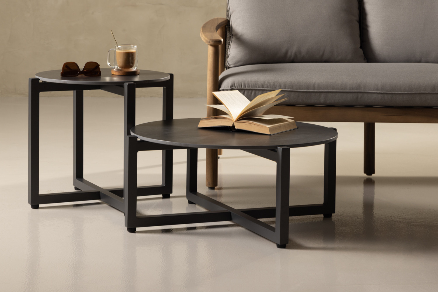 The Zenith Nesting Table Set anchors your outdoor seating area with contemporary style. The larger coffee table and coordinating side table echo the same crisp geometry, with their sleek round tops and strong, cross-braced frames. Both tables balance durability with a lightweight visual feel that’s perfectly suited to undercover patios.