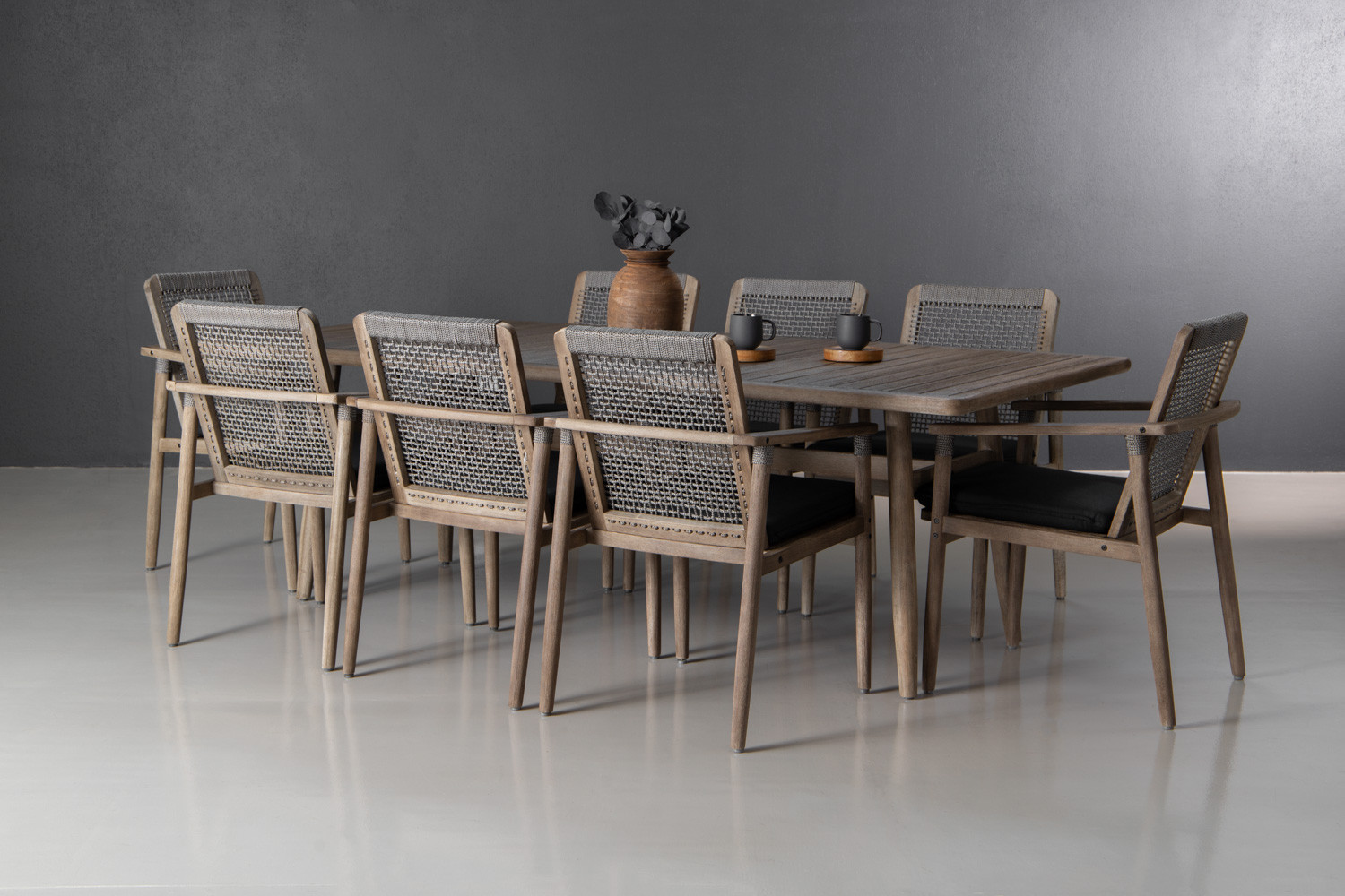 Comfort is key, and the Ashburn set delivers with plush linen cushions that make every seat inviting. Spacious enough to accommodate eight people, it’s ideal for hosting family meals, celebrations, or relaxed afternoons under the sun. The set’s natural tones and sophisticated design fit seamlessly into a variety of patio styles, creating a warm and welcoming atmosphere.