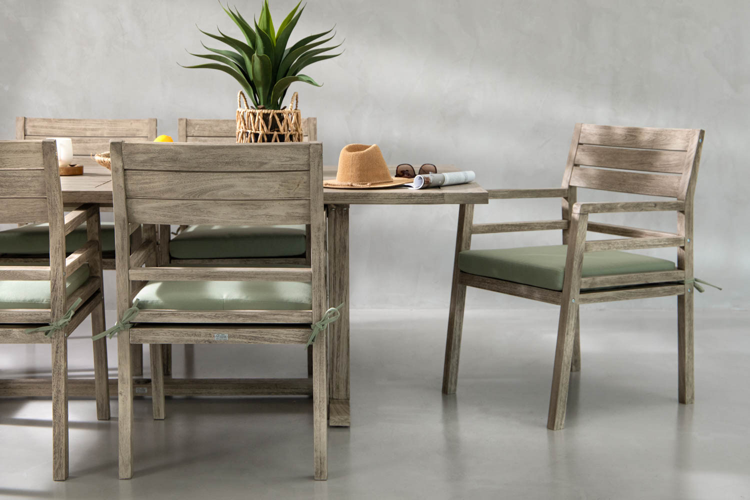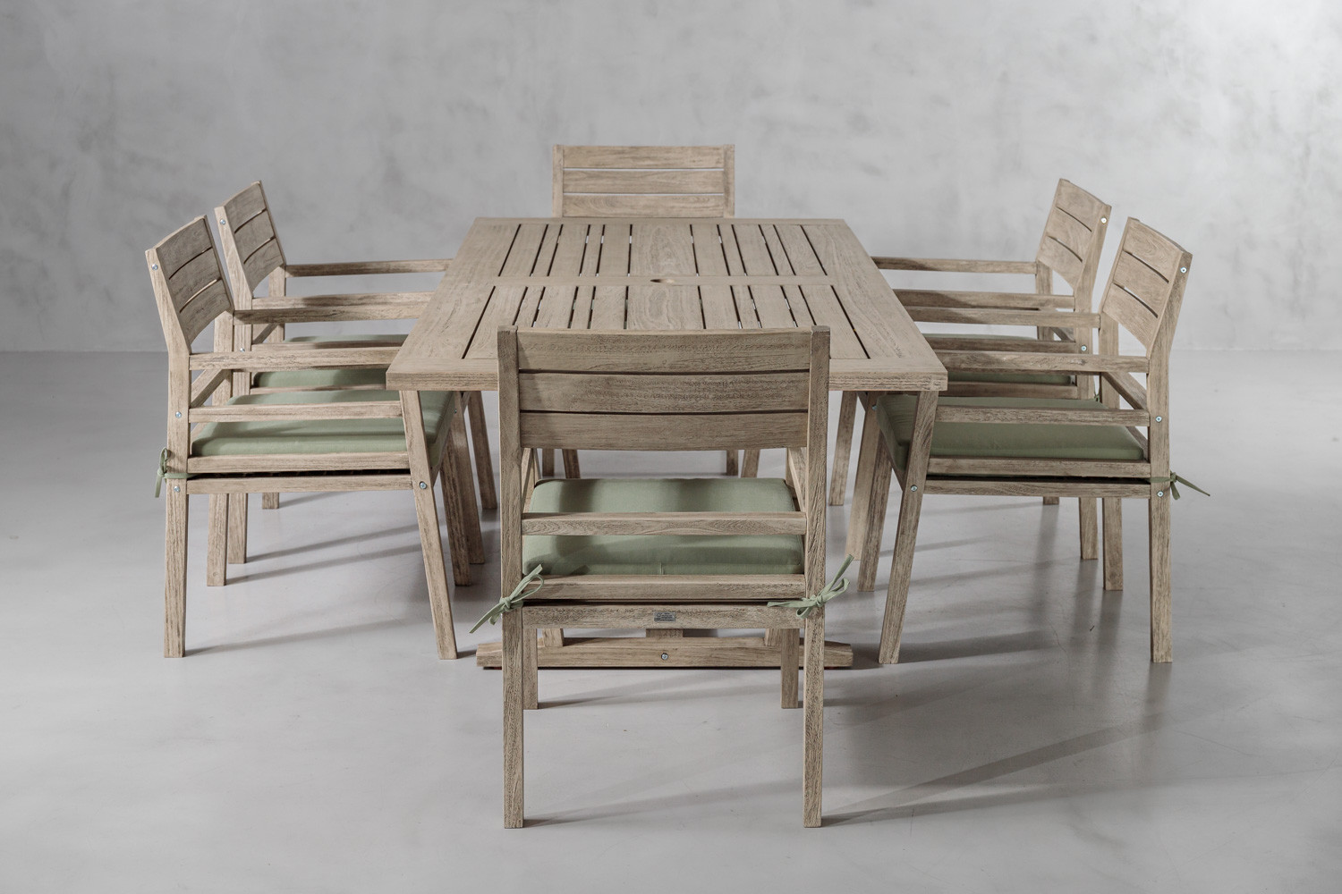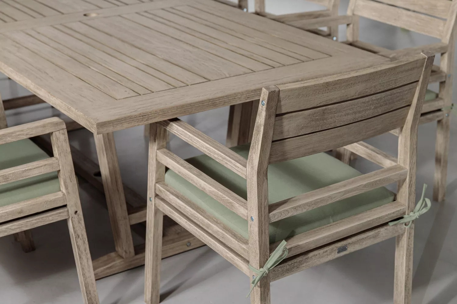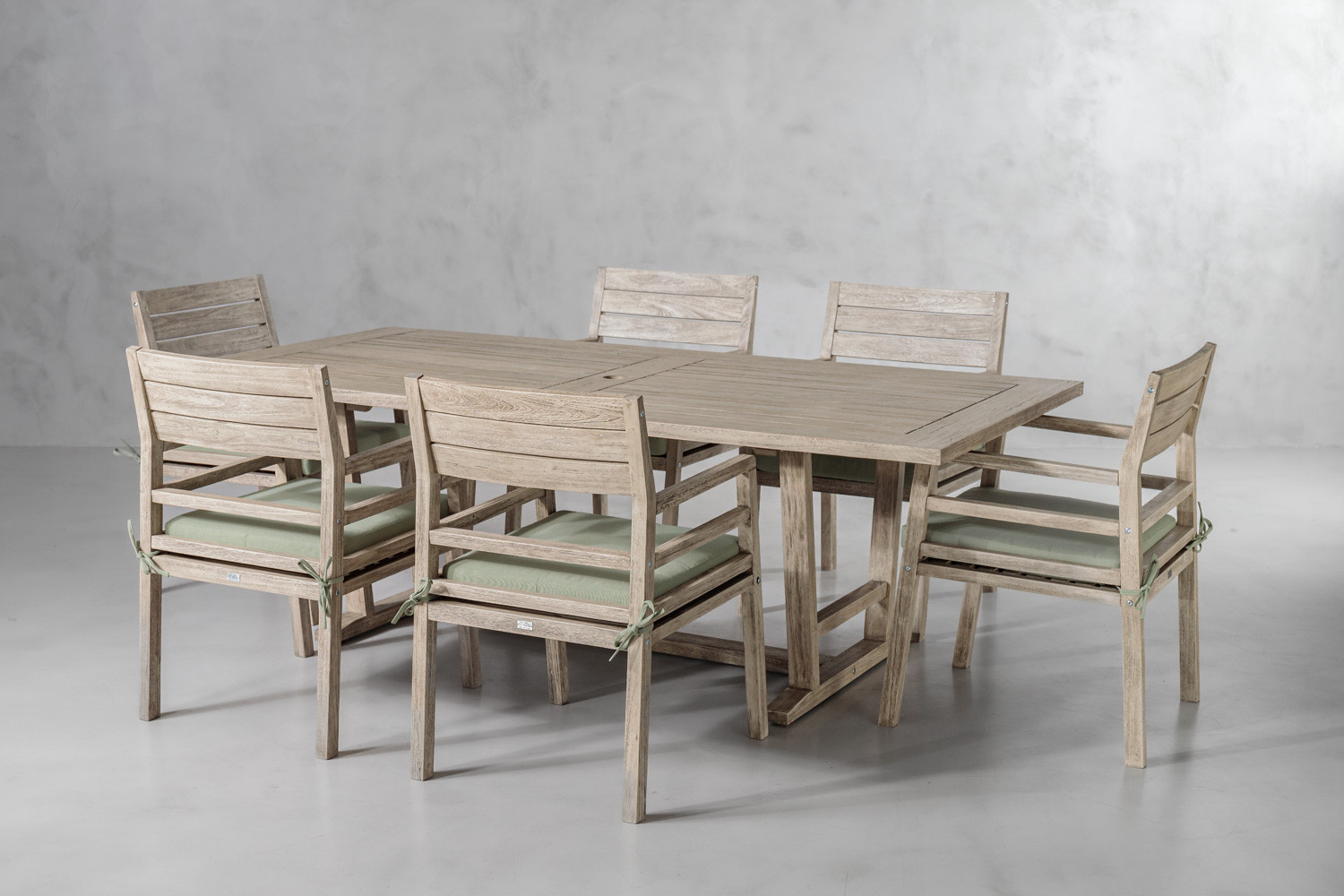 This patio set features six stunning patio chairs. These chairs feature slats that allow you to feel the fresh air and enjoy dining in the great outdoors. They surround a perfectly portioned dining table, which is elegantly designed, for lunch dates under the sun.