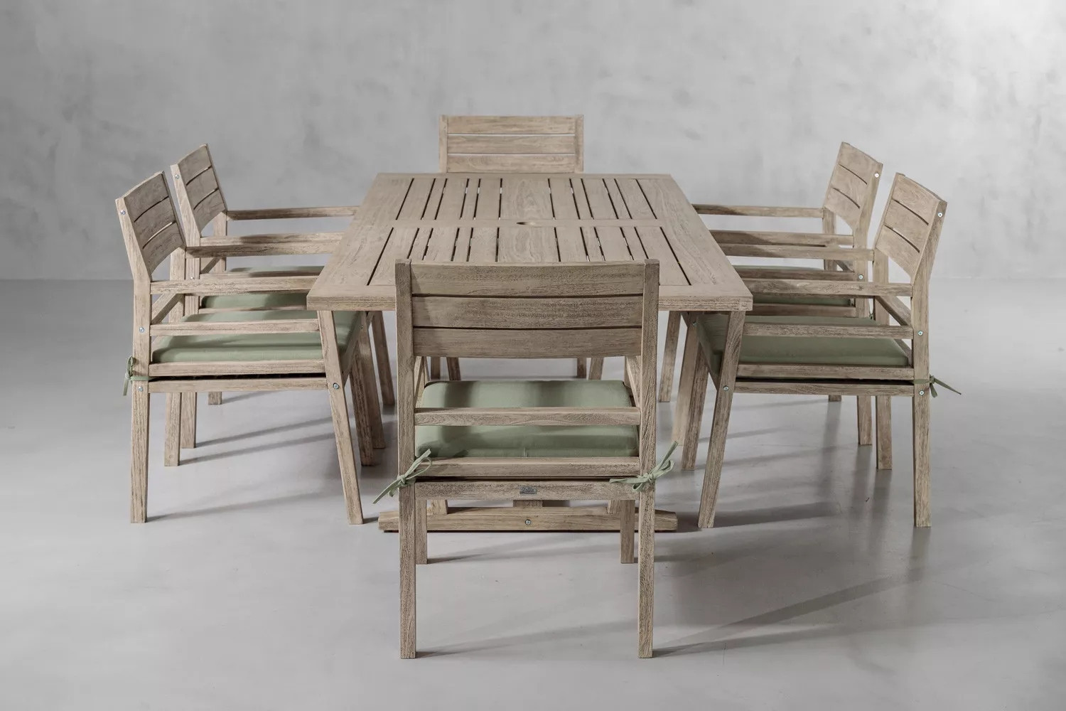 The exquisite Christofina Patio Dining Set is a relaxing space ideal for intimate outdoor dining. Crafted from environmentally friendly Eucalyptus wood with a beautiful rustic finish, the set features a distinctive design with a paneled rectangular table and six slatted chairs for a cool and casual setting.