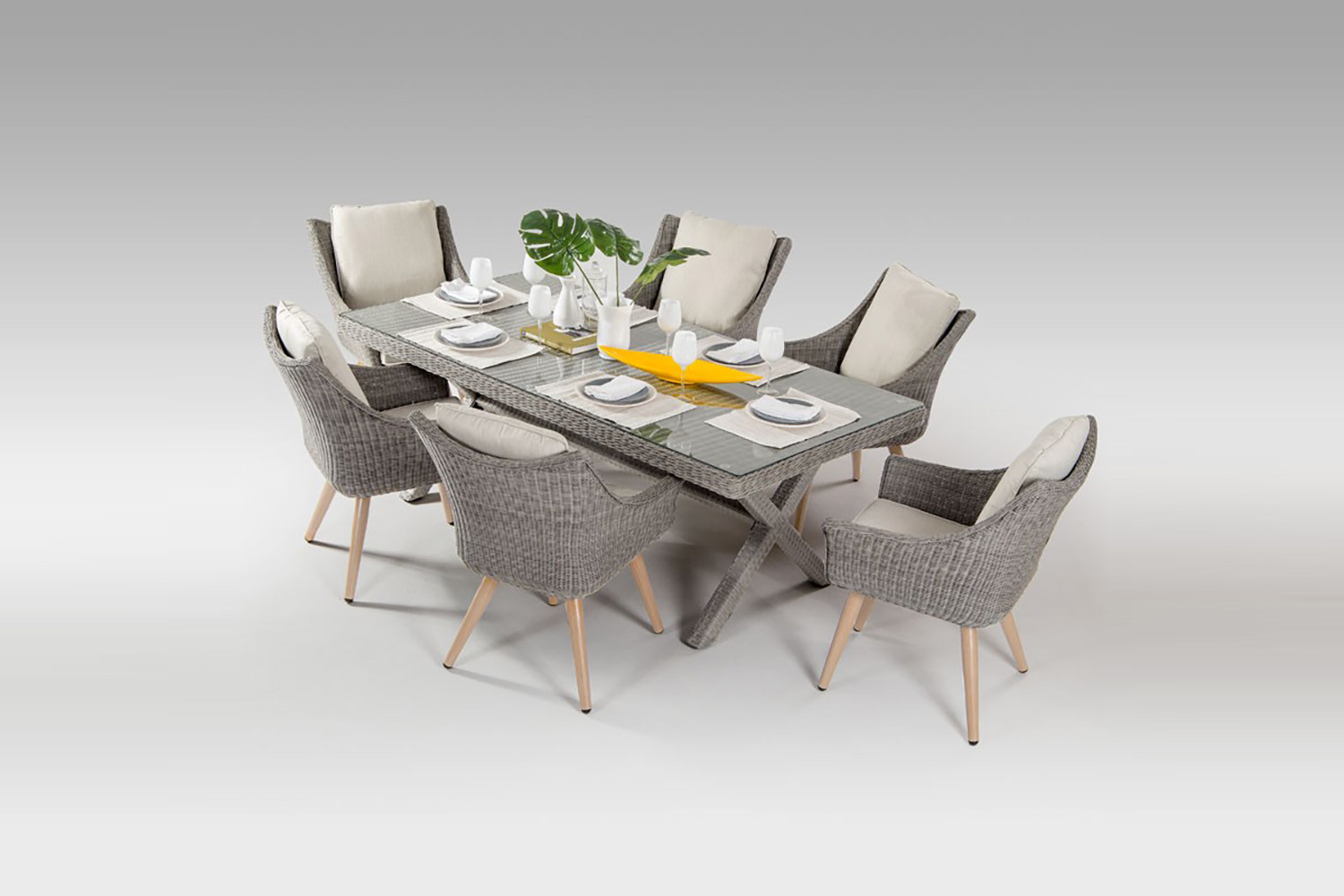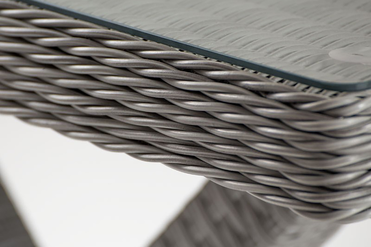 Table and chairs feature high-quality weather resistant PE rattan and aluminium frame.