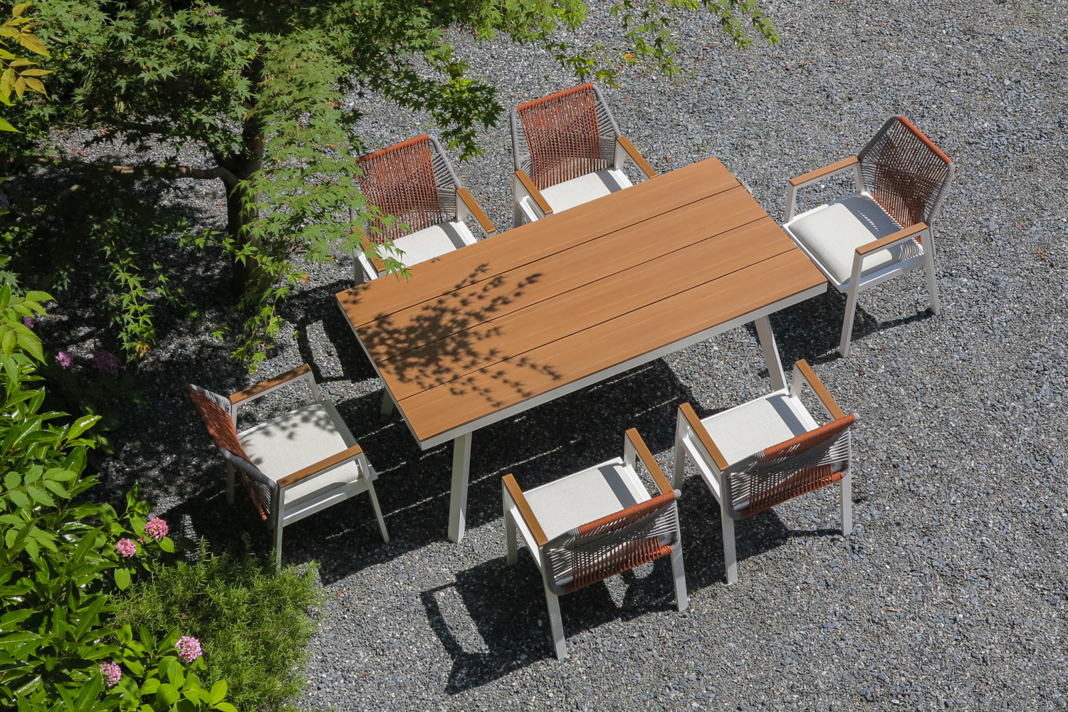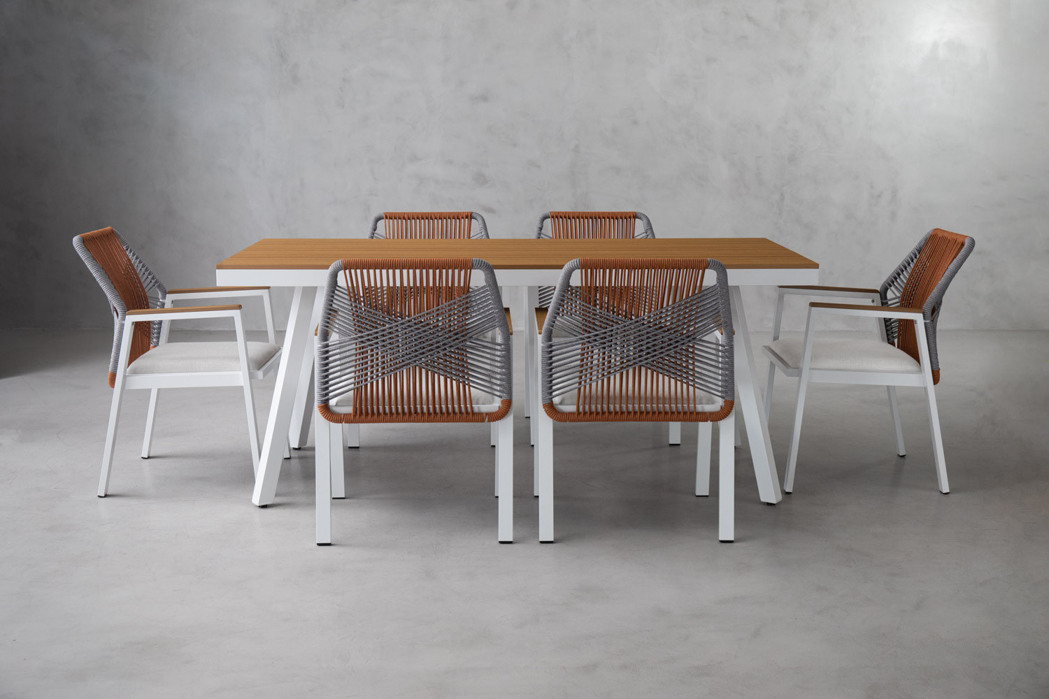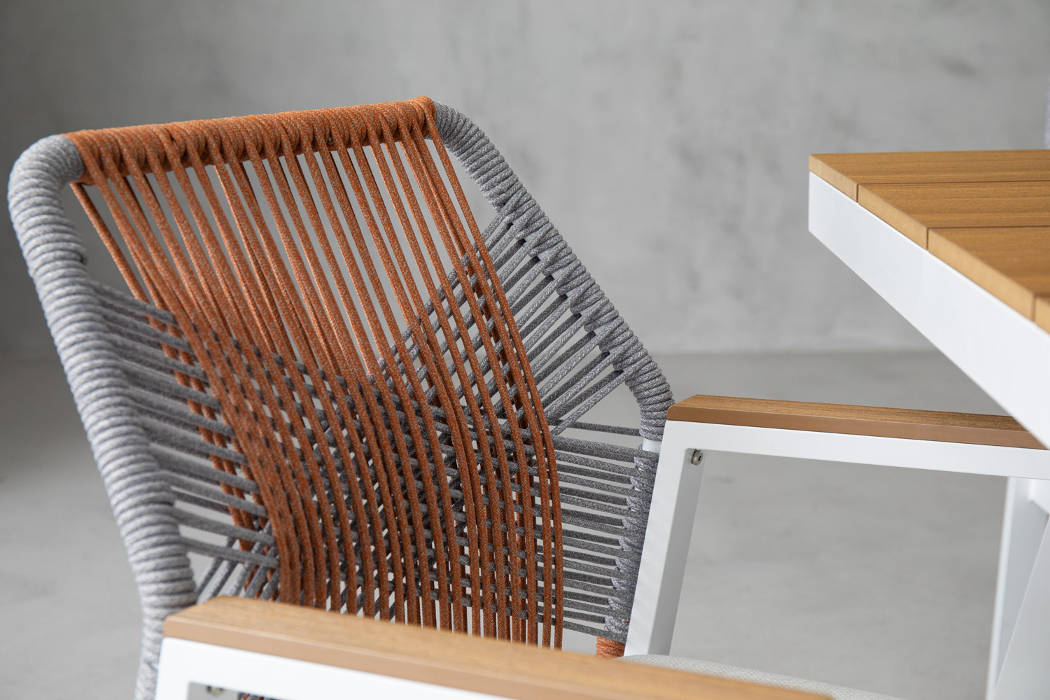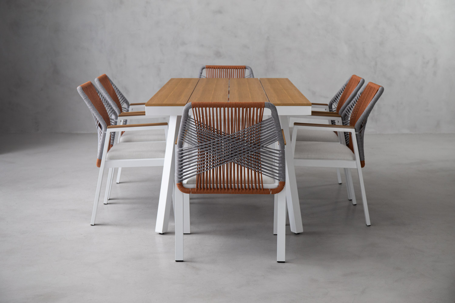 Functionality meets finesse in the undeniably alluring Sultana Patio Dining Set. Constructed from aluminium, the chairs are intricate wonders with their interwoven PVC rope backrest design, while the table is the quintessential centerpiece for those who enjoy contemporary outdoor dining with a touch of grandeur.