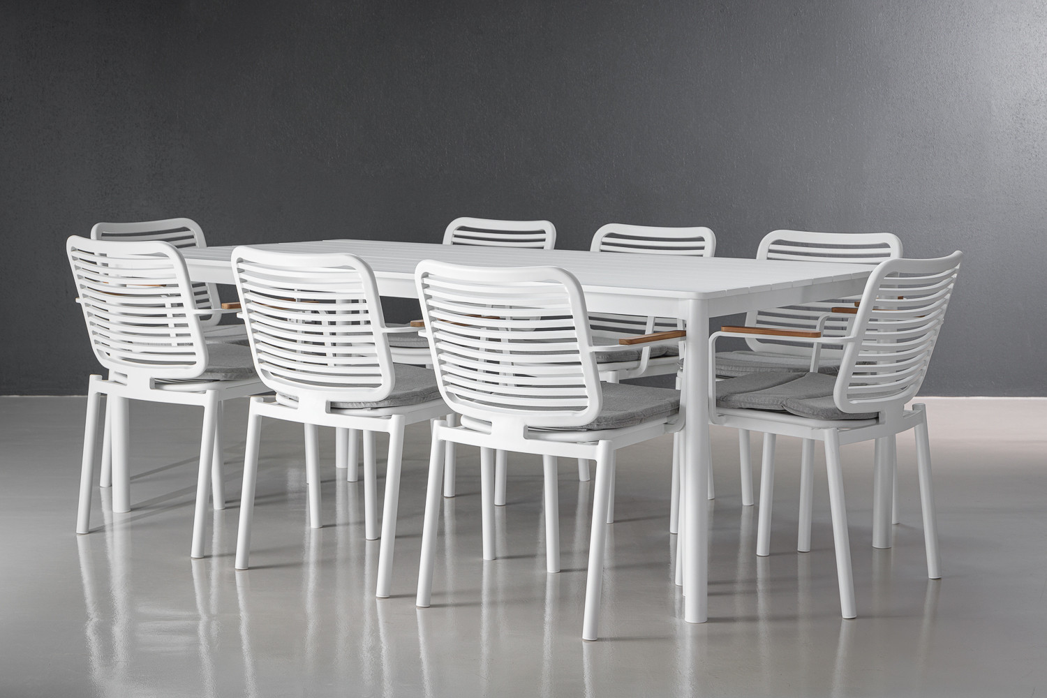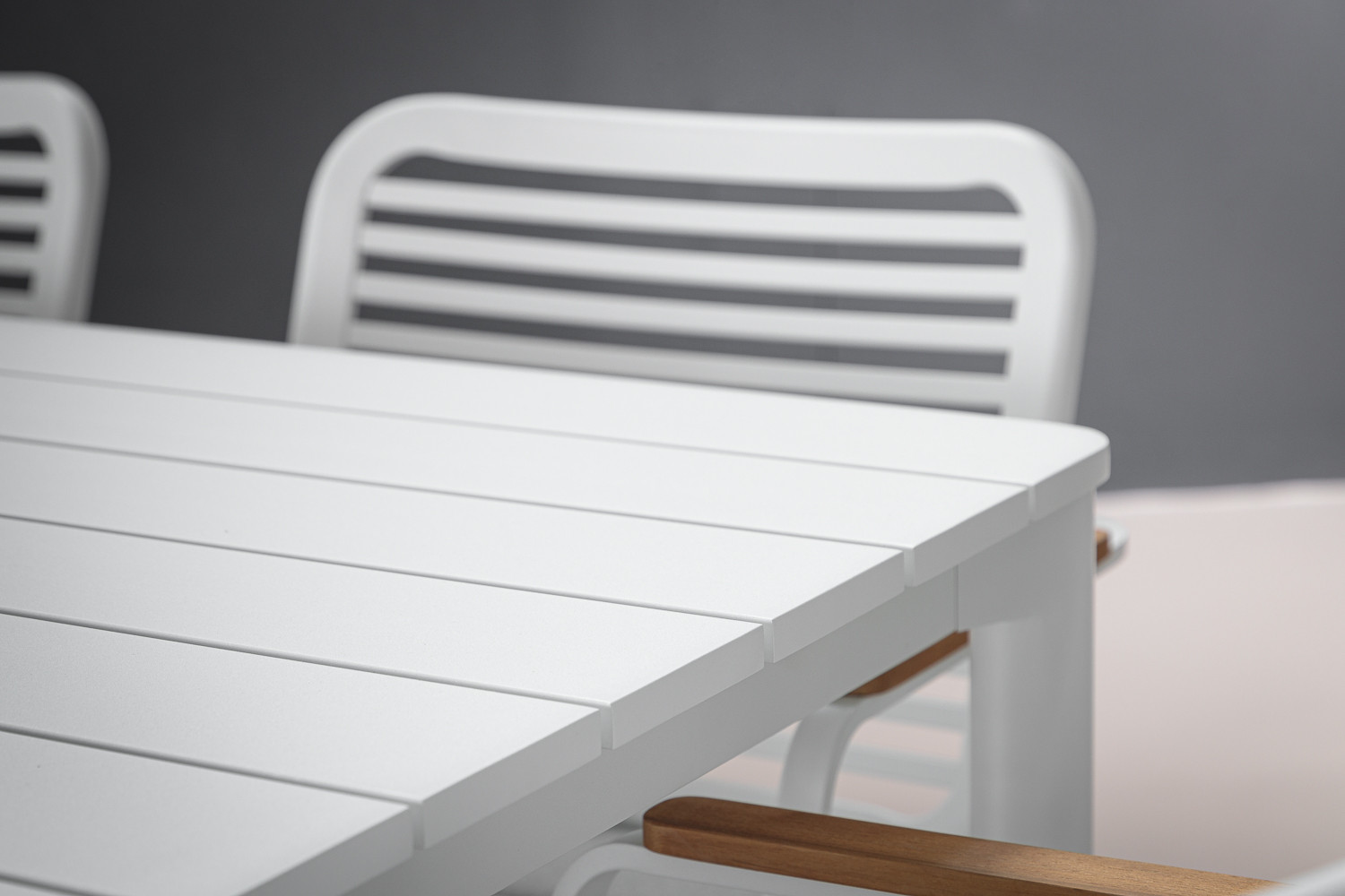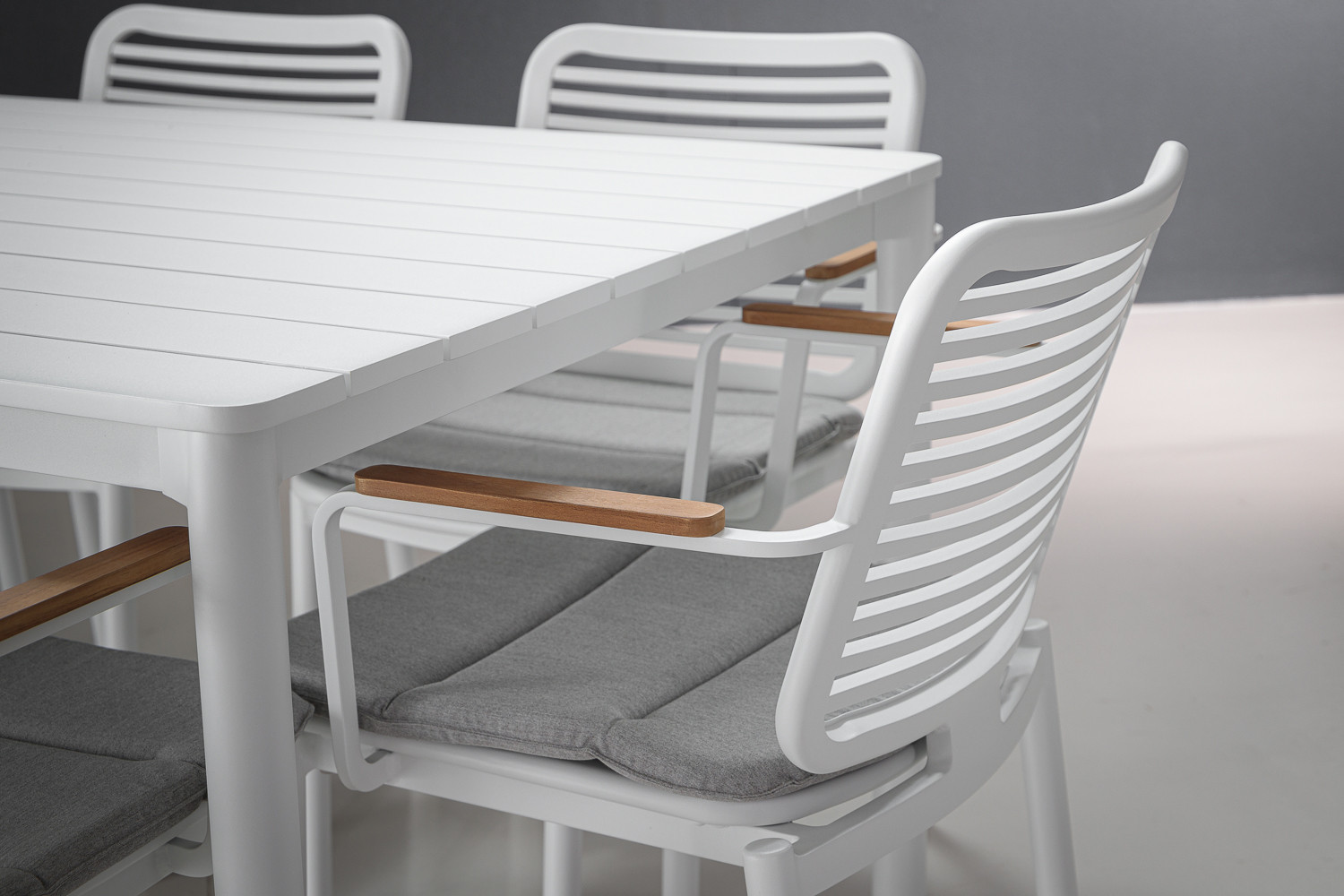 The dining table features a solid powder-coated aluminium frame that ensures stability and weather resistance, while its clean-lined tabletop adds a sleek, modern edge. Each chair is crafted for both style and comfort, with teak slat armrests that bring a touch of natural beauty and sustainability. The plush fabric cushions provide superior comfort, while the striking striped backrest adds a distinctive, sophisticated flair.