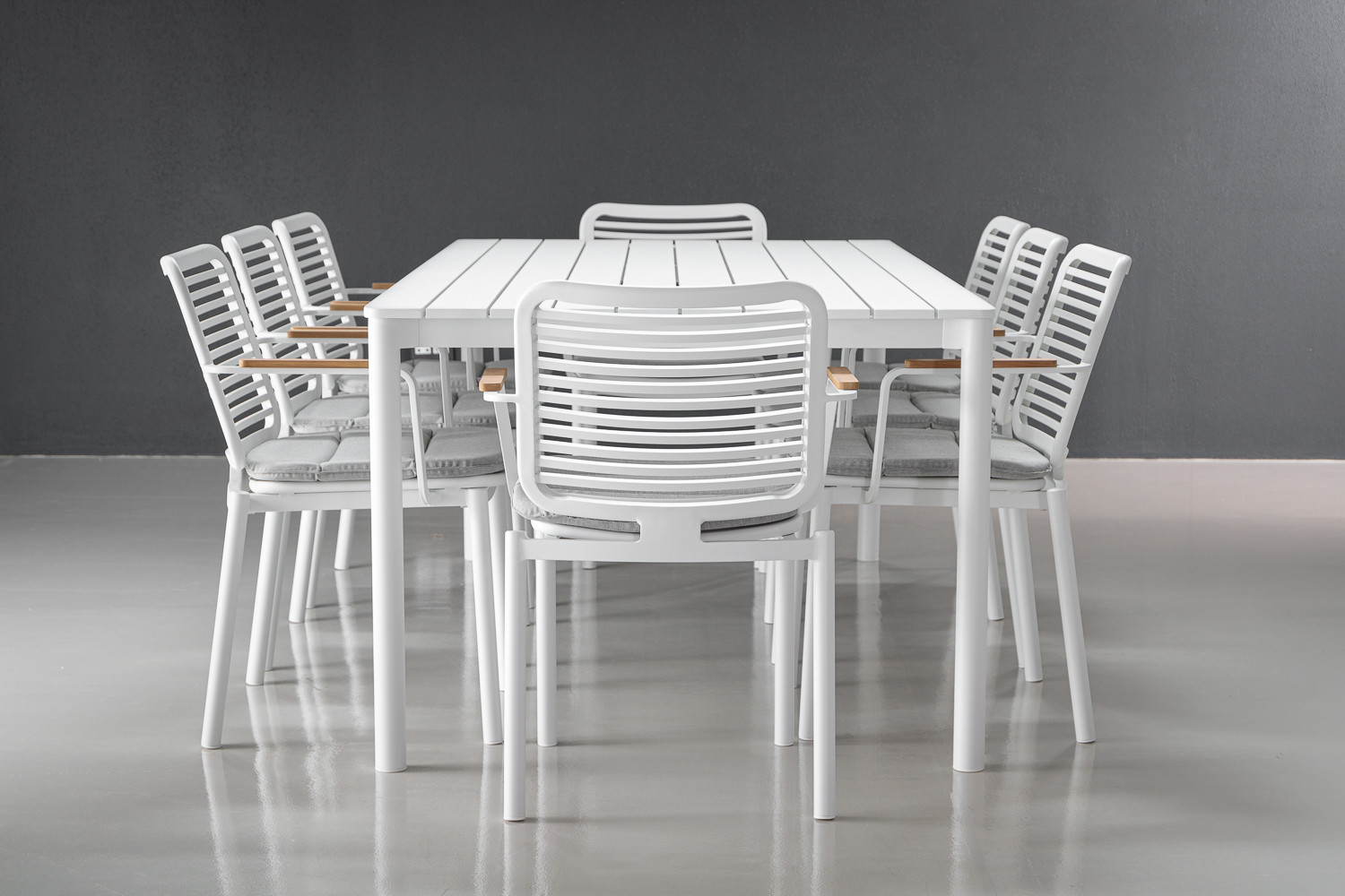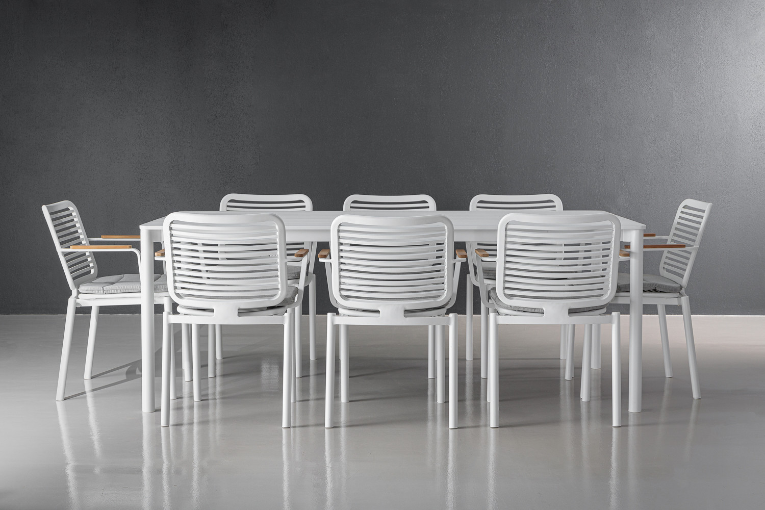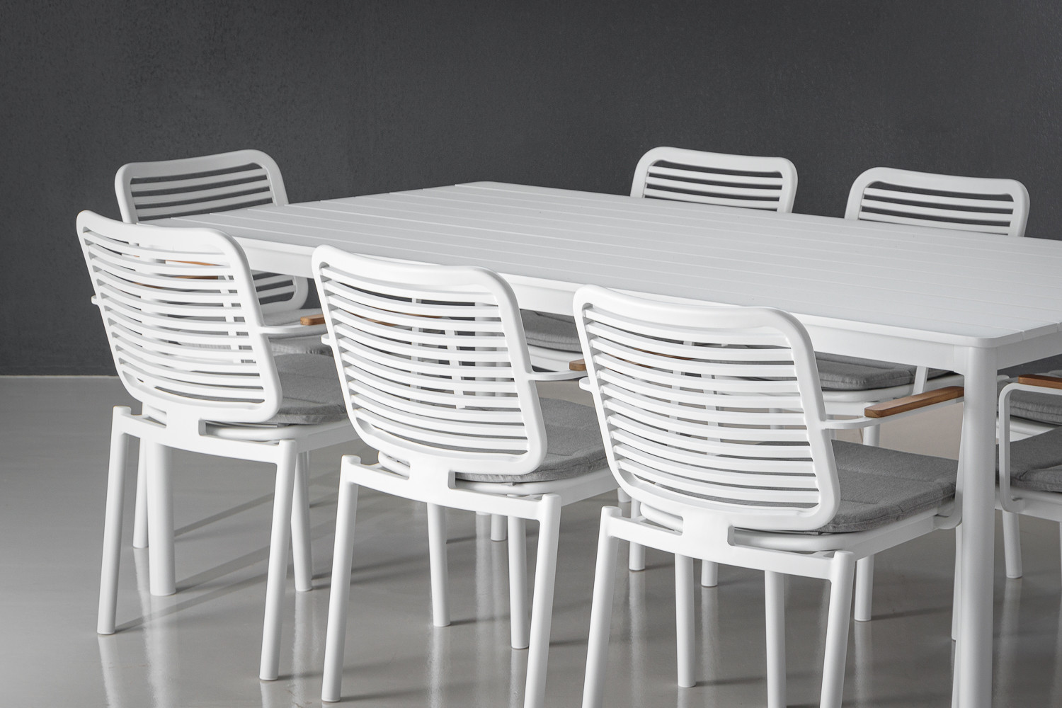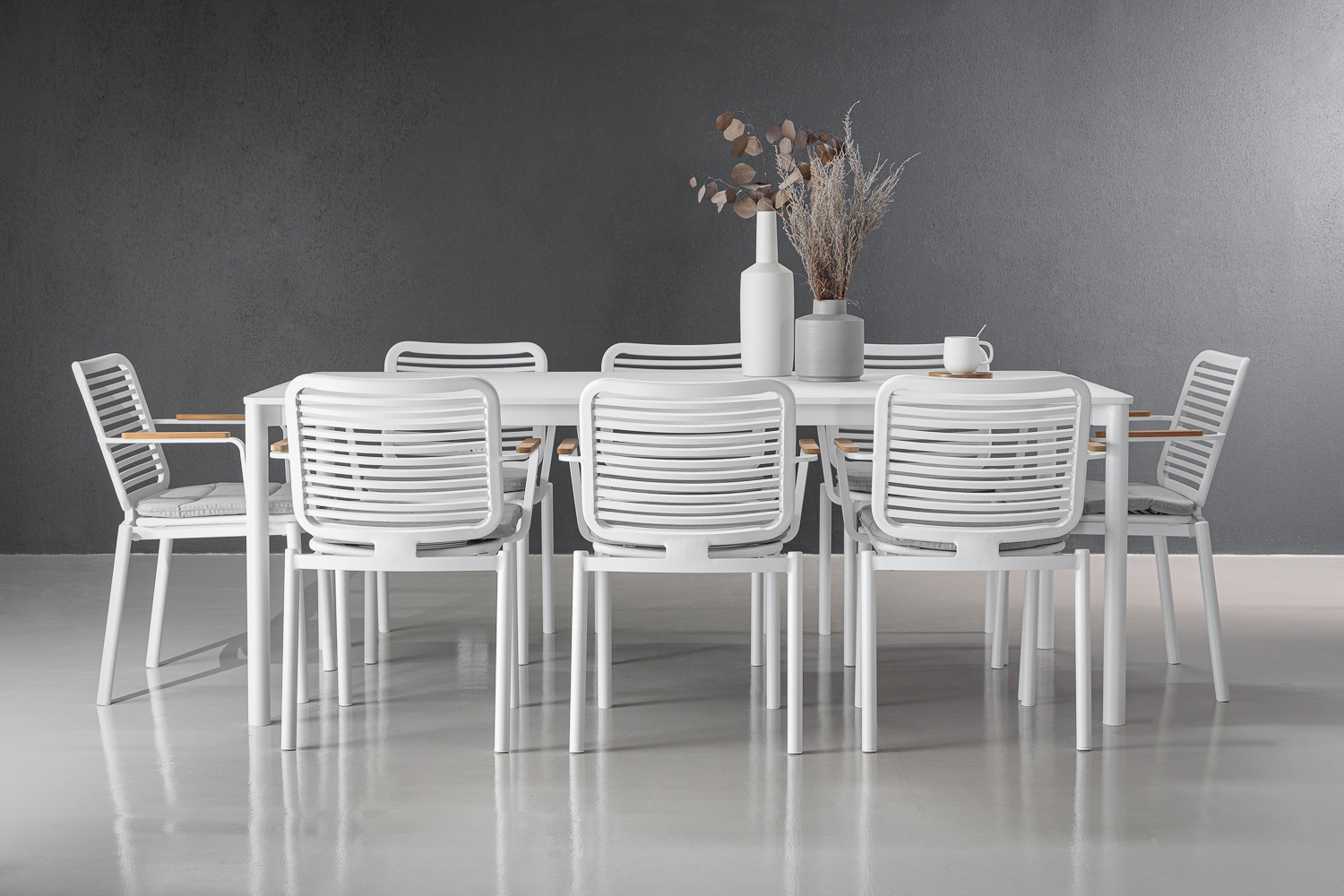 The dining table features a solid powder-coated aluminium frame that ensures stability and weather resistance, while its clean-lined tabletop adds a sleek, modern edge. Each chair is crafted for both style and comfort, with teak slat armrests that bring a touch of natural beauty and sustainability. The plush fabric cushions provide superior comfort, while the striking striped backrest adds a distinctive, sophisticated flair.