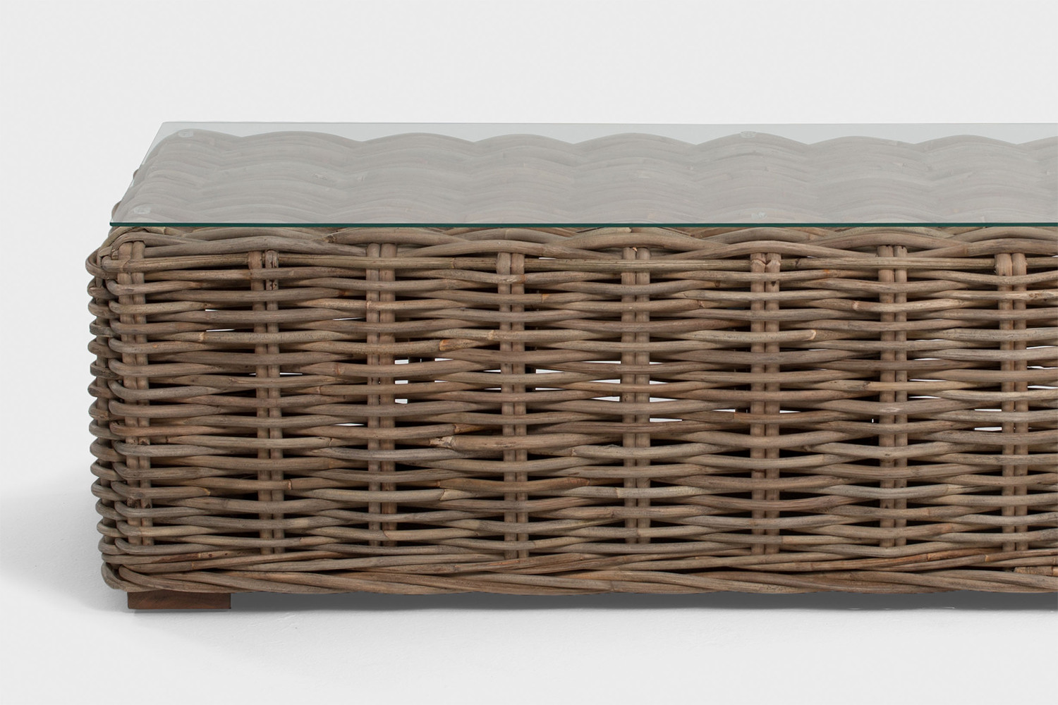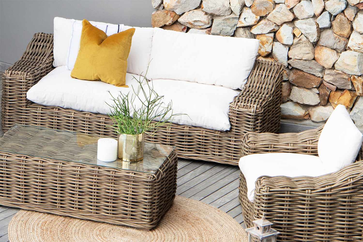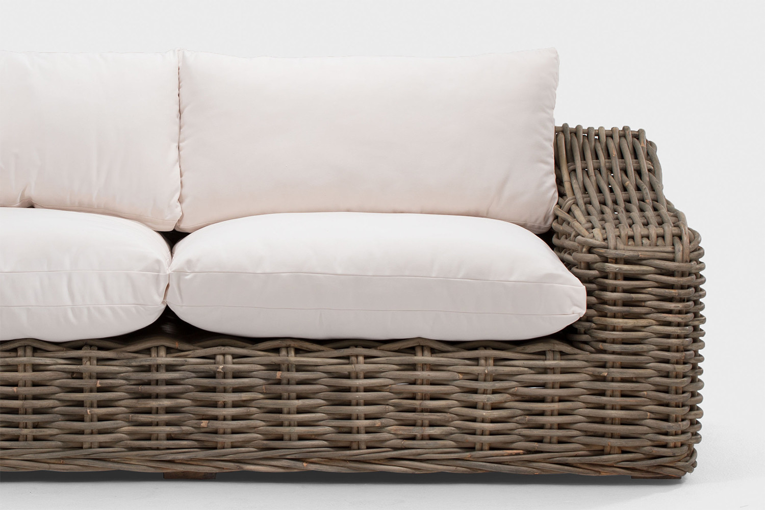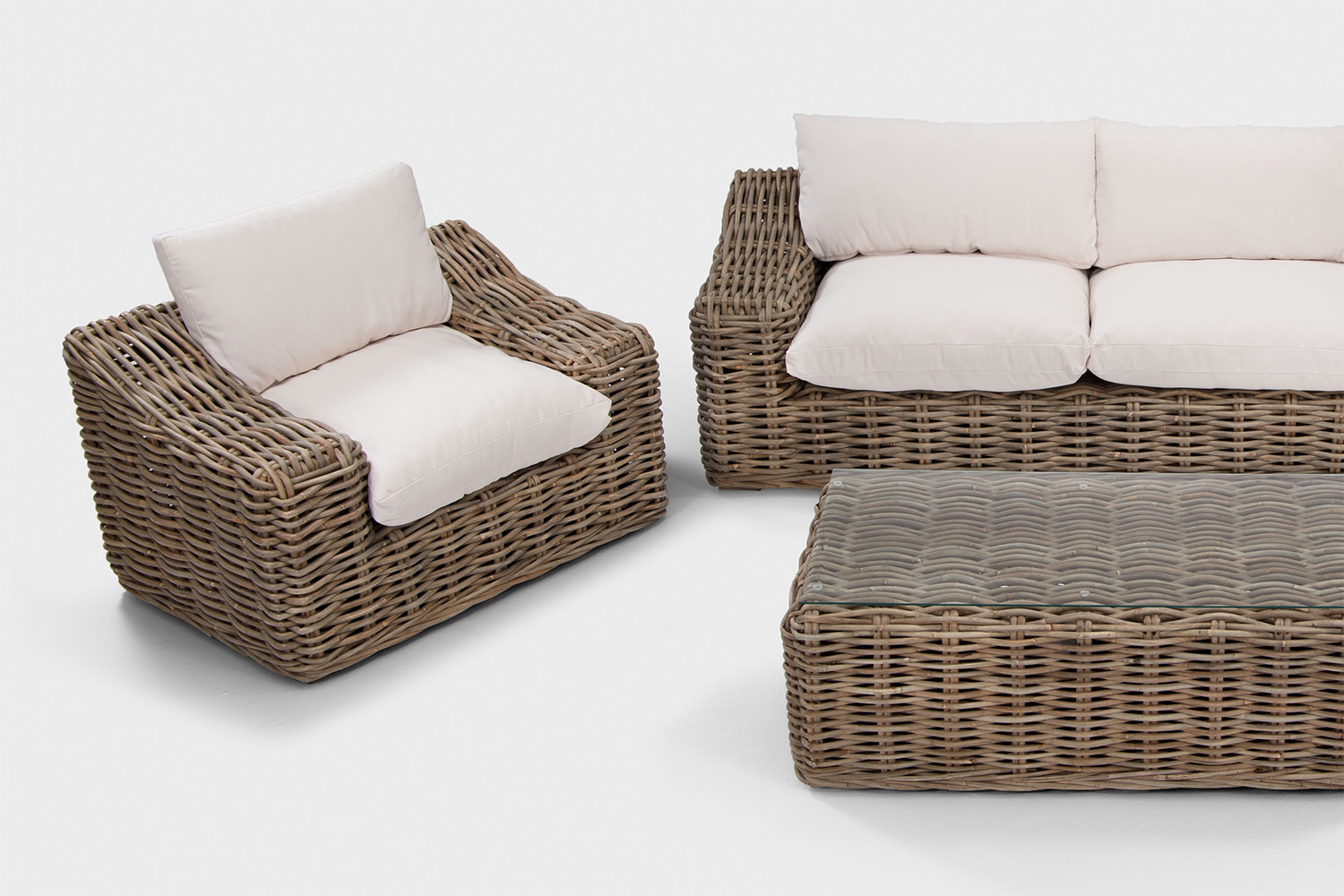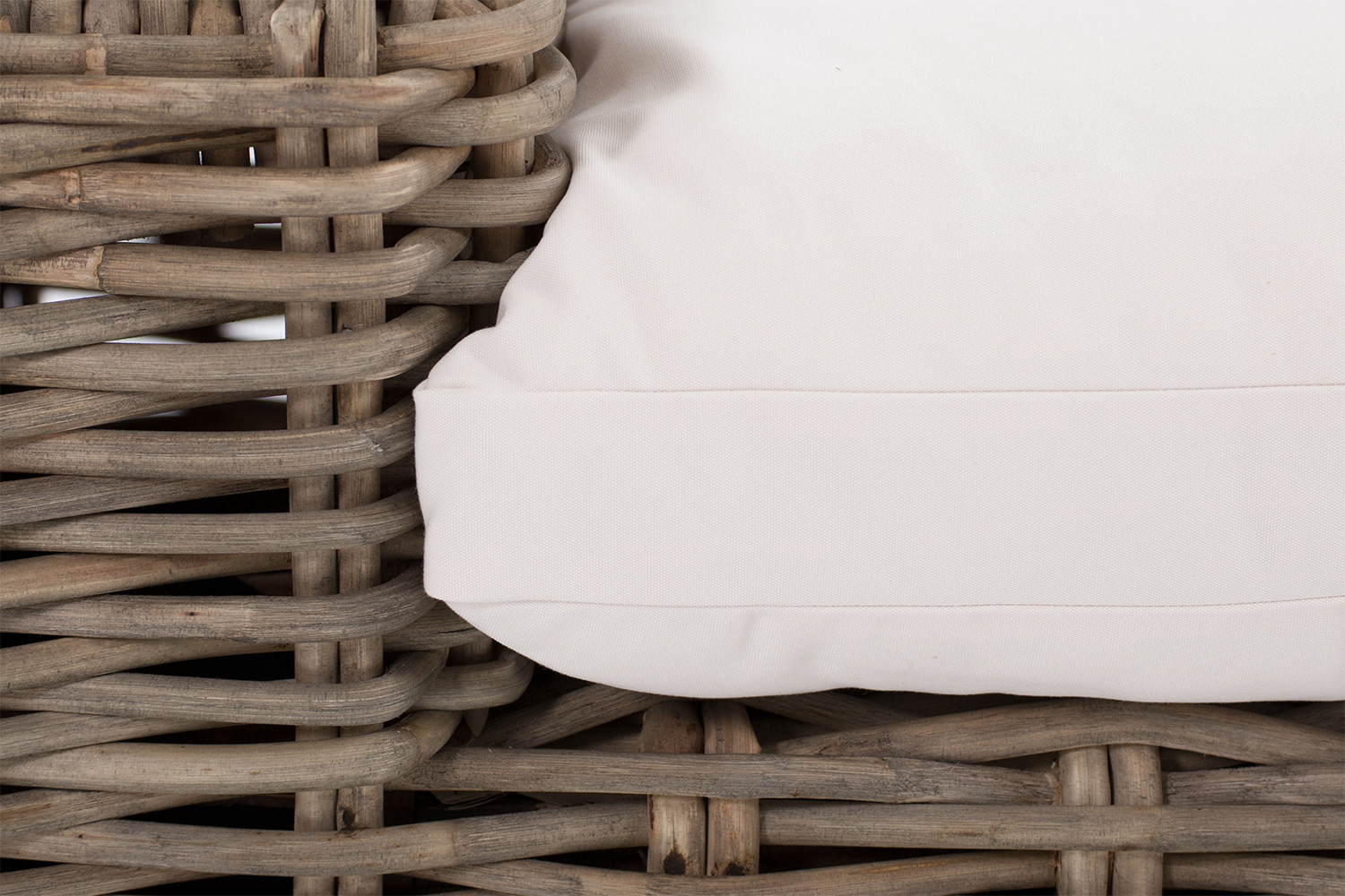 Woven with full CL rattan, complemented by plush champagne toned cushions, this set boasts a relaxed and natural look that will blend beautifully with any contemporary space, adding luxurious comfort and ample space to entertain your guests.