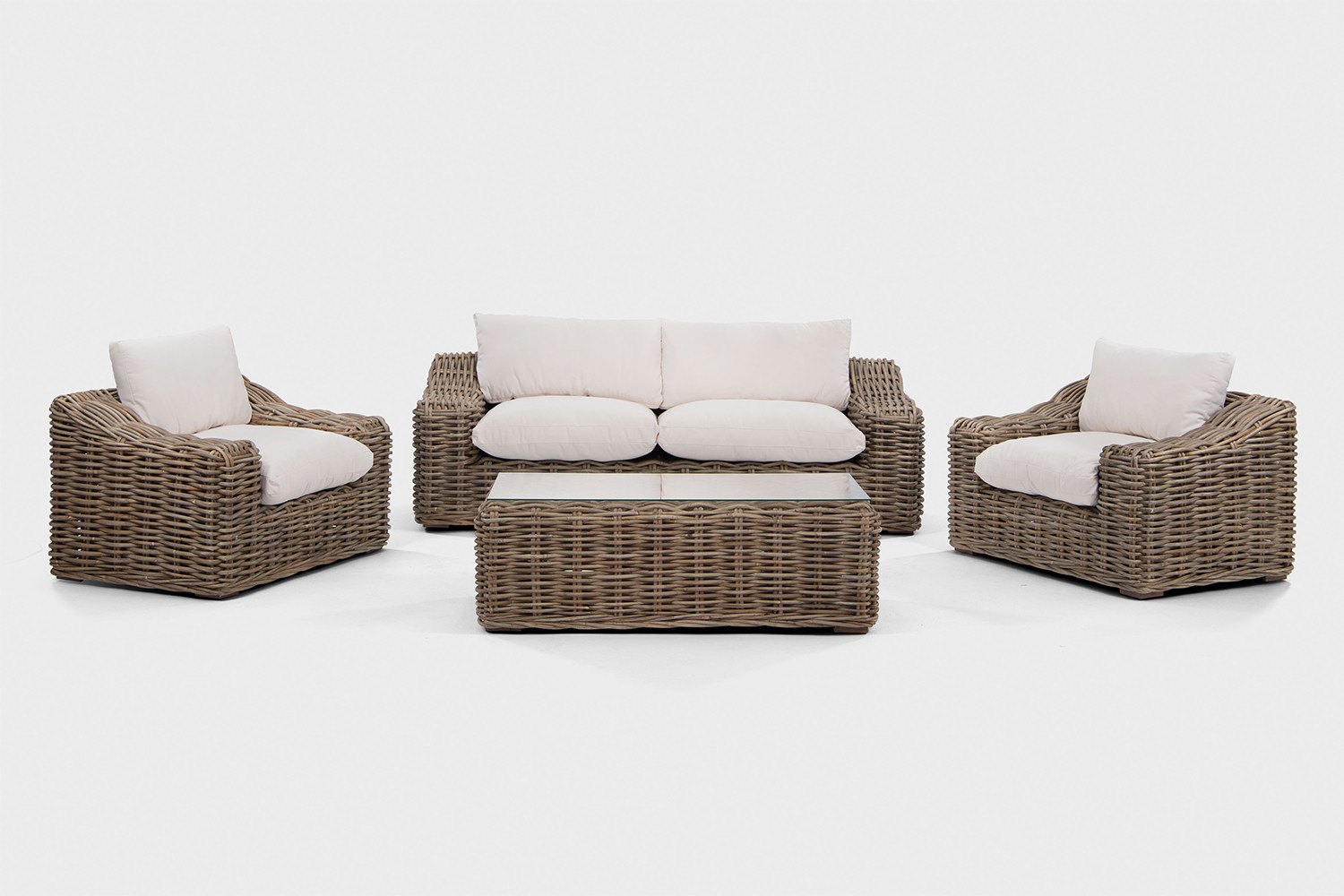 Transform your outdoor space into your favourite place to unwind with the stunning Cataleya Patio Lounge Set. This alluring and impressive contemporary set is generously proportioned and incredibly comfortable with sumptuous cushions and low, wide armrests, while the large-scale weave of full CL rattan adds to the laid-back aesthetic. The 4-piece set consists of an ample 3-seater couch, two luxurious armchairs and a full-size coffee table with tempered glass top. Removable cushion covers add to the convenience and durability of this high-quality set.