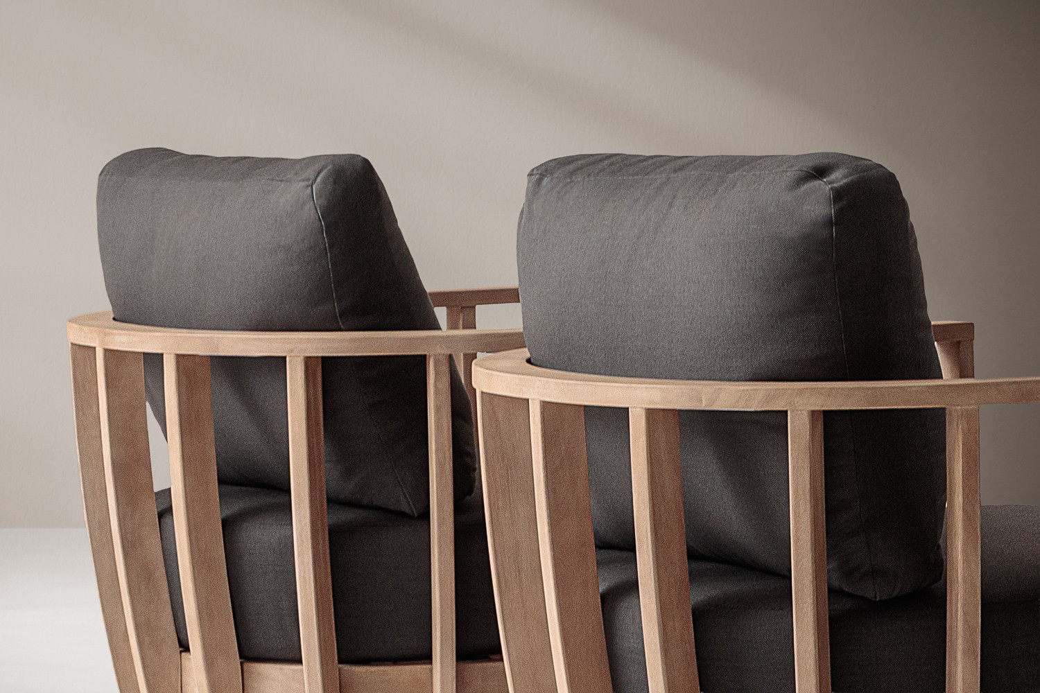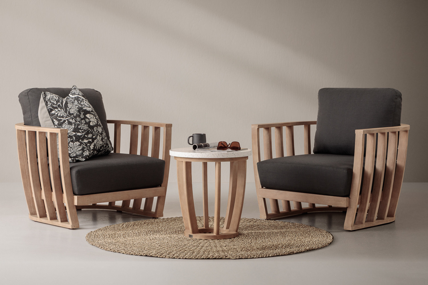 The St Lucia Patio Cocktail Set brings the essence of relaxed Balinese living to your outdoor space. Its quaint design, featuring curved slatted backrests and soft linen cushions, creates a cosy and inviting seating arrangement for covered patios.