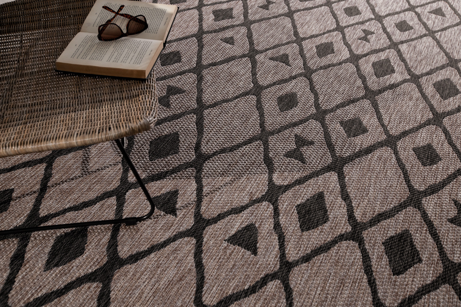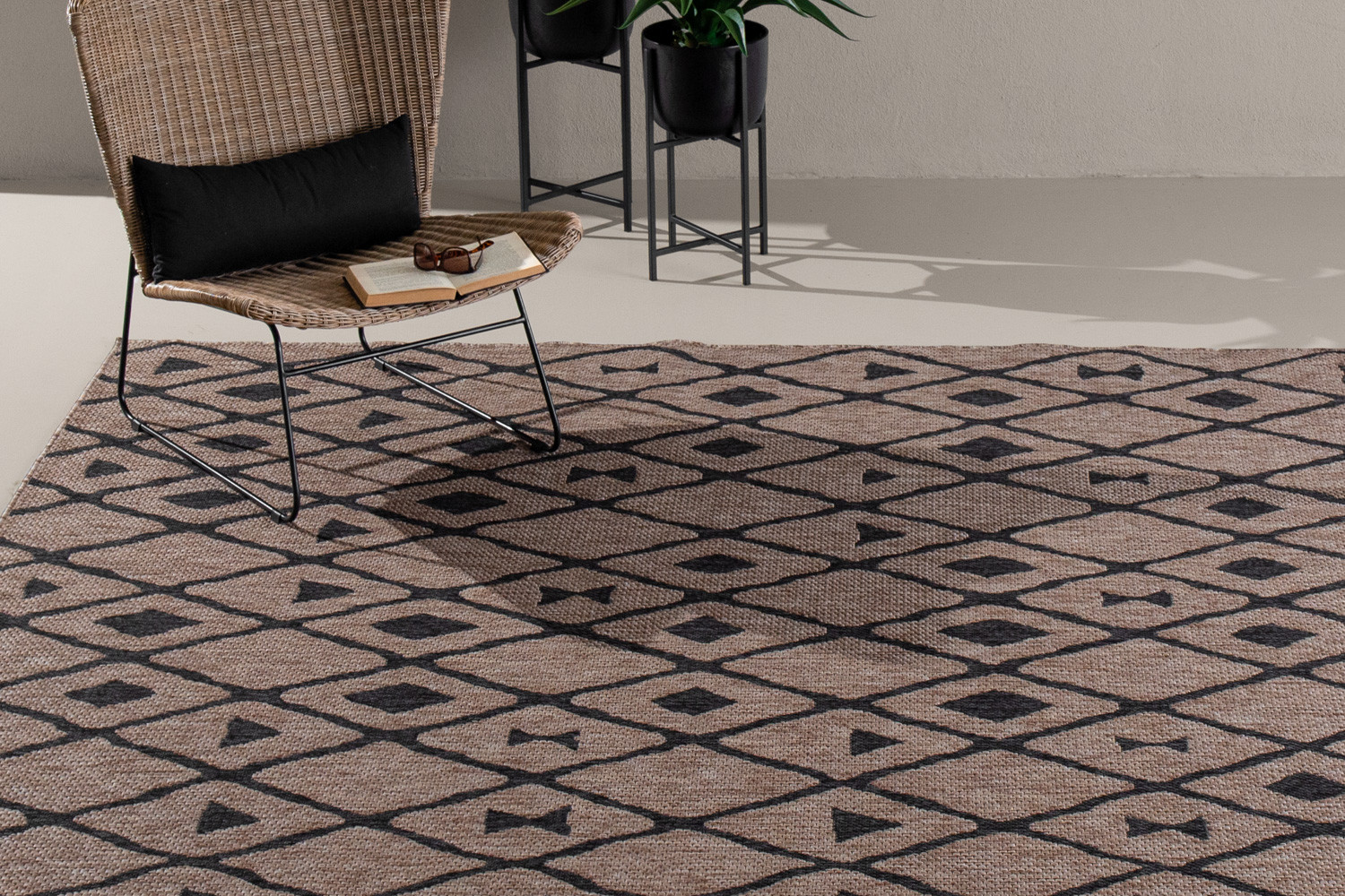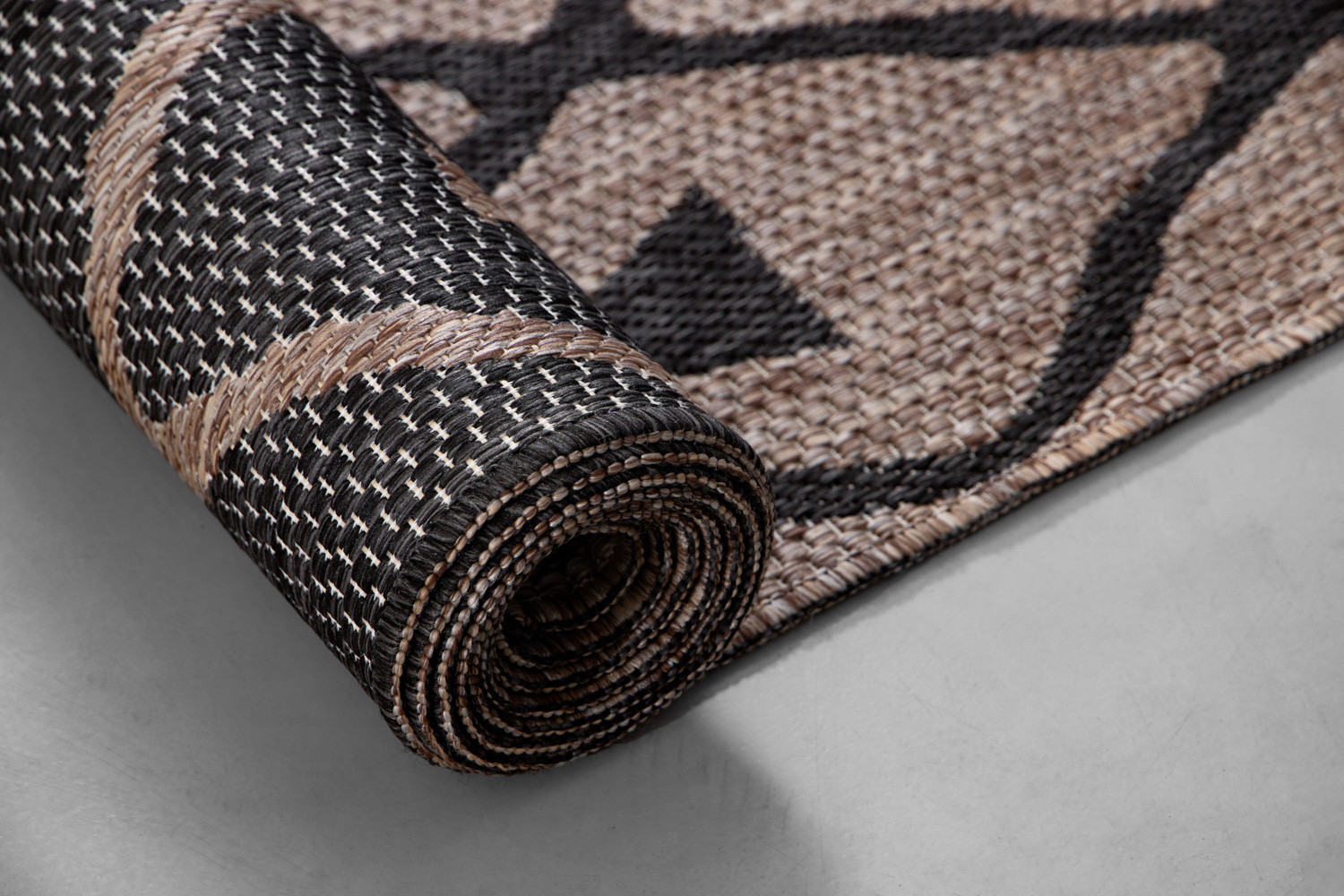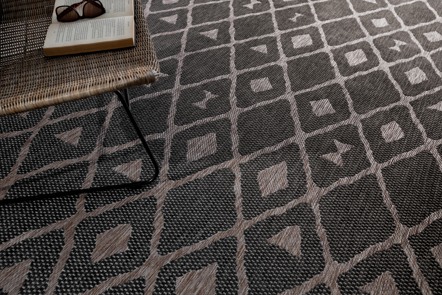 Bring bohemian charm to your living space with the Terra Reversible Patio Rug, a versatile and stylish décor piece woven to impress. Featuring natural tones accented with dark details and geometric patterns, this rug catches the eye in any setting. Imported from Turkey, its warm textures and bohemian-inspired design make it an inviting and practical addition to indoor and outdoor spaces. The Terra is also reversible, giving you greater versatility for your décor arrangements.