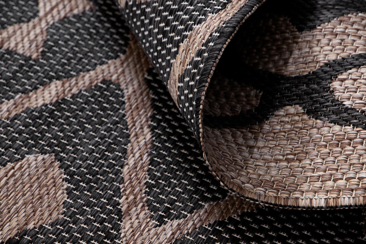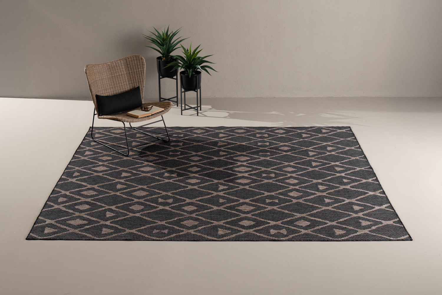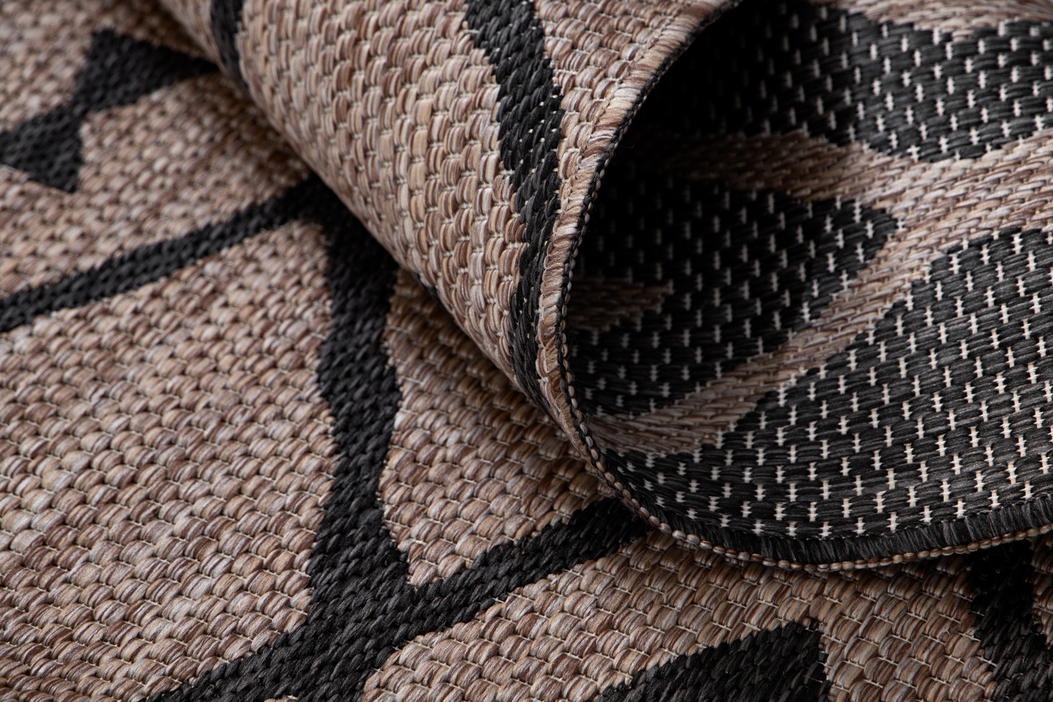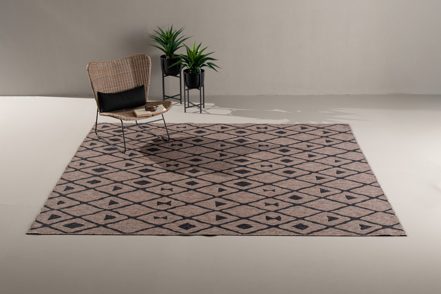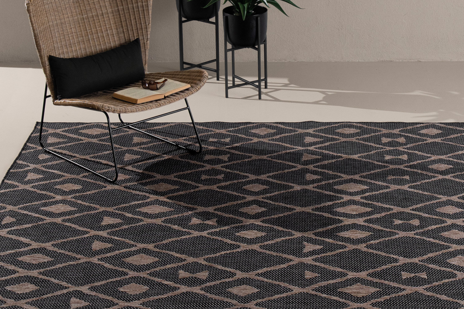 Bring bohemian charm to your living space with the Terra Reversible Patio Rug, a versatile and stylish décor piece woven to impress. Featuring natural tones accented with dark details and geometric patterns, this rug catches the eye in any setting. Imported from Turkey, its warm textures and bohemian-inspired design make it an inviting and practical addition to indoor and outdoor spaces. The Terra is also reversible, giving you greater versatility for your décor arrangements.