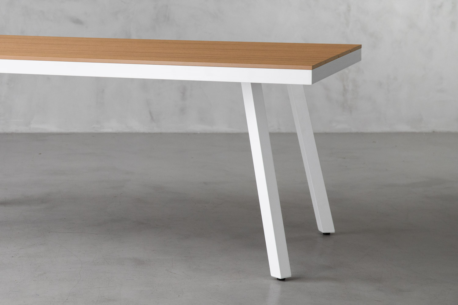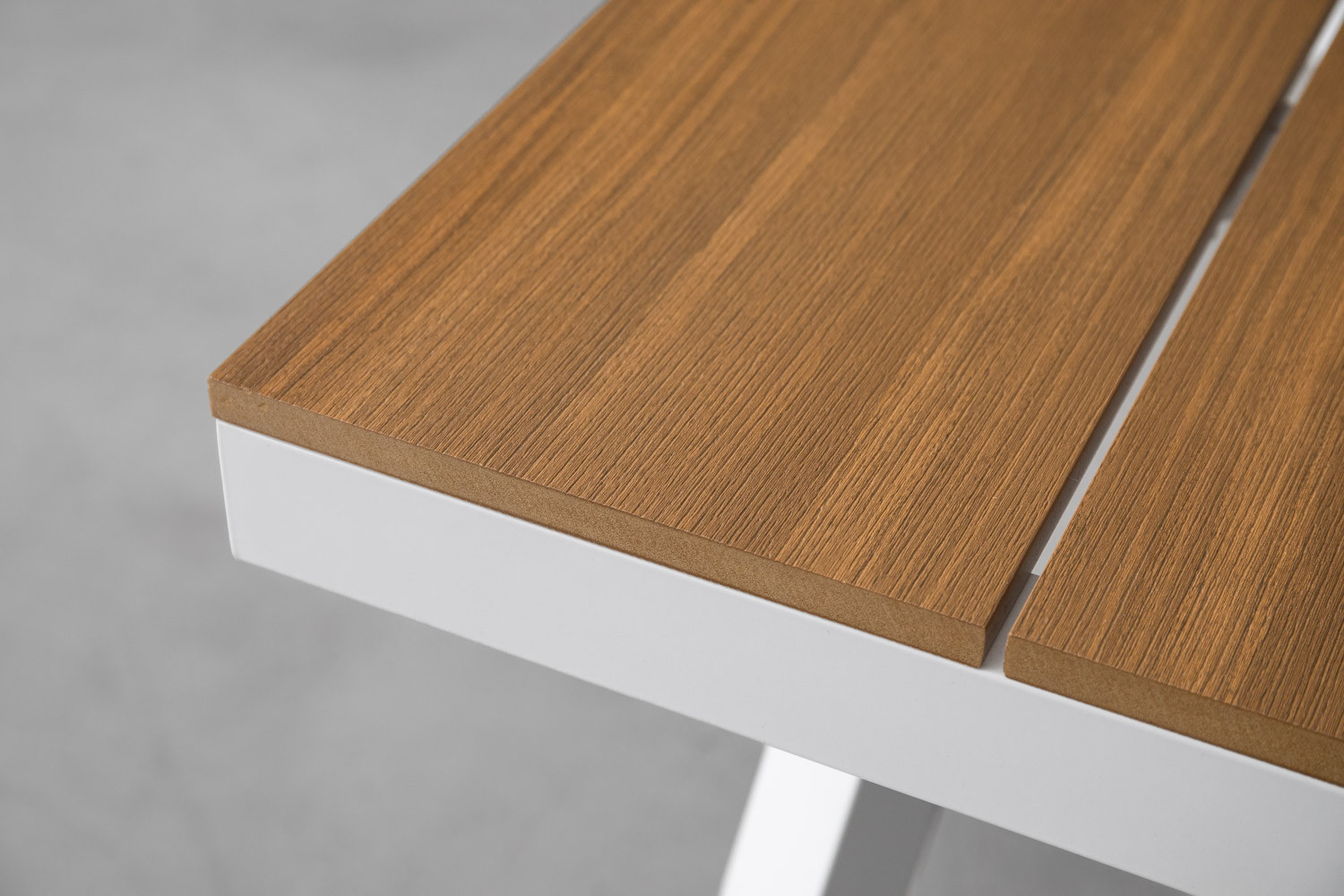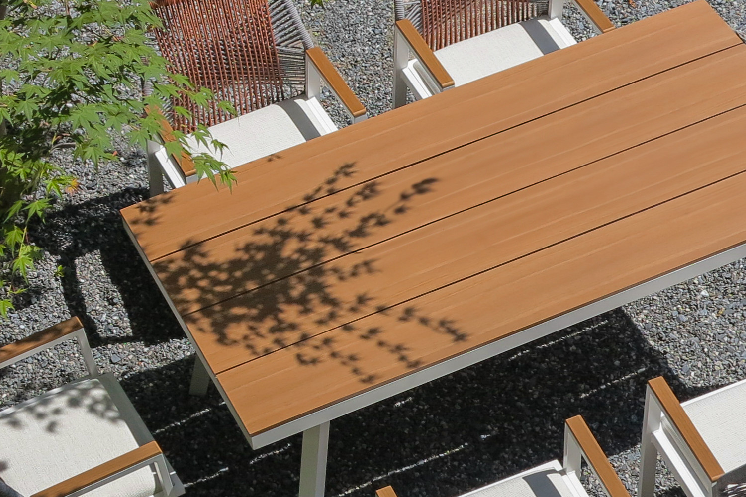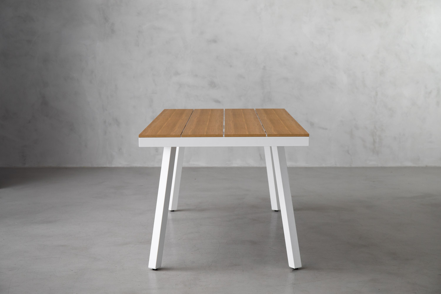 Gather around the Sultana Patio Dining Table, a modern wonder of polywood craftsmanship. Its aluminium frame and sleek white legs support the spacious, warm tabletop with its satisfying wood grain. It's the quintessential centerpiece for those who enjoy contemporary outdoor dining with a touch of grandeur.