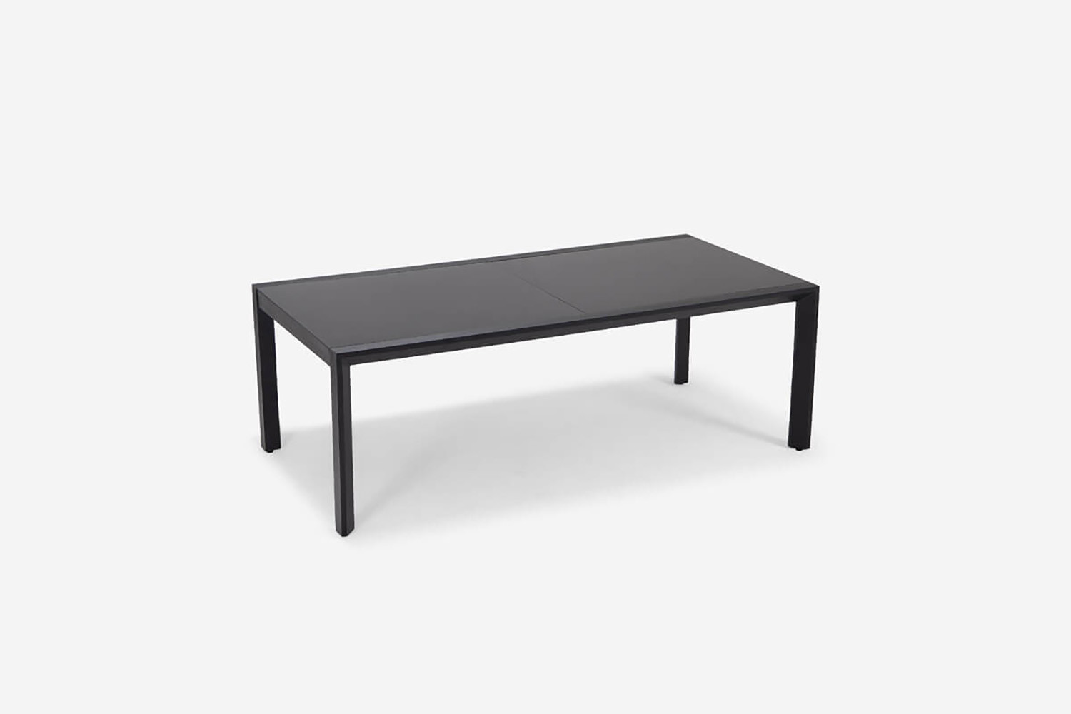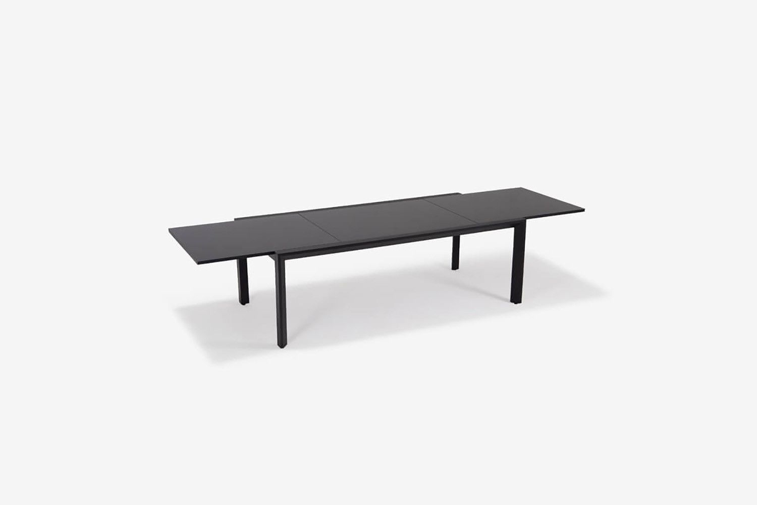 The table is crafted with a durable high quality aluminium frame and features a sleek black glazed tempered glass top which easily extends to accommodate up to 4 additional guests.