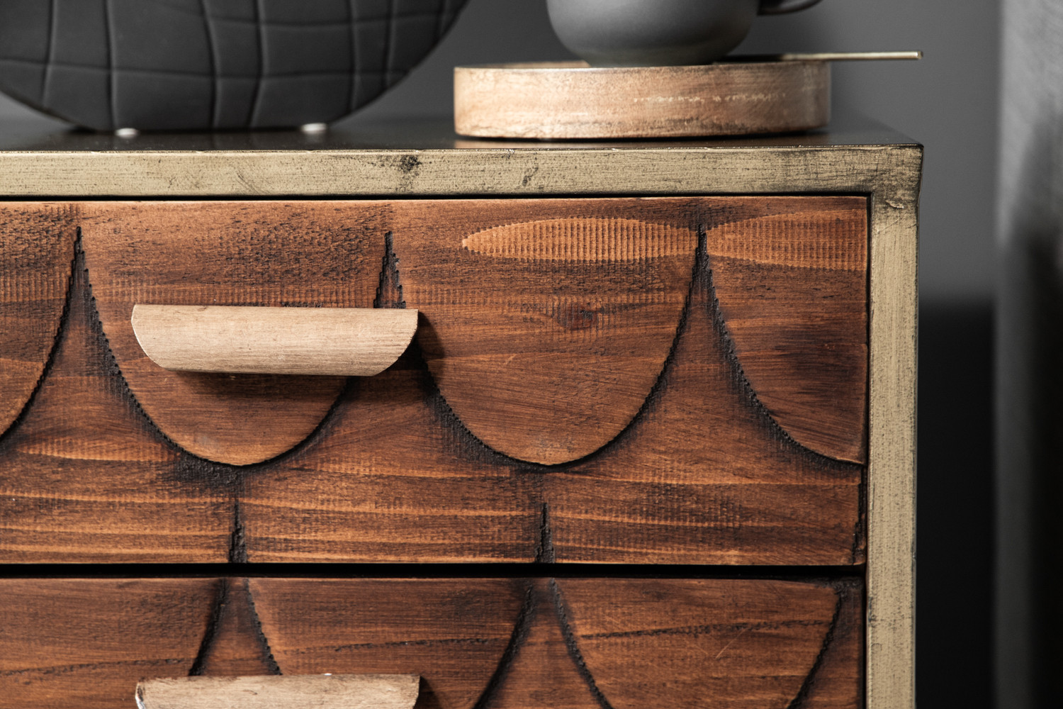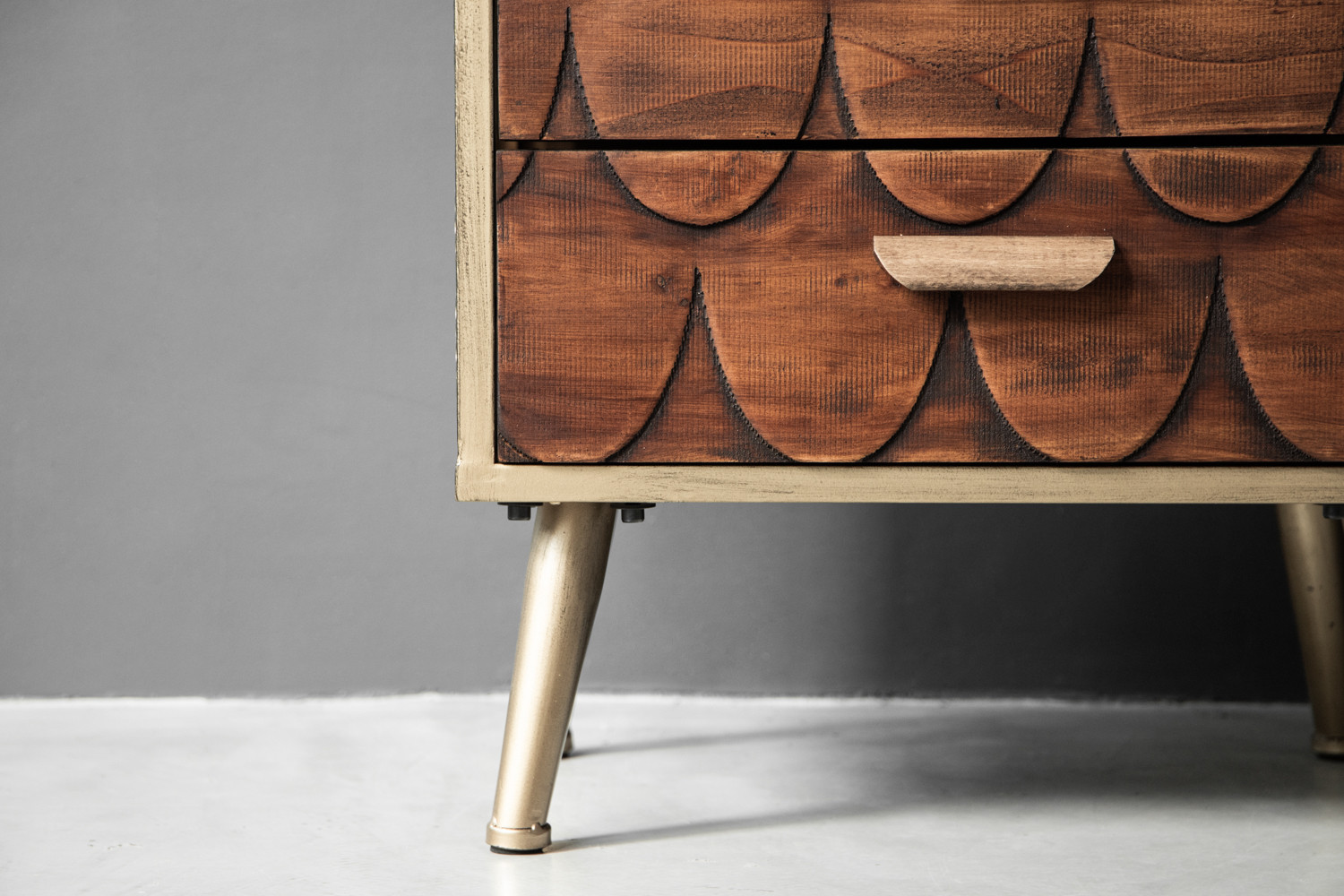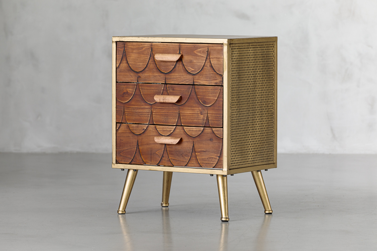 Inspired by Eastern design elements, the pedestal contrasts natural wood and geometric patterns with a golden finish on the legs and frame, giving an overall effect that’s both warm and exotic with a touch of glam.