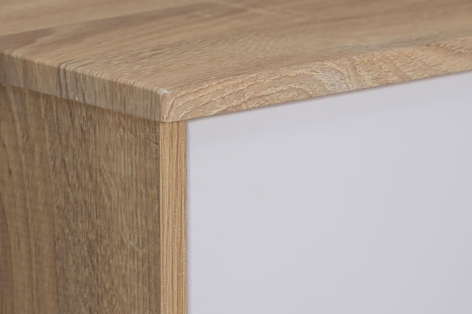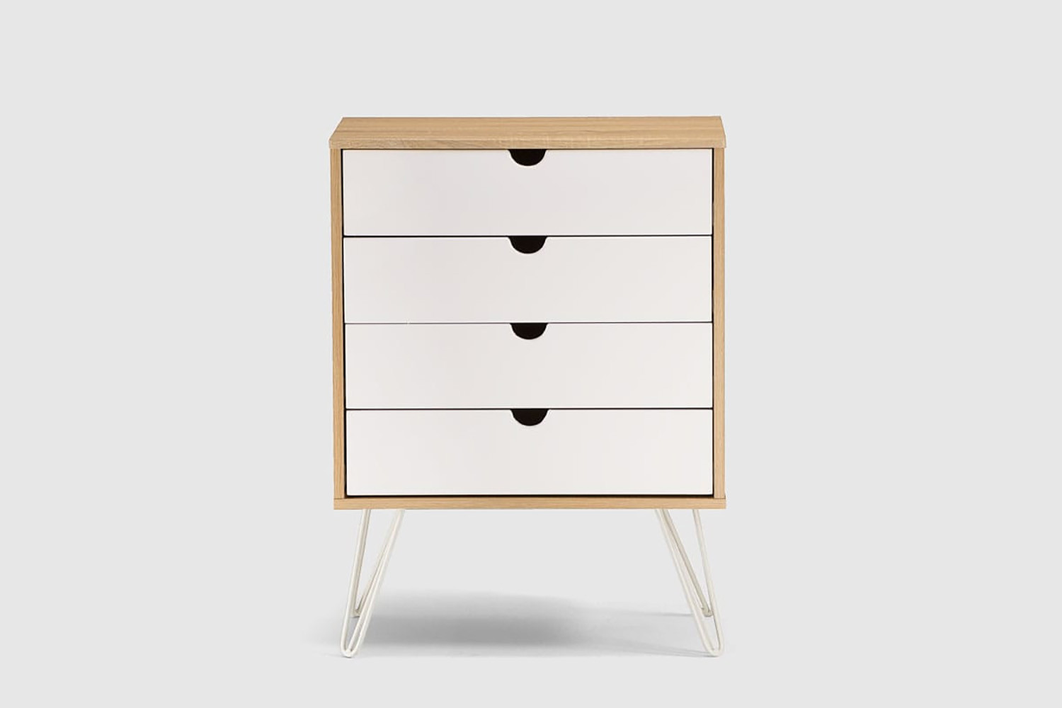 The Tom 4-Drawer Cabinet brings a fresh and relaxing look to inspire and amplify your bedroom space. This mid-century modern bedside table features 4 ample drawers in a solid frame constructed from MDF and PVC, with hairpin legs adding a classic touch. The two-tone design blends white and natural wood tones, bringing together a perfect blend of classic and modern elements.