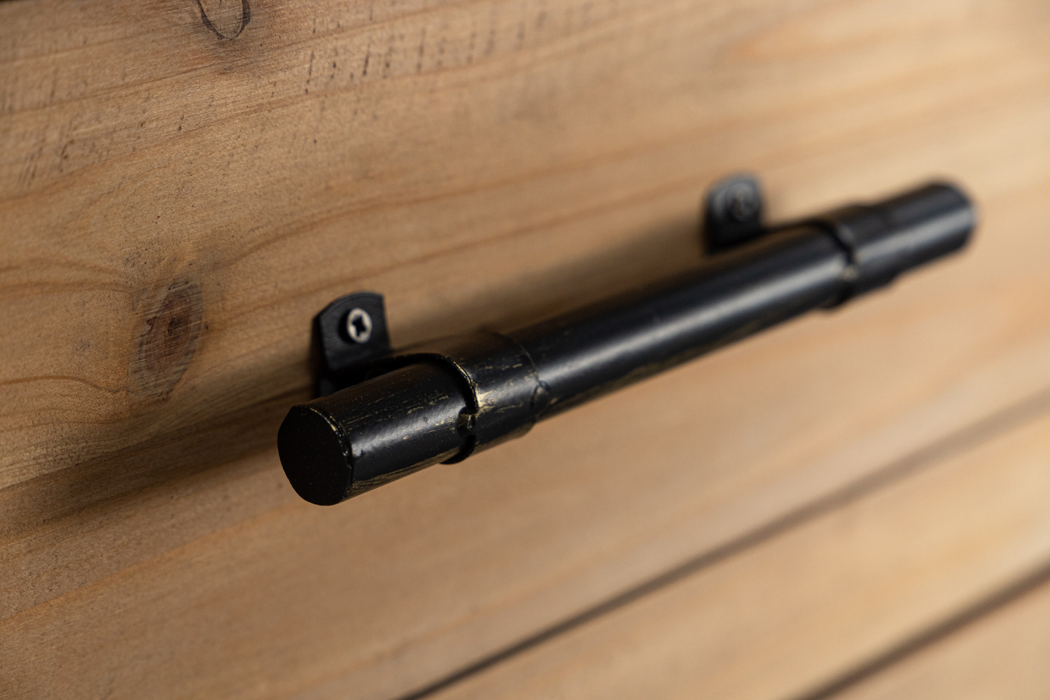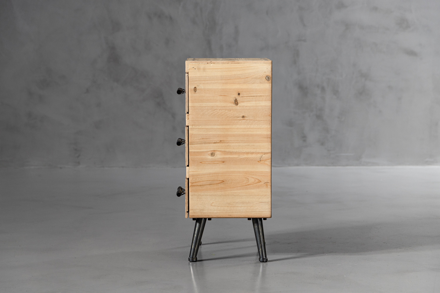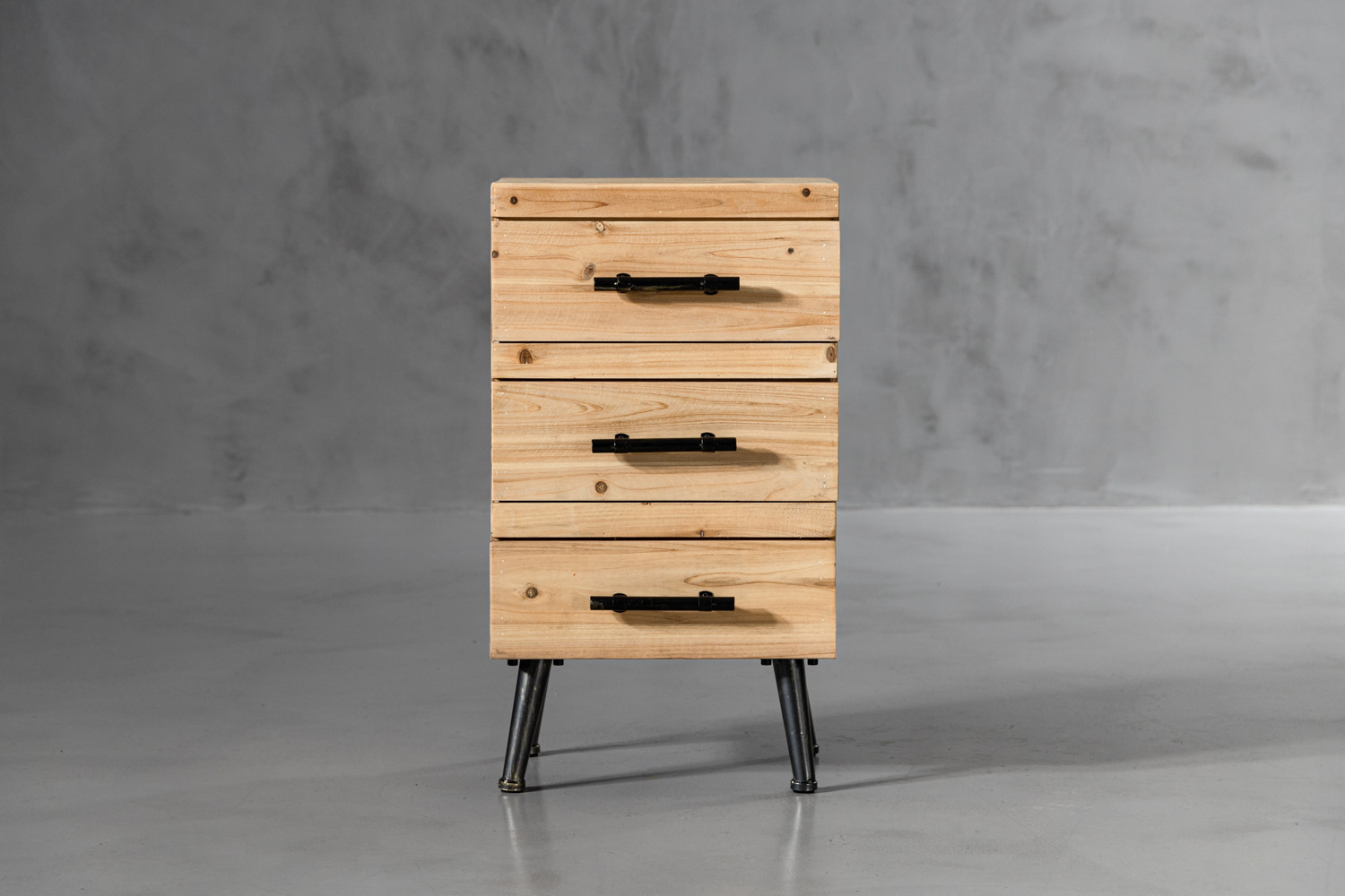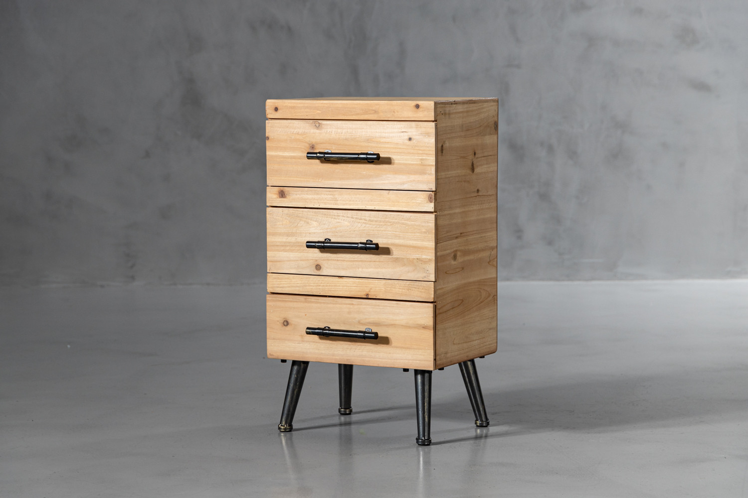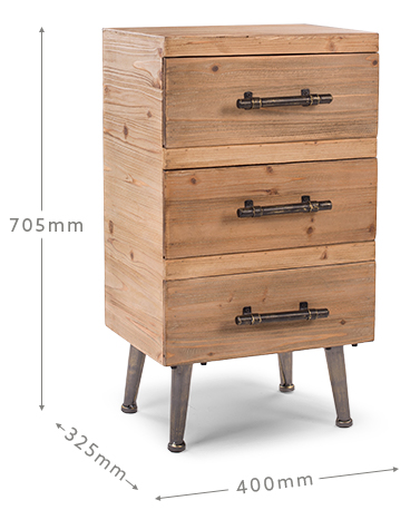 Constructed from strong, hardwearing and lightweight Fir wood, the pedestal boasts a naturally warm, neutral wood finish, which is complemented by dark brushed metal drawer handles and feet, giving the piece a subtle industrial flavour.