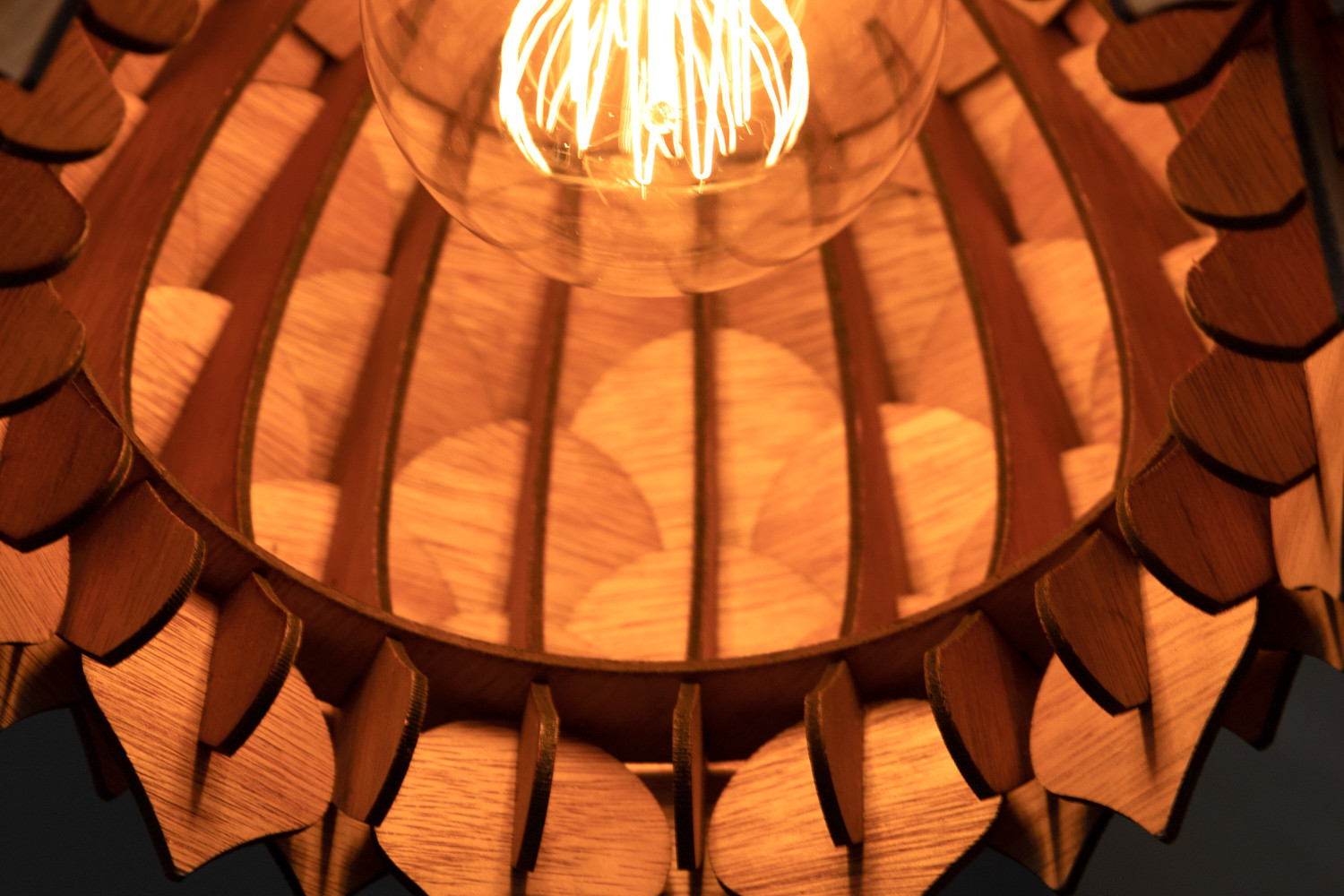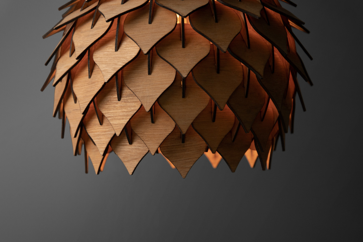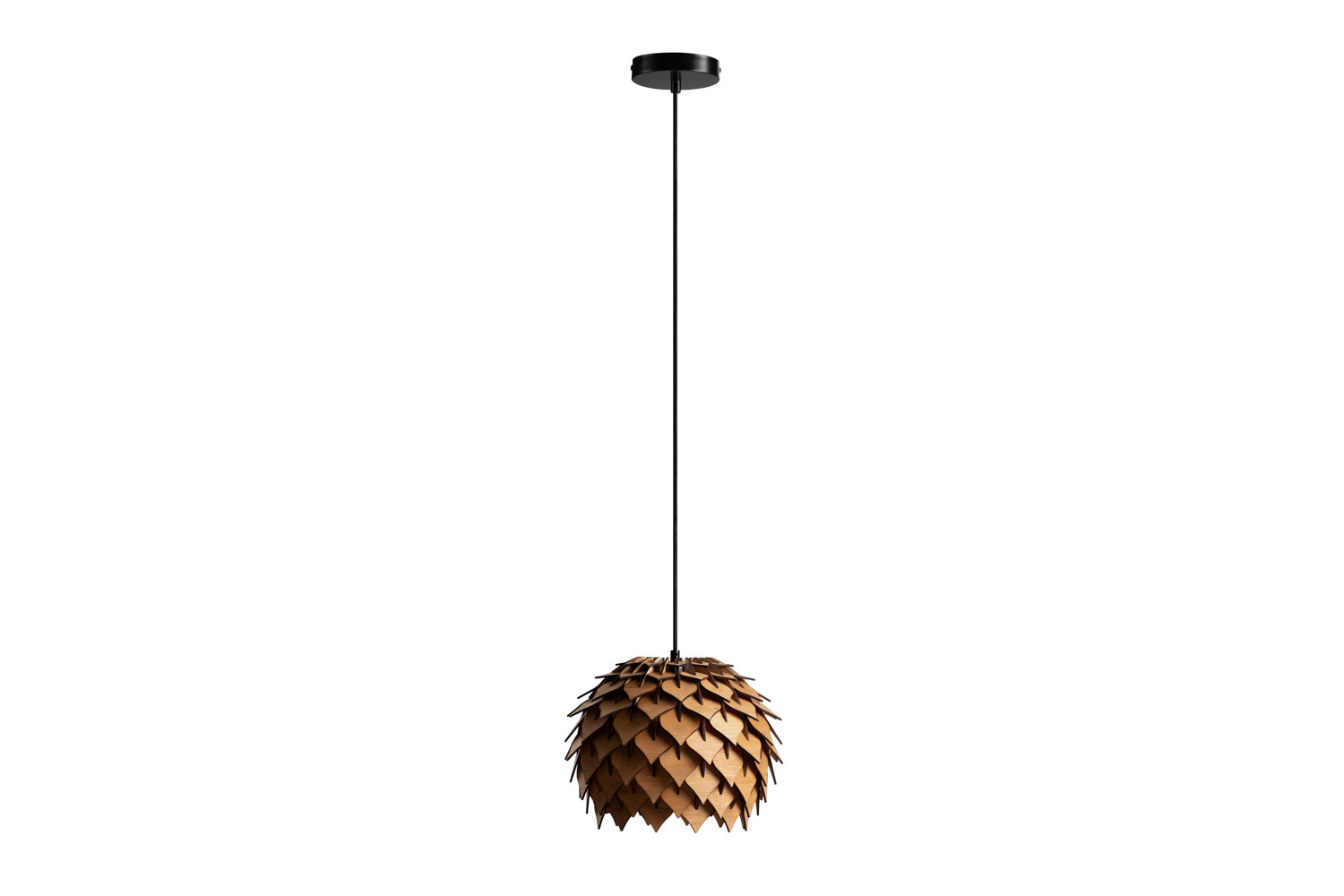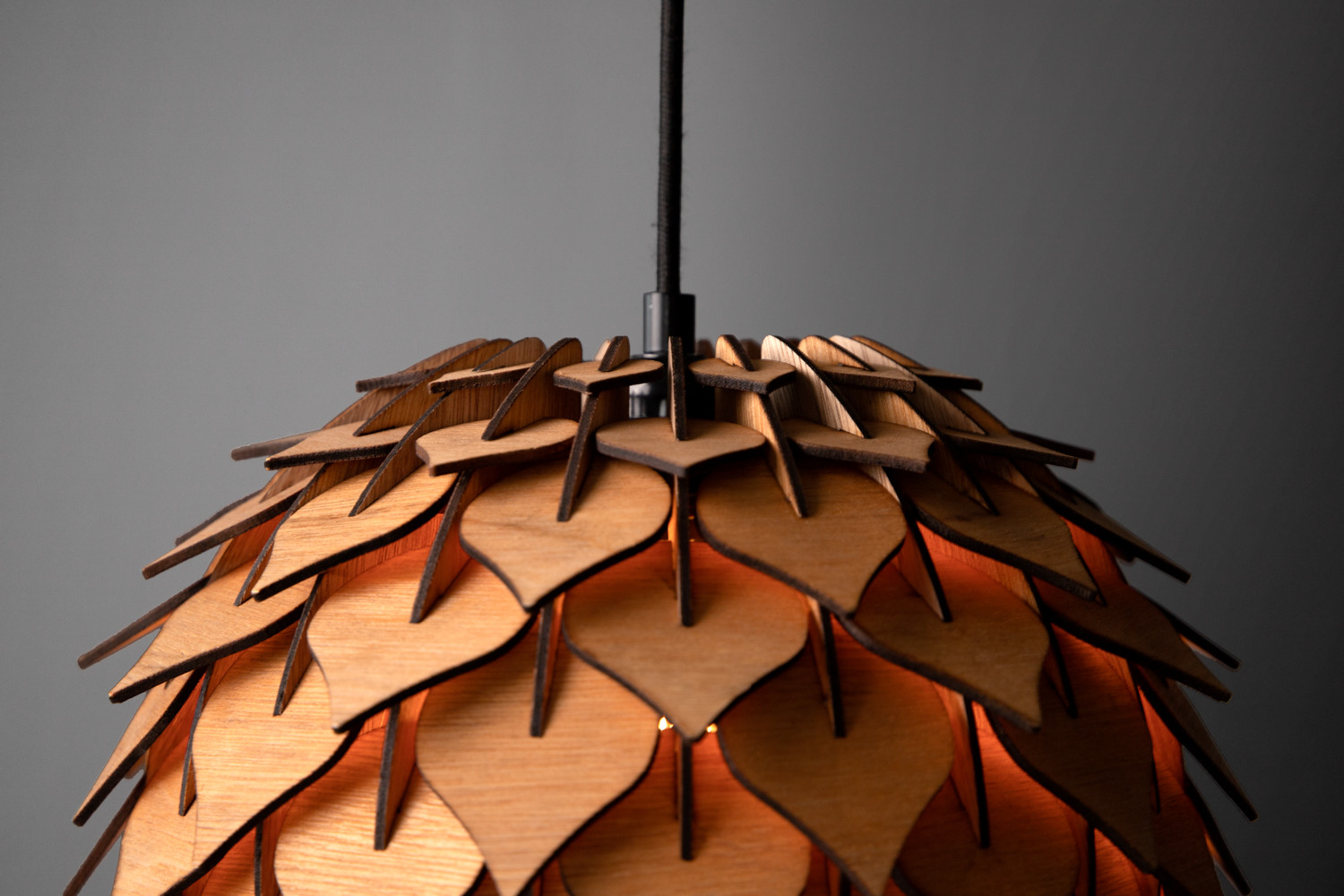 The Akila Pendant is a natural wood pendant light designed in a distinctive pattern reminiscent of natural flora, making this pendant light a functional décor feature. The laser cut wooden panels are expertly placed creating a beautiful layered effect. The masterfully crafted pendant is fitted with a black braided nylon woven cord.