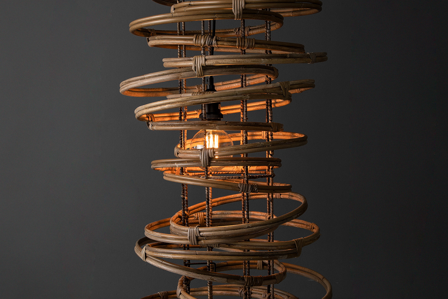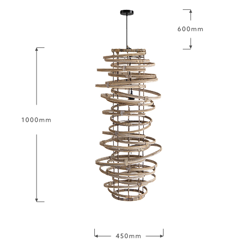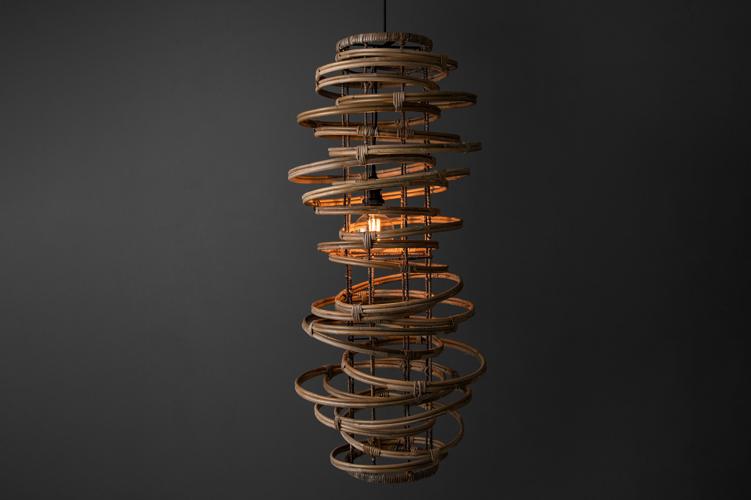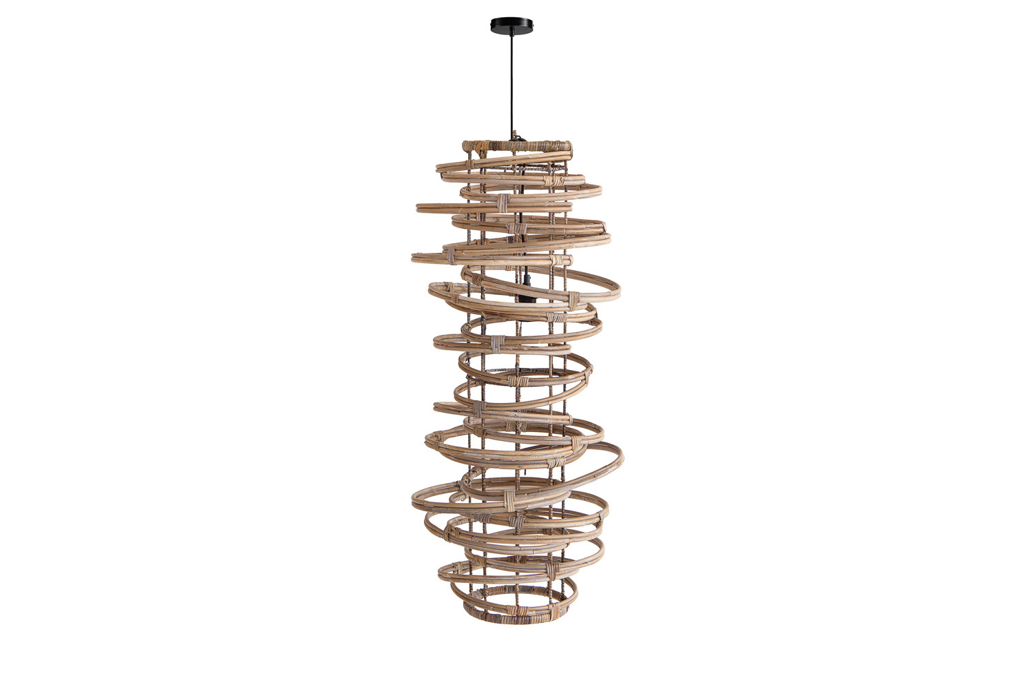 The Arya Kubu Pendant is a natural rattan pendant light featuring a beautiful spiral design. This pendant light is masterfully crafted by weaving rattan into its unique helix shape around a black braided nylon woven cord.