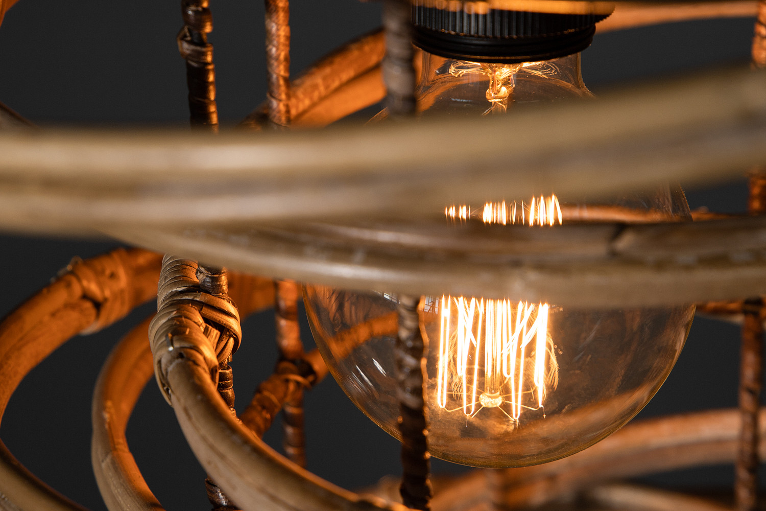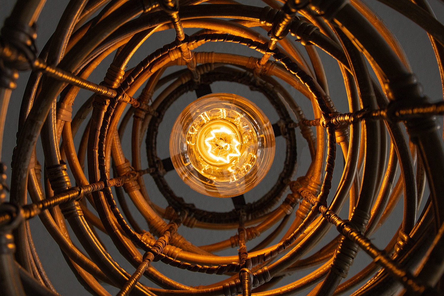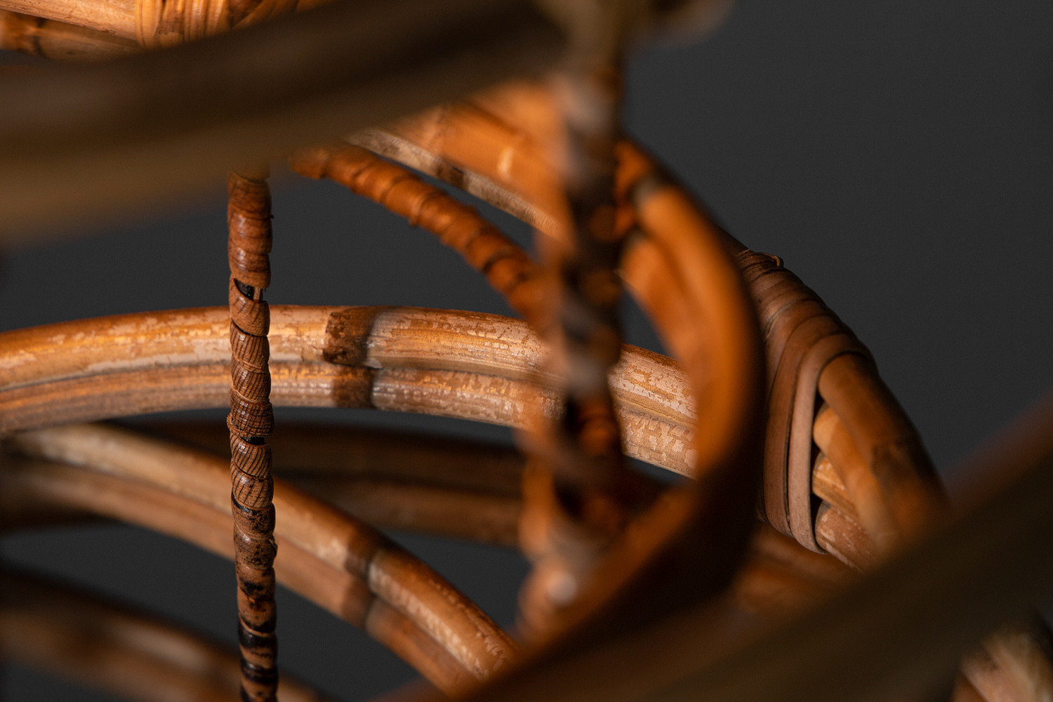 The Arya Kubu Pendant is a natural rattan pendant light featuring a beautiful spiral design. This pendant light is masterfully crafted by weaving rattan into its unique helix shape around a black braided nylon woven cord.