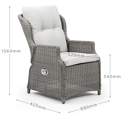 Reno Reclining Patio Chair: 625mm (L) x 880mm (W) x 1060mm (H) | Seat Height: 540mm | Seat Depth: 520mm