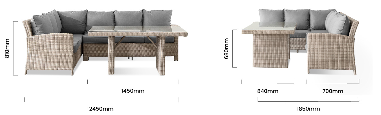 Corner Unit: 700mm (L) x 2450mm (W) x 1850mm (W) x 810mm (H) | Seat Height: 430mm