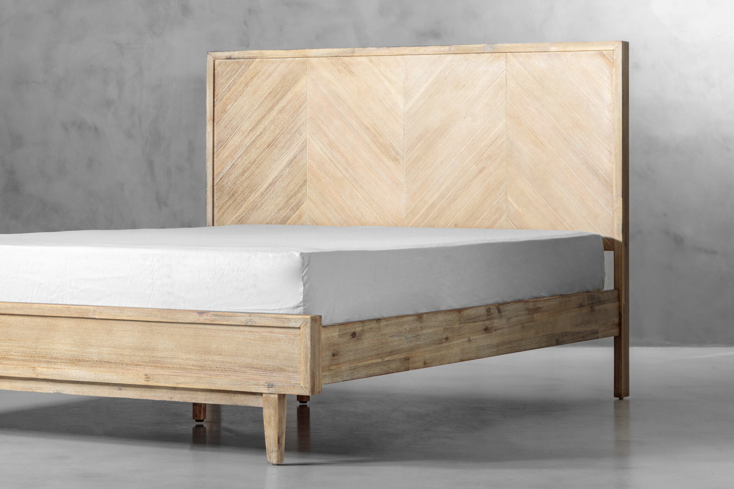 Transform your bedroom into a haven of tranquility with the McKenna Bed, skillfully handcrafted, it boasts a built-in headboard and distinctive chevron pattern facings. Light-toned Acacia wood with a brushed finish, merges timeless elegance and contemporary design for a serene retreat that tells a unique story.