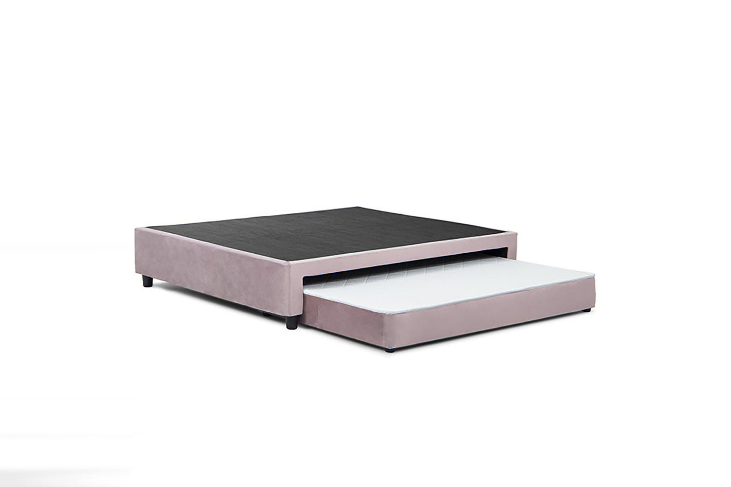 - A modern, upholstered bed base with an additional sleek pull-out bed base