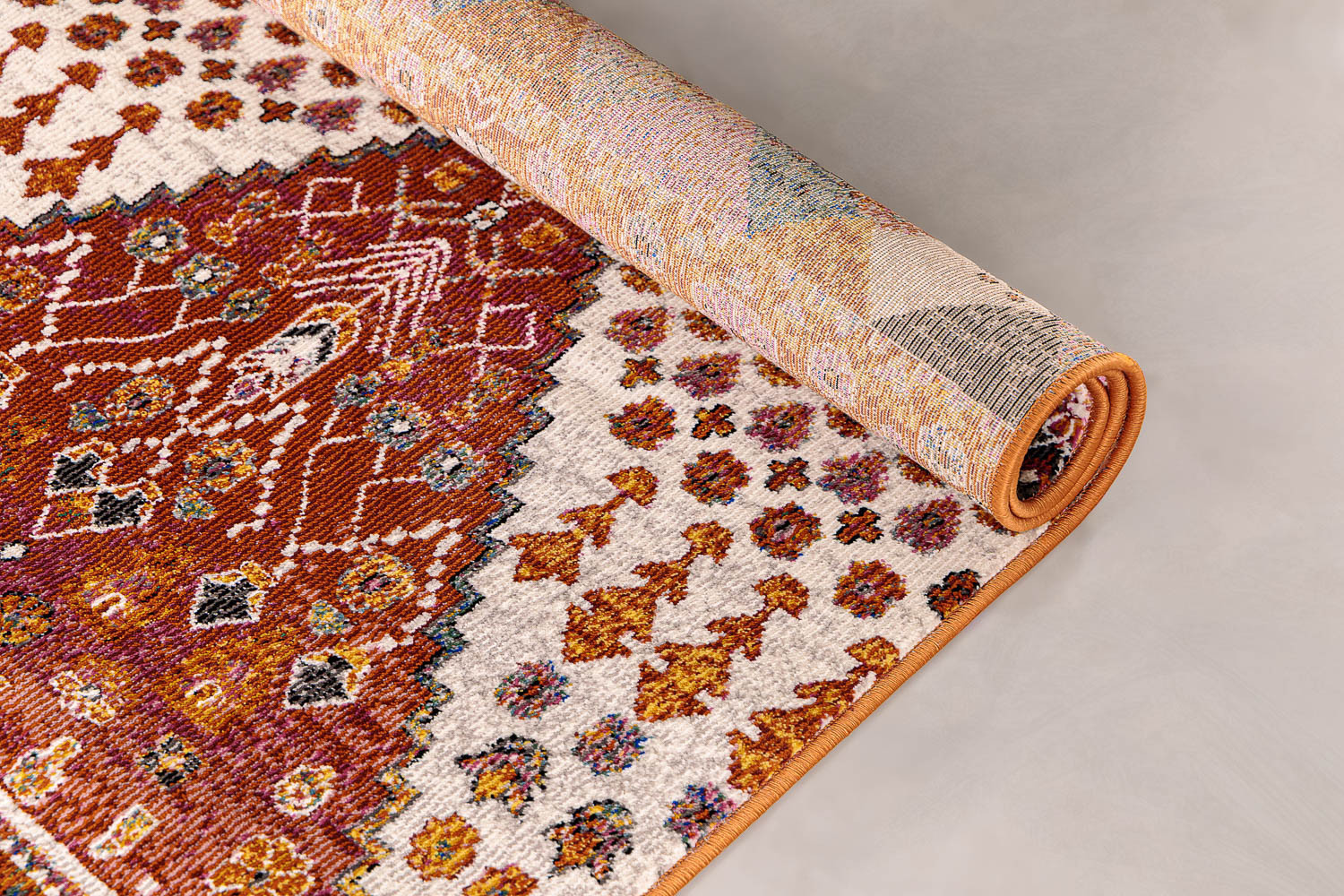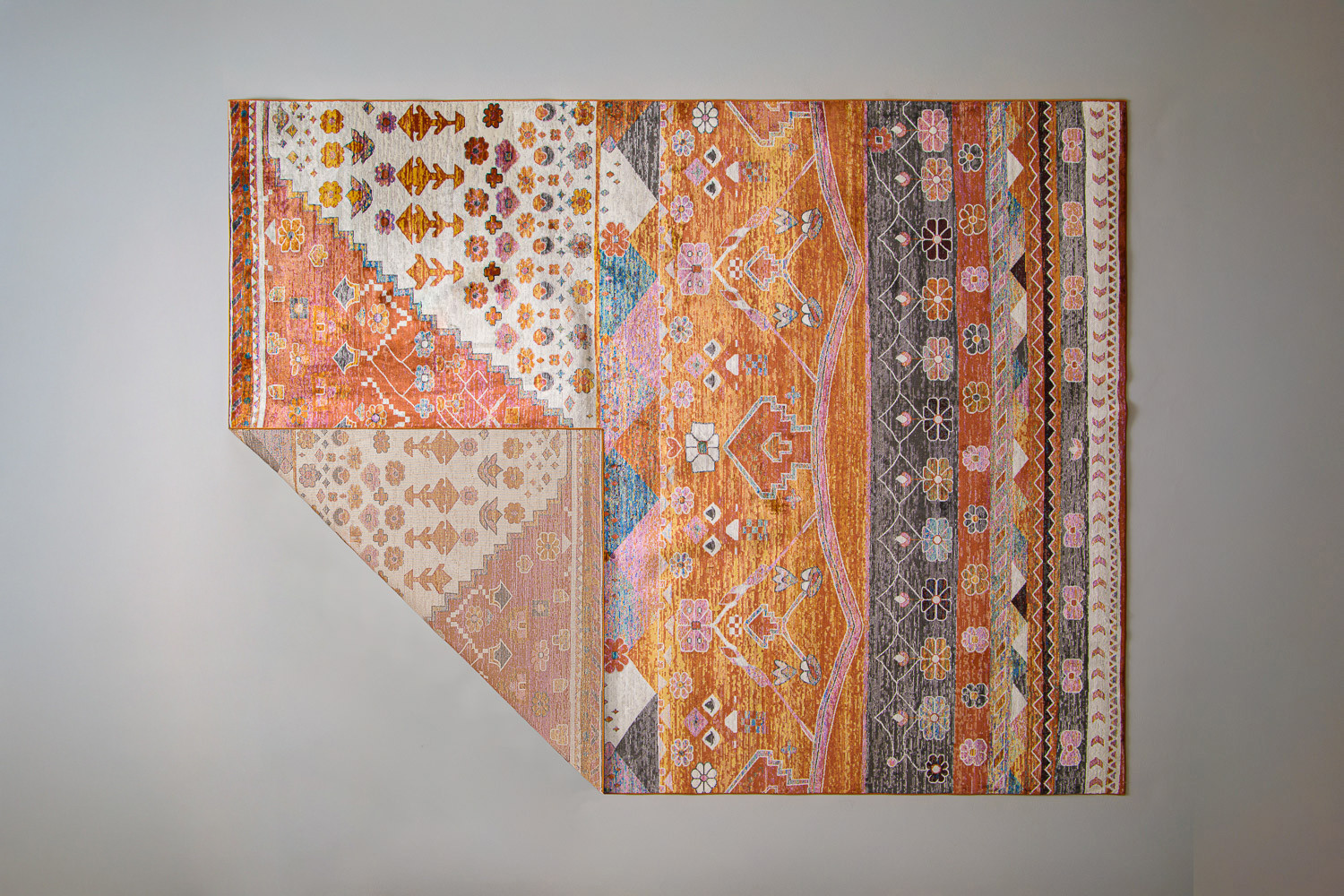 The Batu Rug brings vibrant, artisanal energy to any interior. Woven in Turkey, its kilim-inspired pattern layers warm terracotta, saffron, charcoal and ivory tones to create instant character. This low-profile, easy-care weave feels soft underfoot yet stands up to everyday living, serving as a beautiful, eye-catching living room anchor.