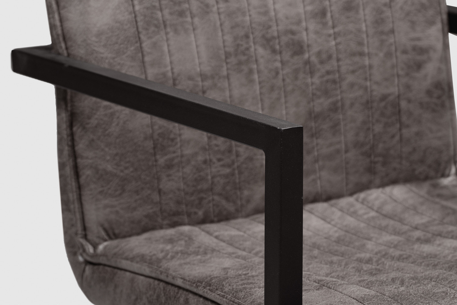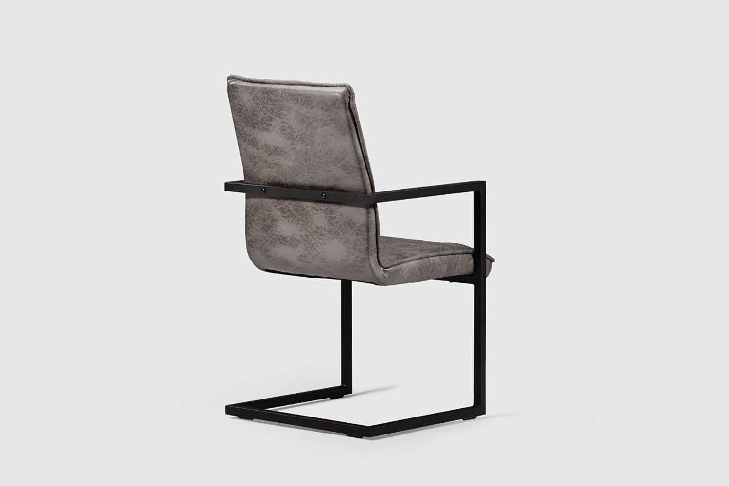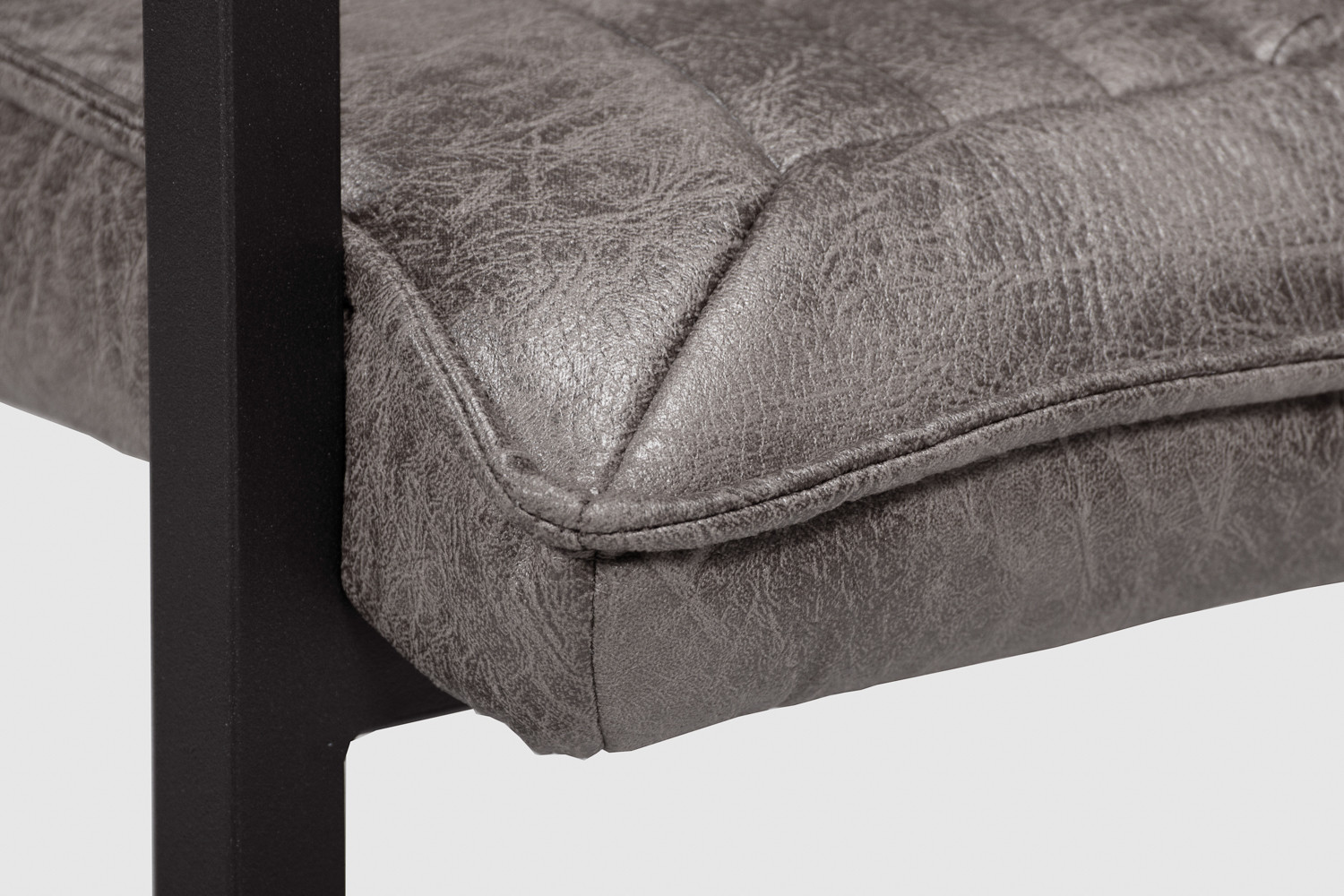 This contemporary dining chair fuses metal construction upholstered in a high-quality polyester fabric with a leather appearance.
