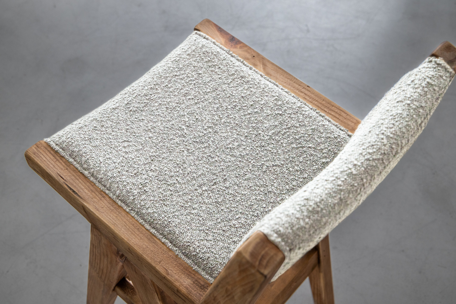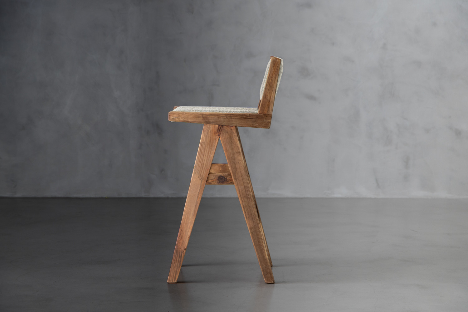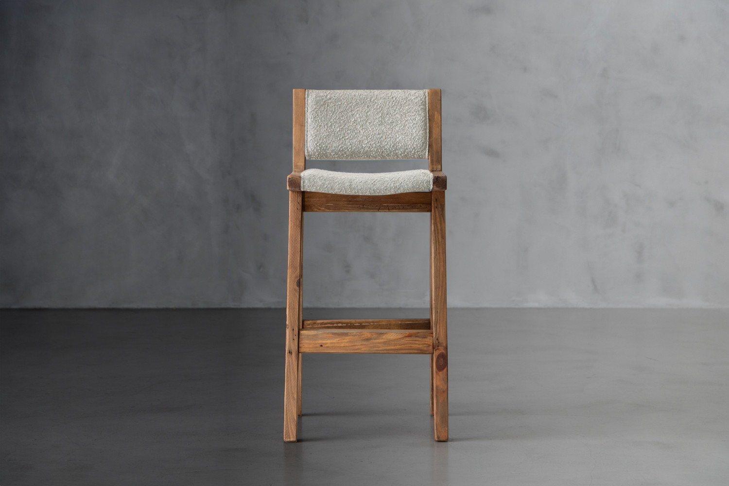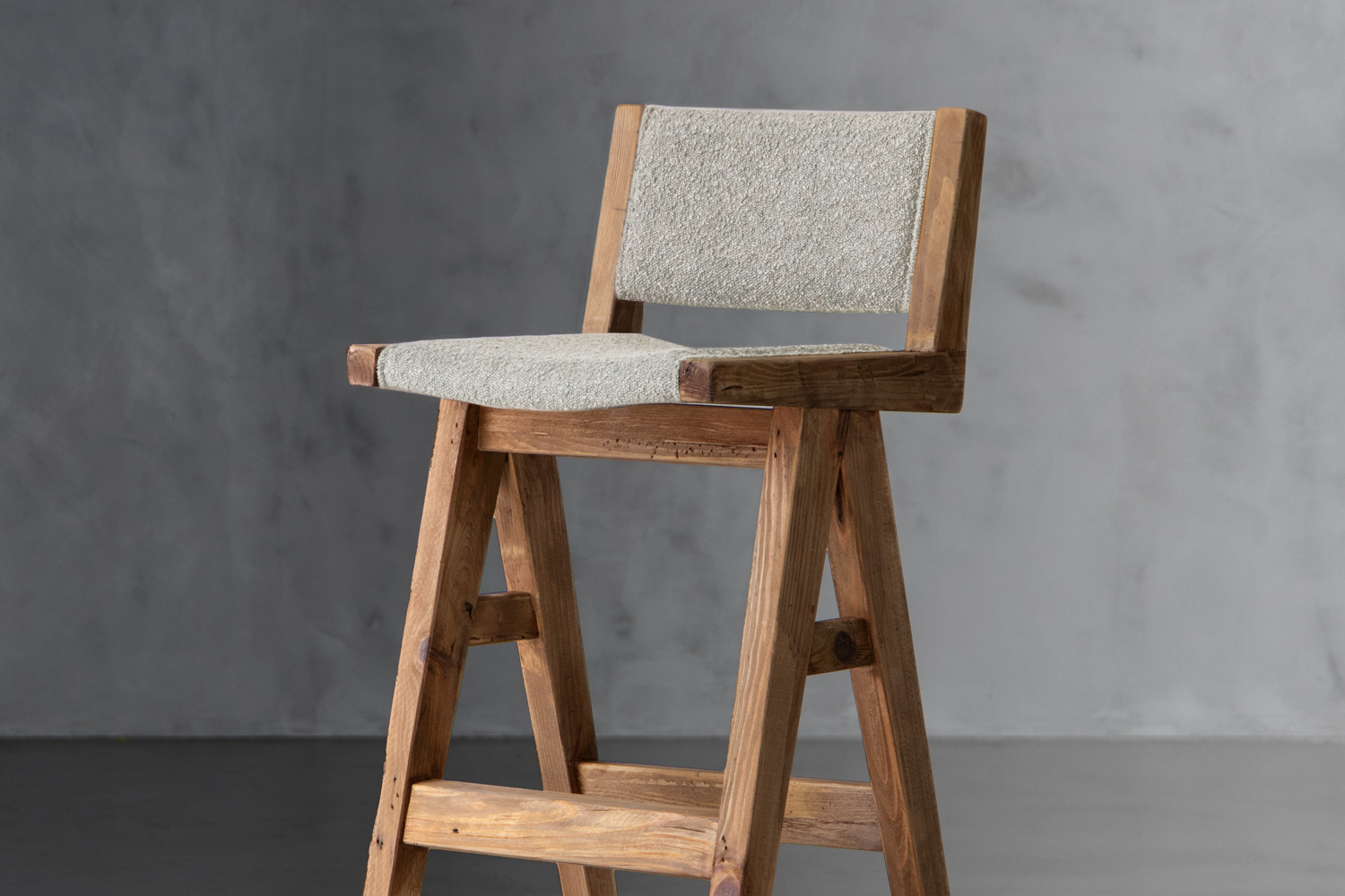 The Sandor Tall Bar Chair, a masterpiece in furniture design, offers an unparalleled blend of luxury and sustainability. Crafted from solid reclaimed pine, it exudes an eco-friendly elegance. The chair's seat is upholstered in sumptuous fabric that promises comfort and sophistication, making it a perfect statement piece for any upscale interior.