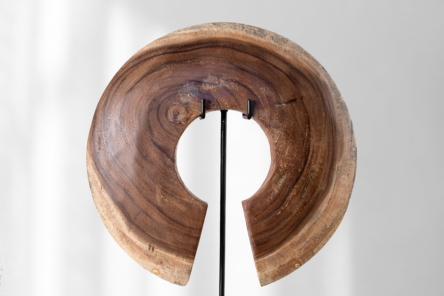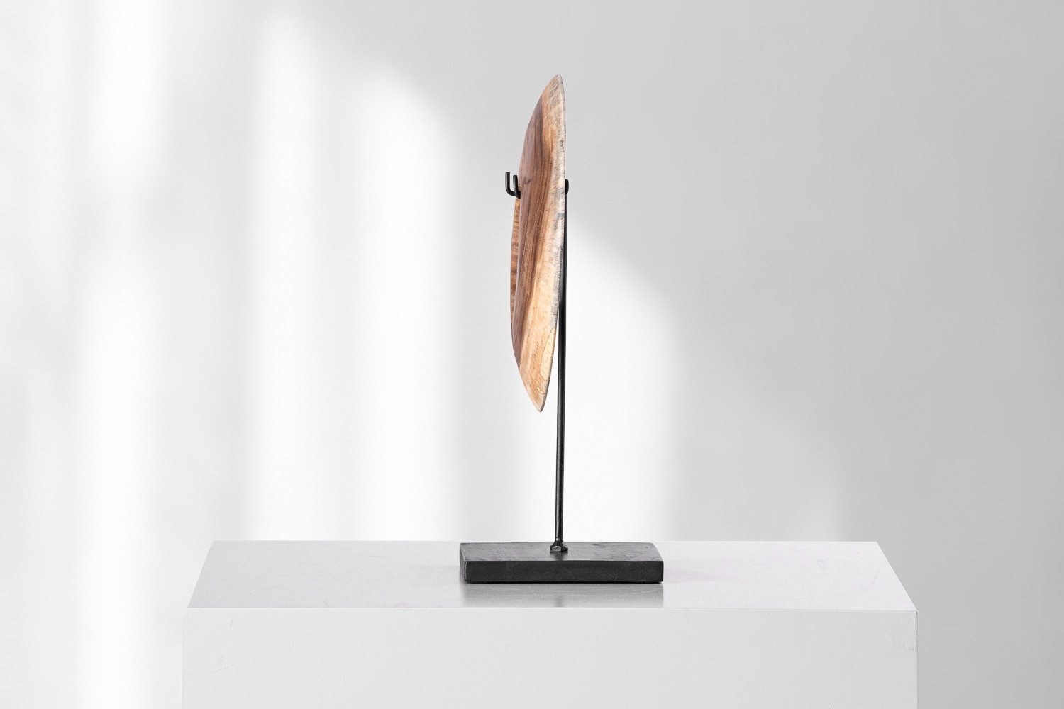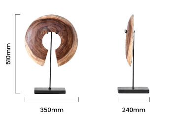 The dark natural tones of the wood, enhanced by an antique-inspired finish, give the sculpture a rich and sophisticated appearance. Resting on a sturdy black mild steel base, it stands tall and stable, making it a versatile addition to mantels, sideboards, or entryway consoles.