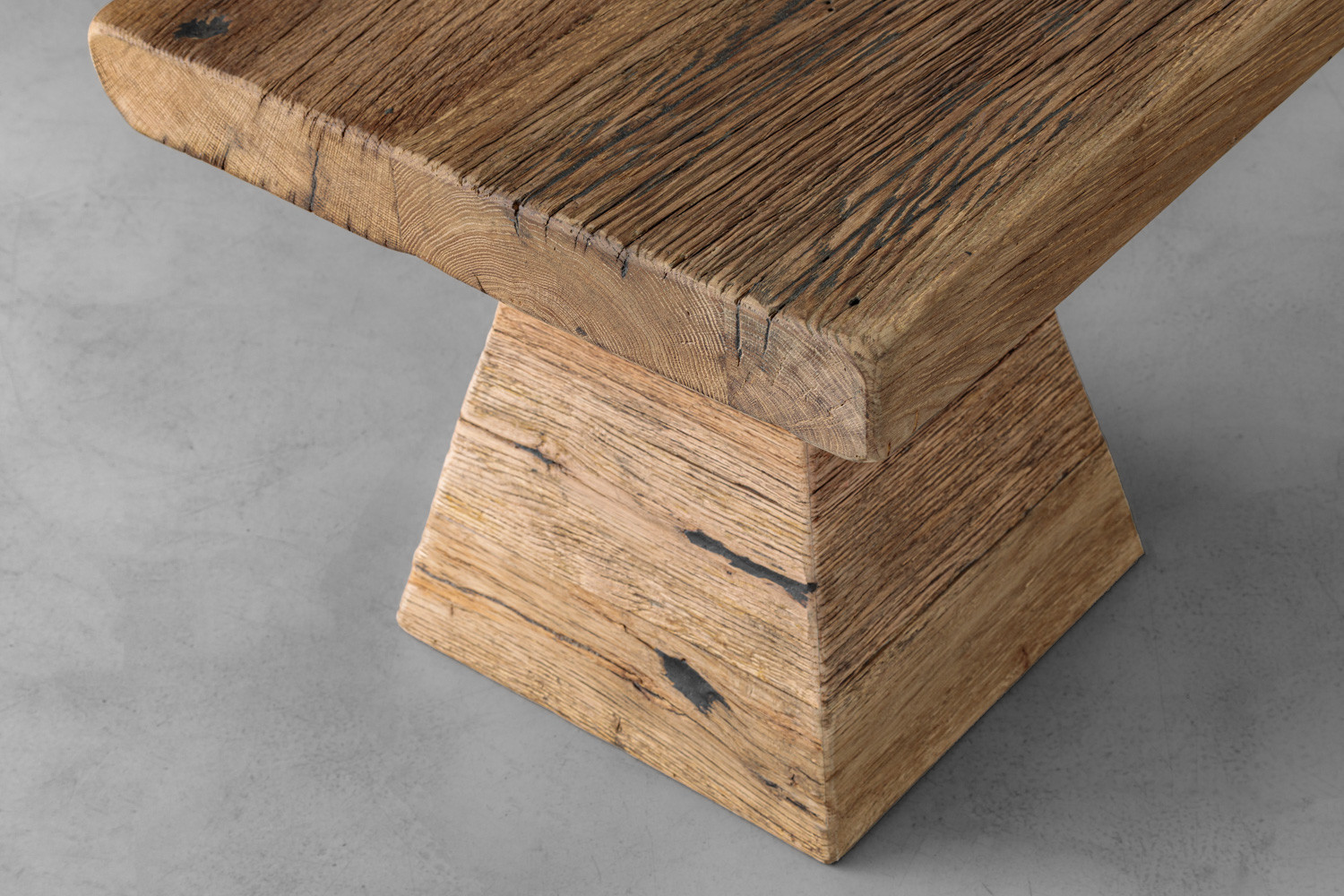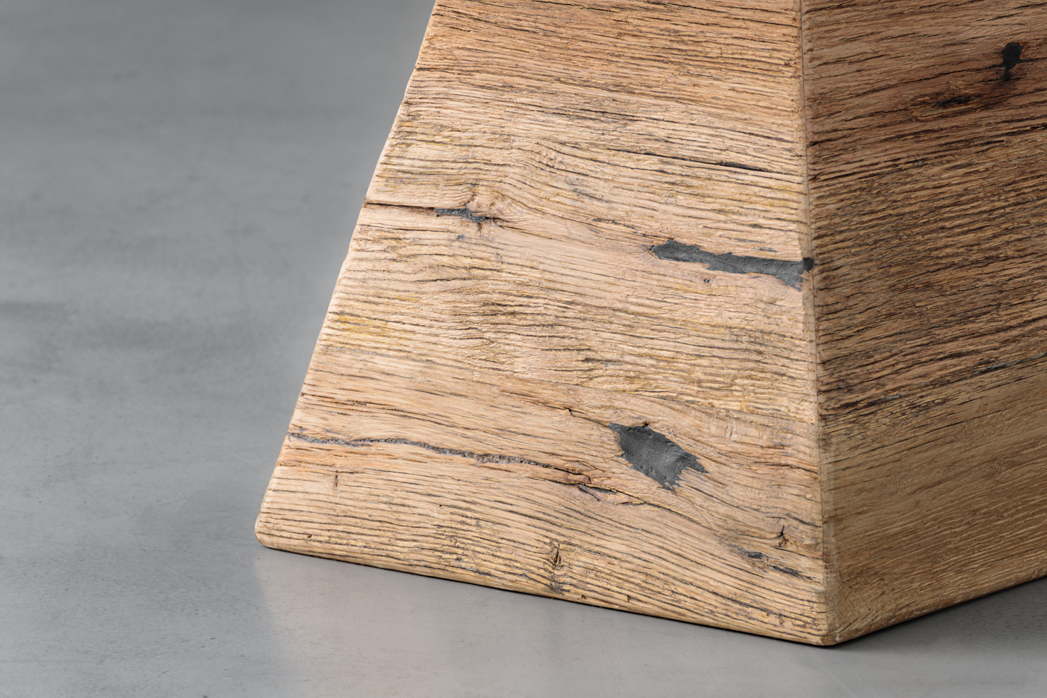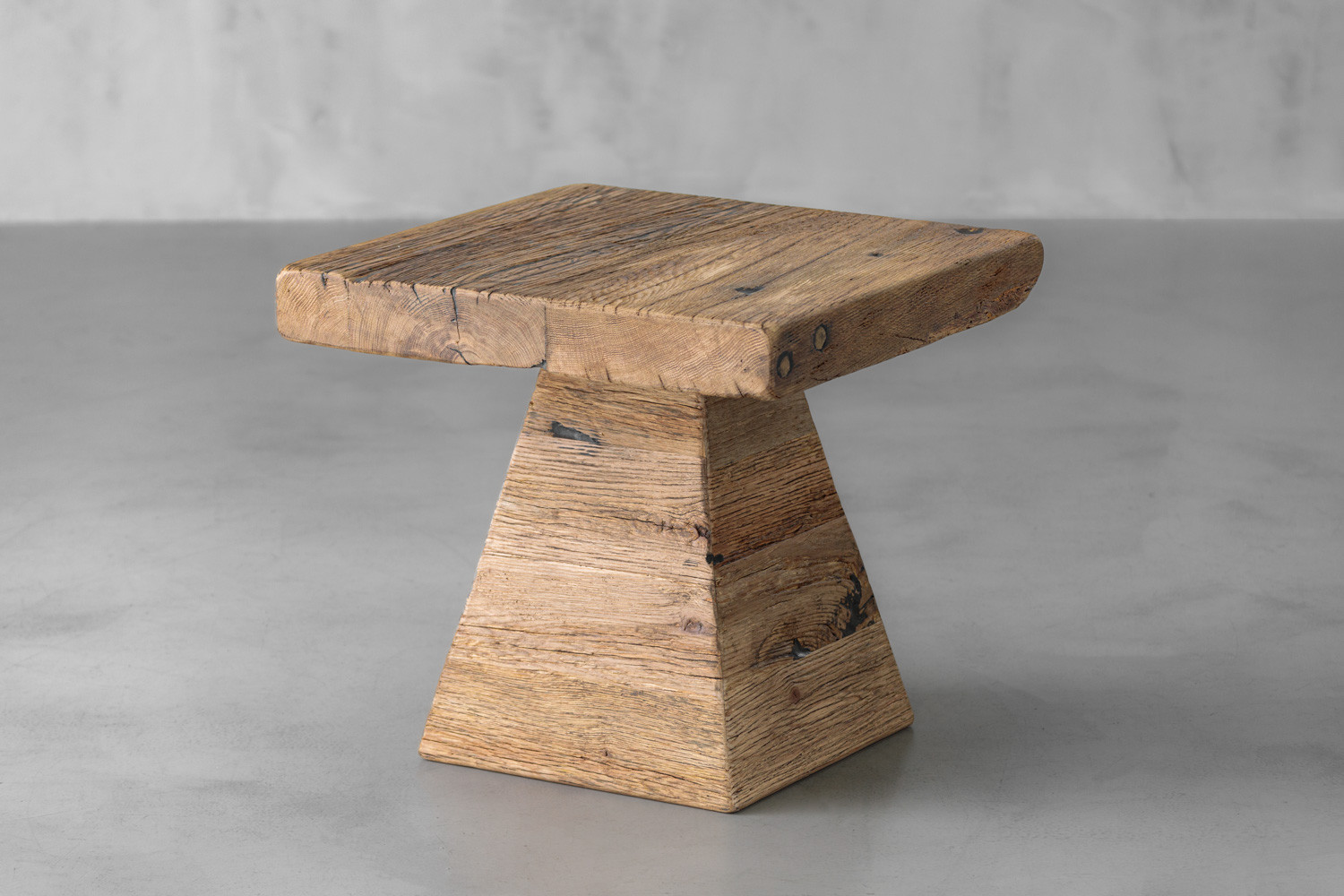 Take in the rustic charm of the Anakin Side Table, a masterpiece crafted from solid reclaimed oak. Its bold angular design creates a statement of strength and durability. This premium side table, with its rich textures and grains, brings an earthy elegance to any space, making it a luxurious addition to your home.