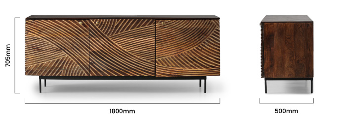The Dontae Sideboard is the pinnacle of modern furniture design. Its solid mango wood construction incorporates a stunning wave pattern that flows across its entire facade. The combination of functionality and aesthetic appeal will elevate your dining area in a tasteful and sophisticated manner.