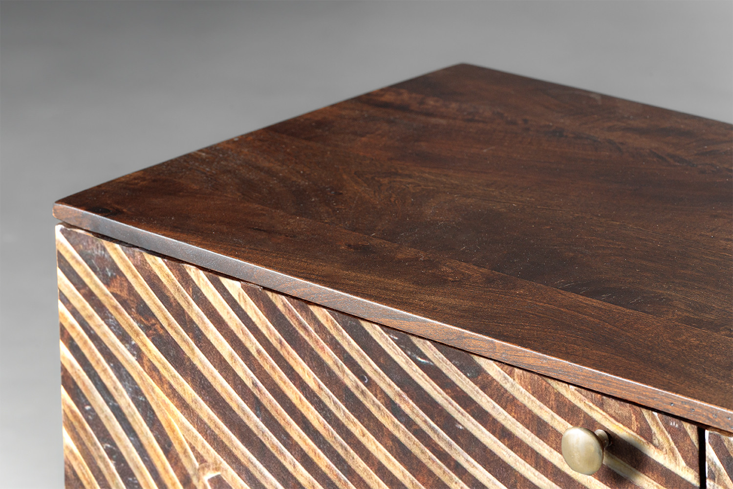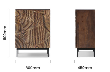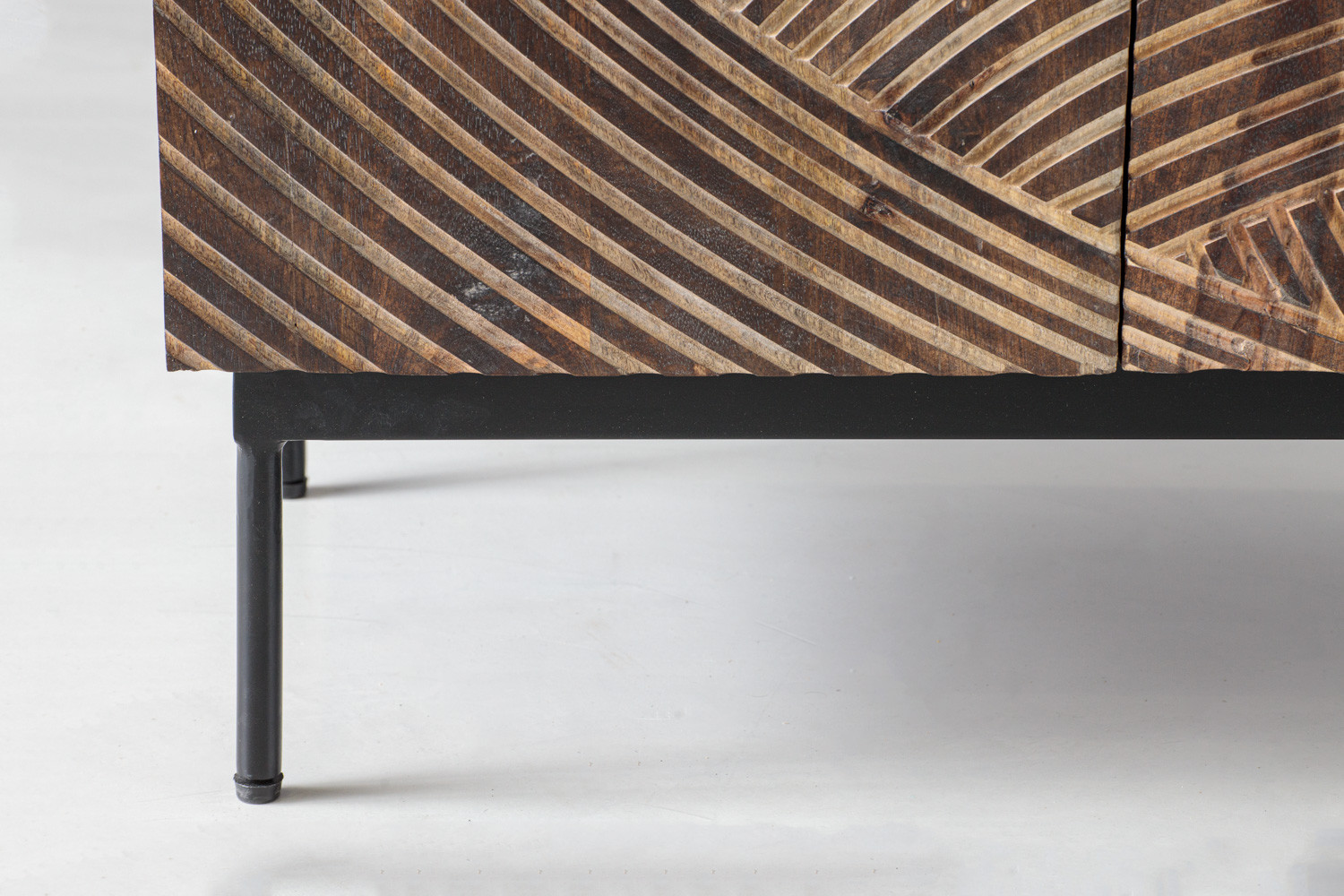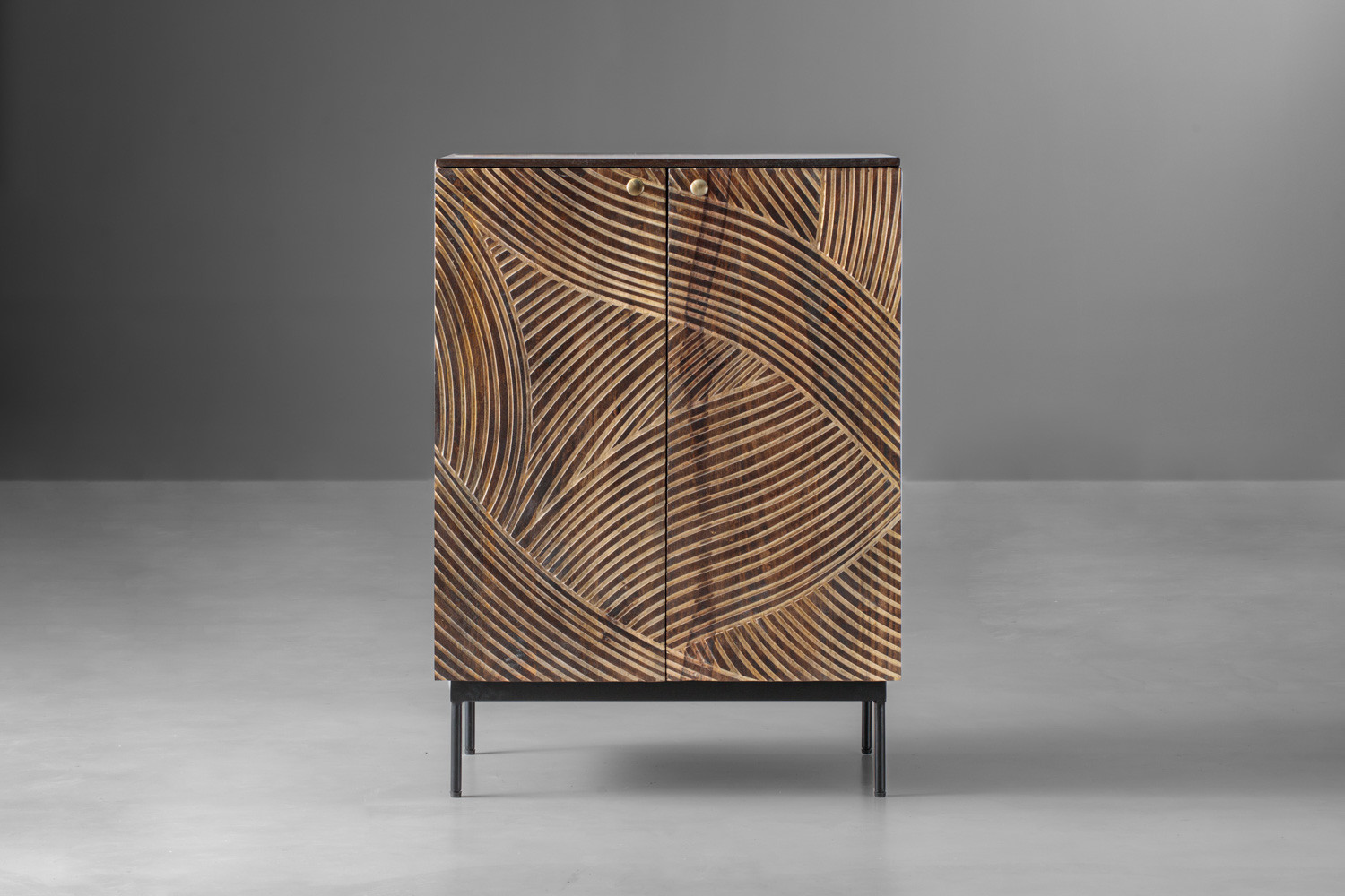 The Dontae Liquor Cabinet is an undeniably elegant piece crafted from solid mango wood. The cabinet features a dynamic wave pattern facade with endless modern appeal. It is designed to store up to nine bottles, combining functionality with artistic allure to make it a must-have for any refined living space.