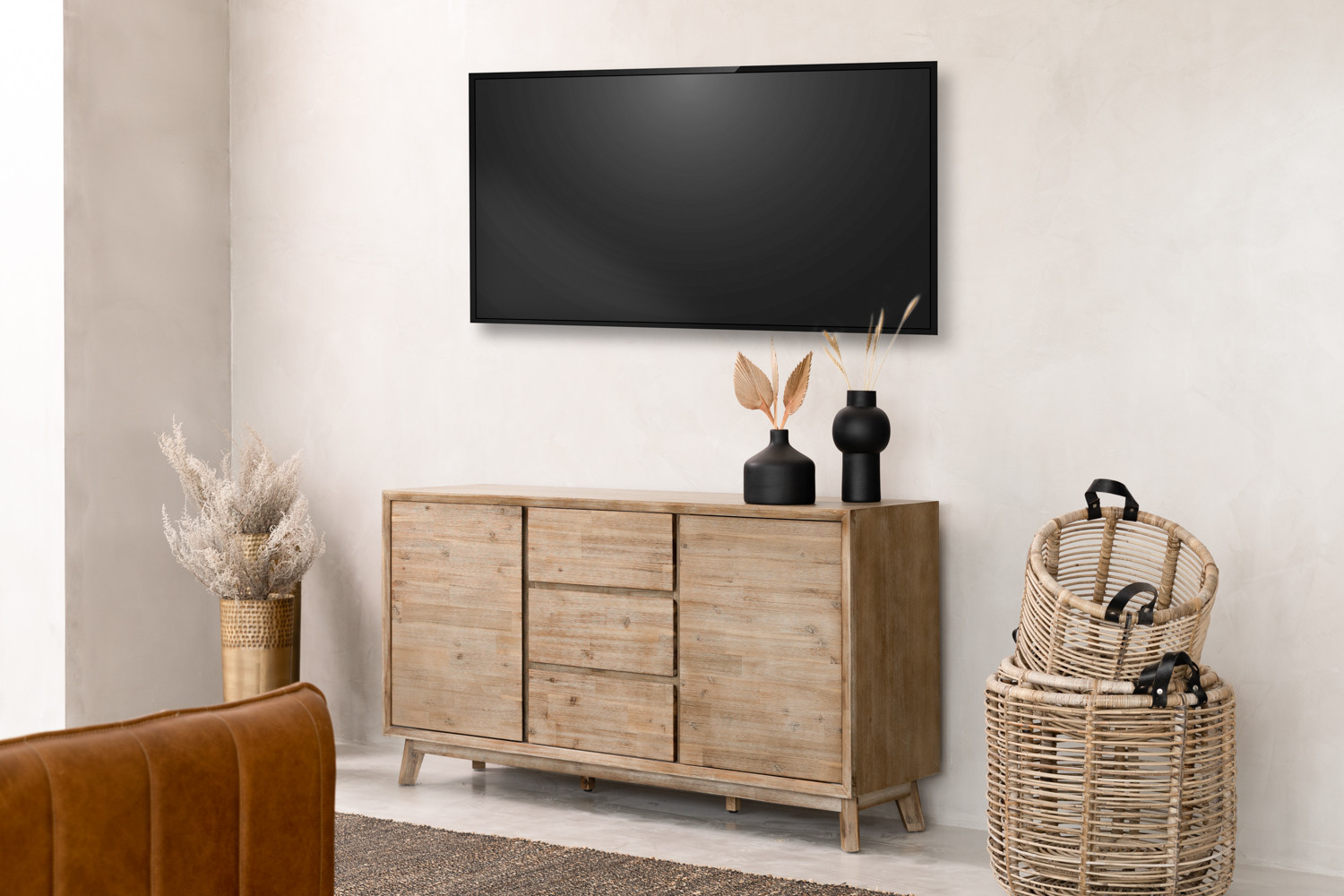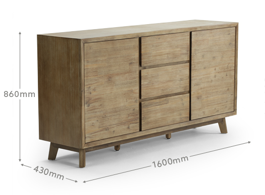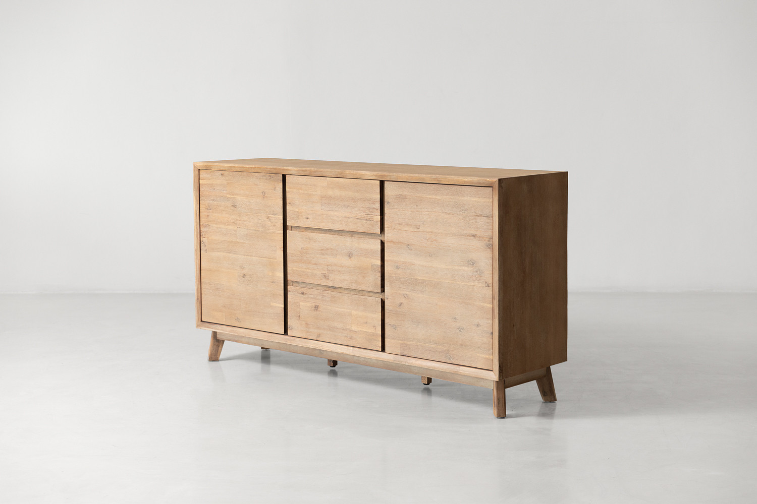 Add a sense of sleek simplicity to your living or dining space with the beautifully crafted Peyton Sideboard. Featuring three drawers and two large cabinets, this versatile piece offers plenty of storage and can work equally well as a TV stand. The sideboard is constructed from high-quality solid Acacia wood – a dense hardwood with exceptional durability – and covered with Acacia wood veneers that provide a superior aesthetic and protect the wood from expanding or splitting due to temperature variance, ensuring it will last for decades. The wire brush technique beautifully enhances the unique grain of this wood and gives it a slightly weathered finish that will hide any accidental scratches (although Acacia is already naturally scratch-resistant).