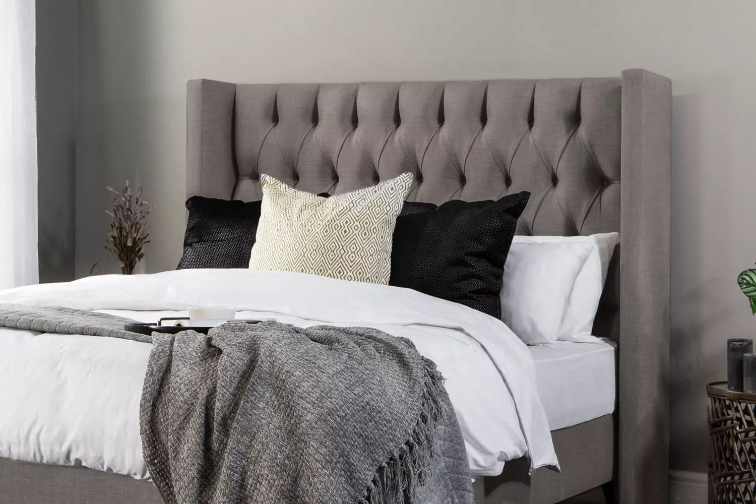 Feel the luxurious embrace of Hailey Headboard, with its full-length wingback style and diamond tufted finish. Upholstered in a choice of high-quality fabrics and classic colours.