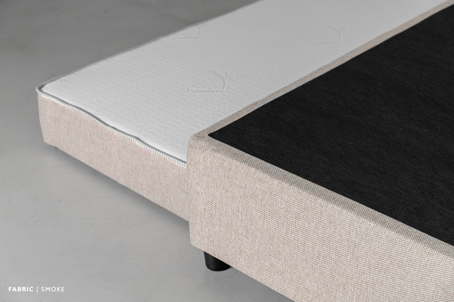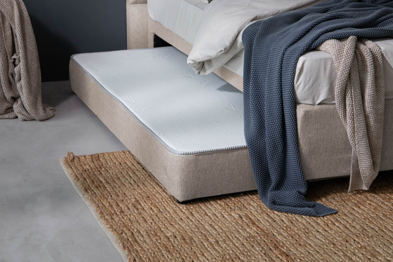 A modern, upholstered bed base with an additional sleek pull-out bed base