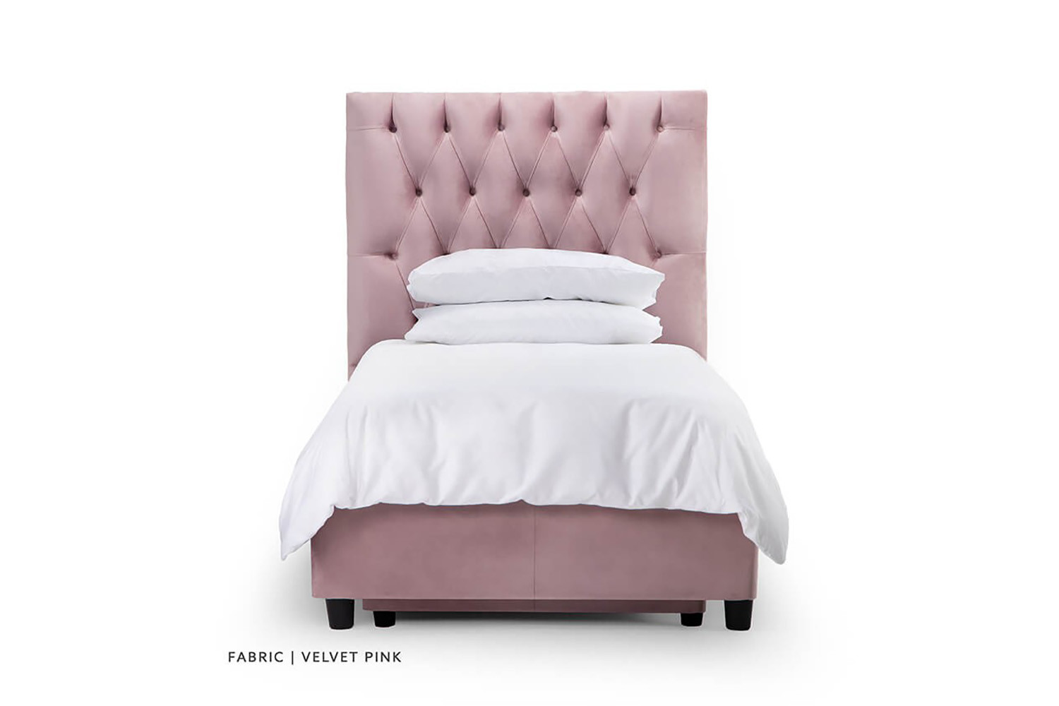 The Skyler stands out for its useful pull-out bed or 'trundle' that fits snuggly within its luxe frame. This extra or second pull-out bed contains a high-density foam mattress, upholstered in matching high-quality fabric.