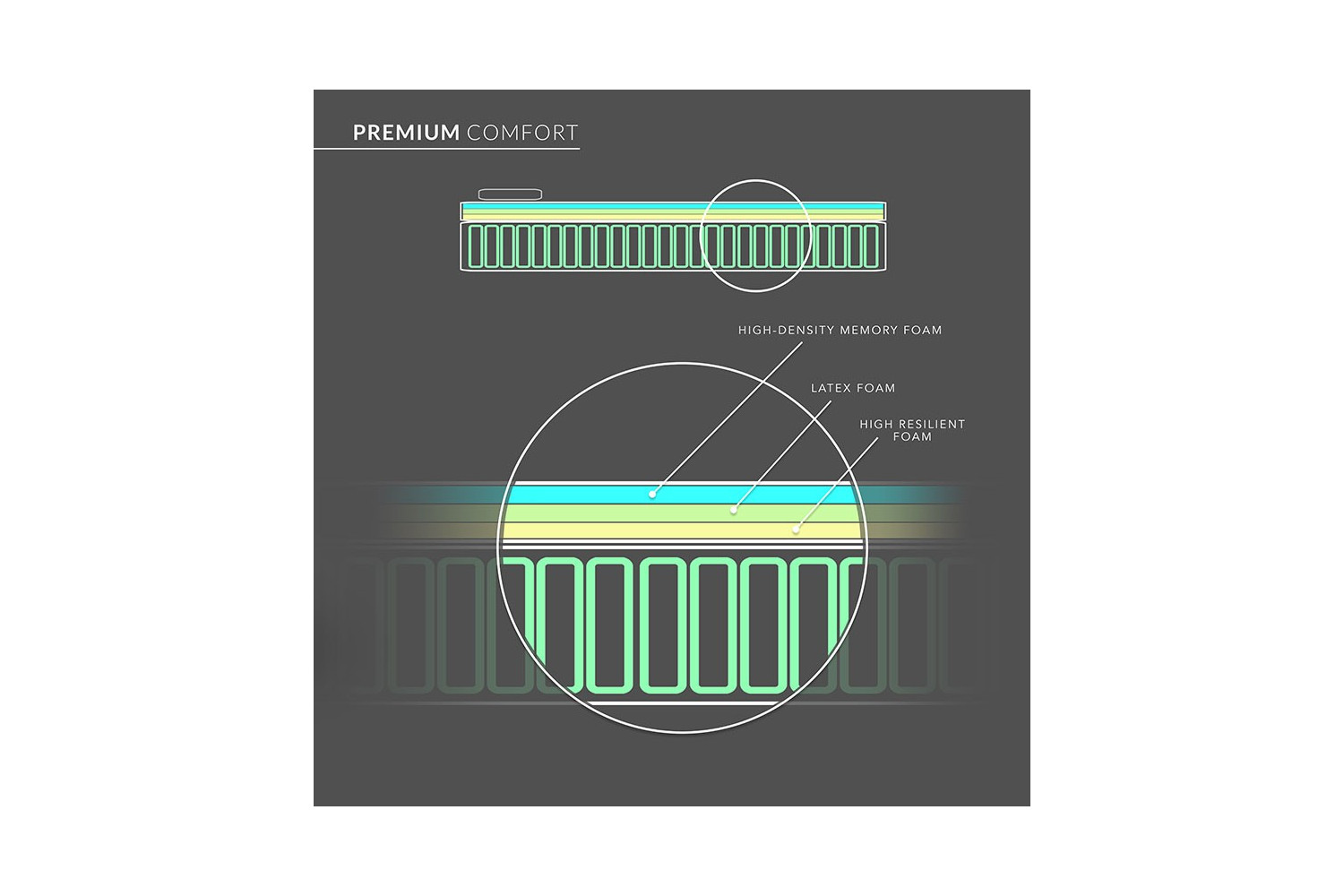 Our Premium Comfort mattress is designed for the ultimate experience of sleeping in comfort, featuring a luxurious Eurotop comprised of layers of high-density memory foam, latex and high resilient foam. With the support of high-quality pocket springs encased in durable foam, you can expect comforting pressure relief in the places you need it most, helping your spine stay correctly aligned as you sleep. At the same time, complete motion isolation ensures you won’t be disturbed by your partner’s movements. The foam-encased spring system has been designed for optimal edge support so you get full use of the entire mattress surface.