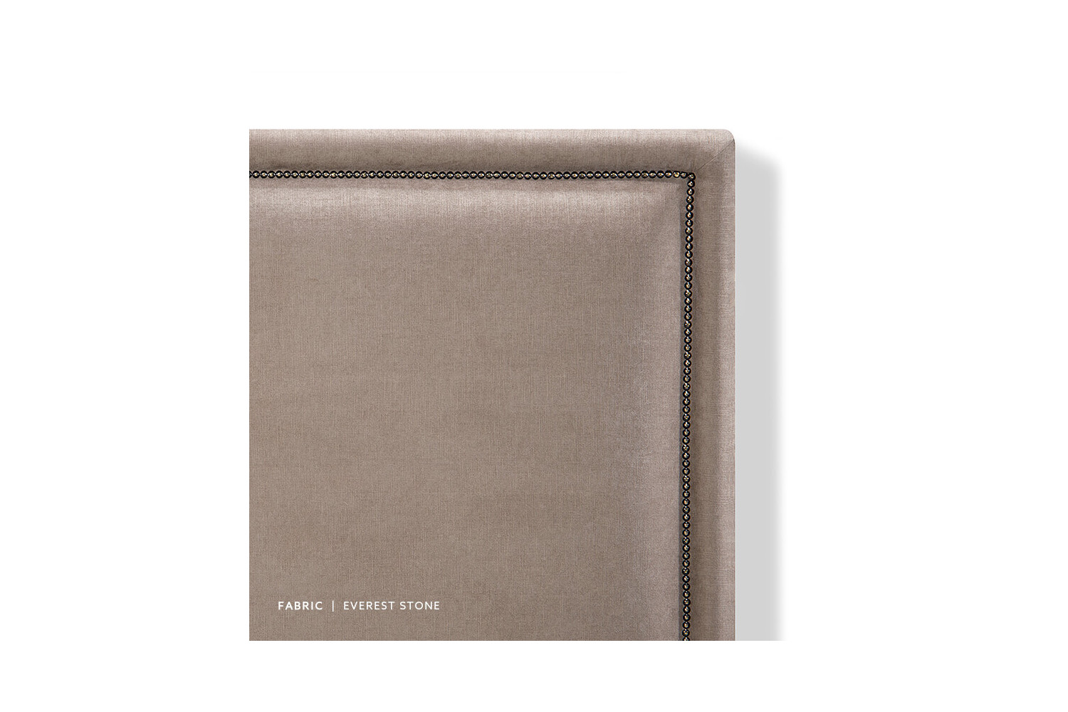 Classic headboard with nail-head trim, upholstered in a variety of high-quality fabrics.