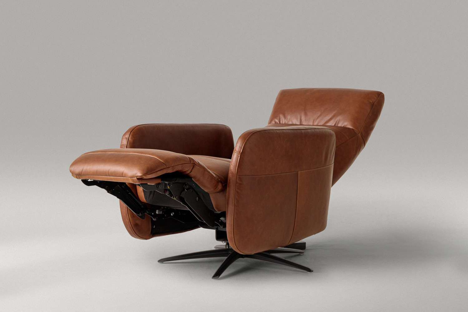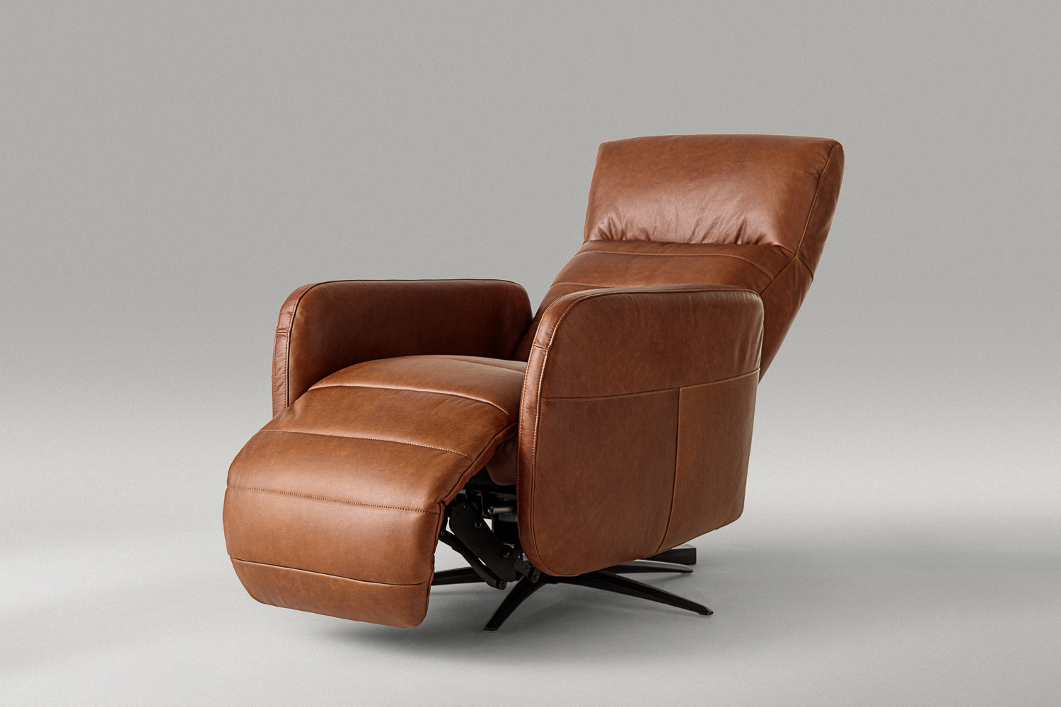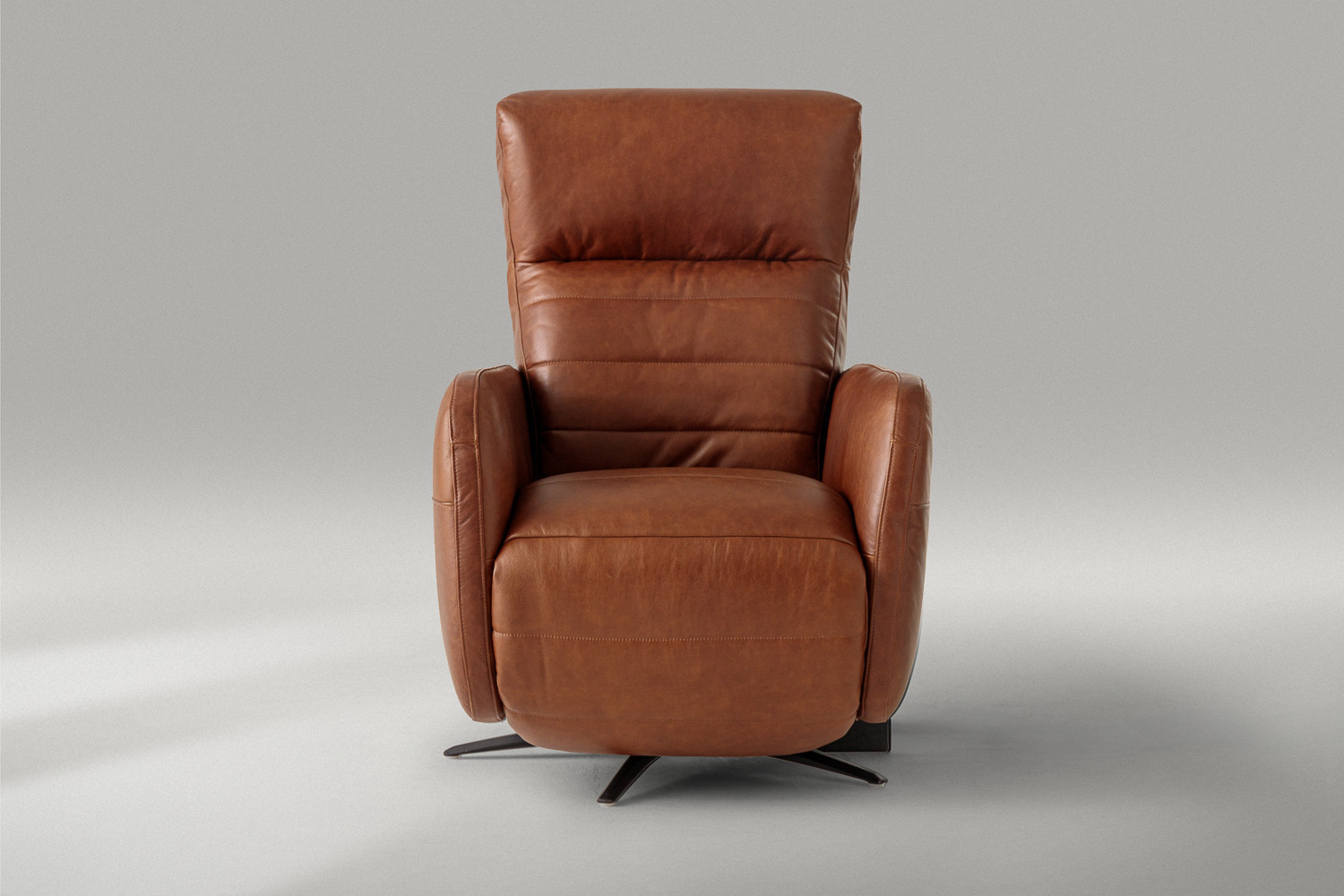 The Dixon Electric Recliner pairs contemporary lines with indulgent comfort. Upholstered in supple full-grain leather in a burnt tan tone, it features a supportive high back, plush channelled cushioning, and padded arms. The smooth electric reclining mechanism lifts the leg rest and lowers the backrest at the touch of a button, while the swivelling star base adds an extra element of relaxation.
