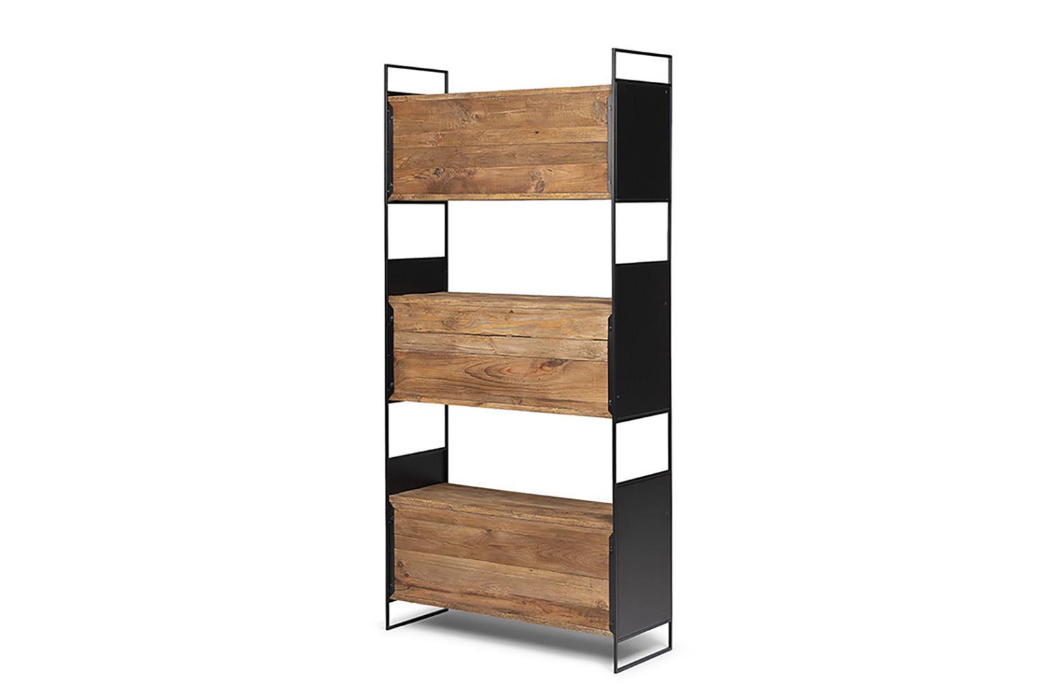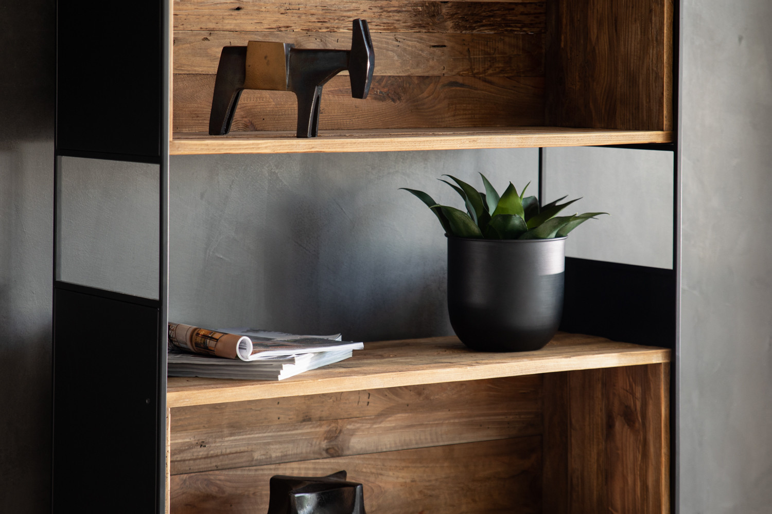 - Rustic reclaimed pine shelves with powder-coated steel frame