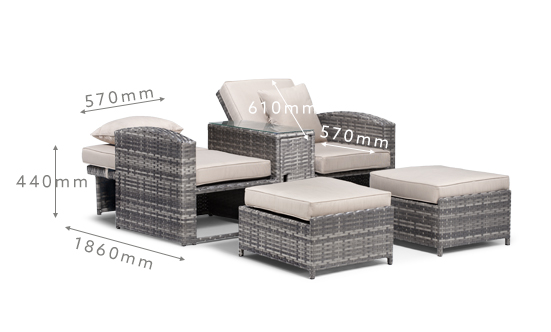 The set is constructed from high-quality weather & UV resistant PE rattan woven over a lightweight aluminium frame, and features high-quality polyester removable cushion covers, ensuring excellent outdoor durability and low maintenance. The generous ottoman-style footrests slide easily under the seats when not in use.